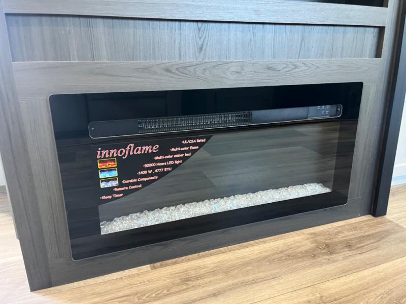 A rear kitchen makes it easy to prepare meals in this travel trailer! The kitchen has a three burner cooktop with a Furrion oven, a 10 cu. ft. 12V refrigerator to keep your perishables fresh, overhead cabinets keep cooking essentials nearby, and a walk-in pantry big enough for all of your snacks and canned goods, plus a hutch for your dishes. You could even prepare meals outside with the campfire café which has a sink, a refrigerator, and a griddle. The bench seat gives you a spot to sit while you put on your shoes and the coat hooks above makes it easy to grab and go. Enjoy your meals and card games at the Sit N' Slide table and relax on the 70" sofa across from the entertainment center with a 40" TV on a swing arm and a frameless electric fireplace. The front private bedroom has a Sleep Tight queen bed to lay your head on at night and a closet with drawers to keep your clothes looking their best!