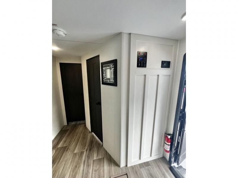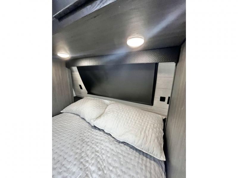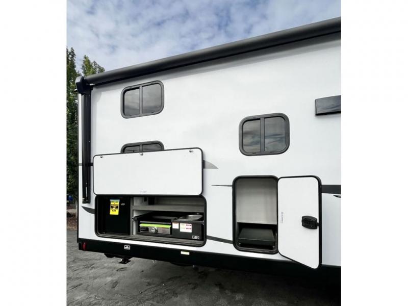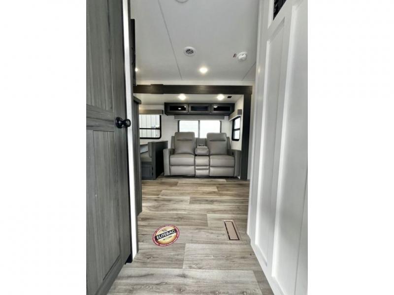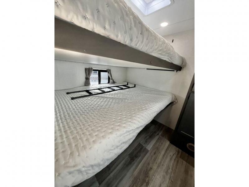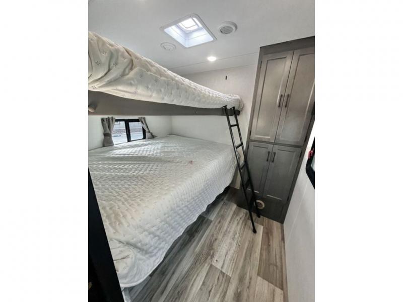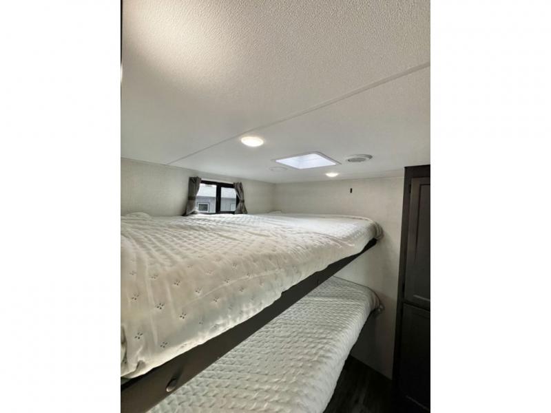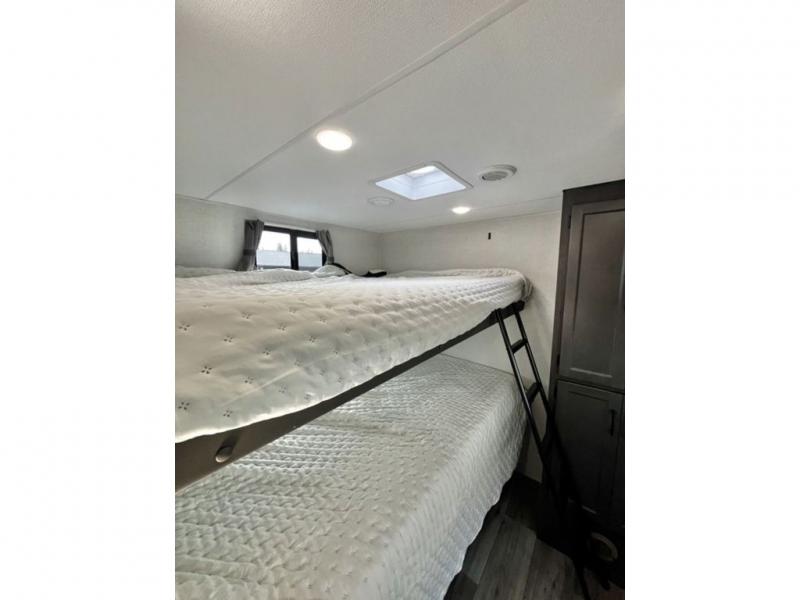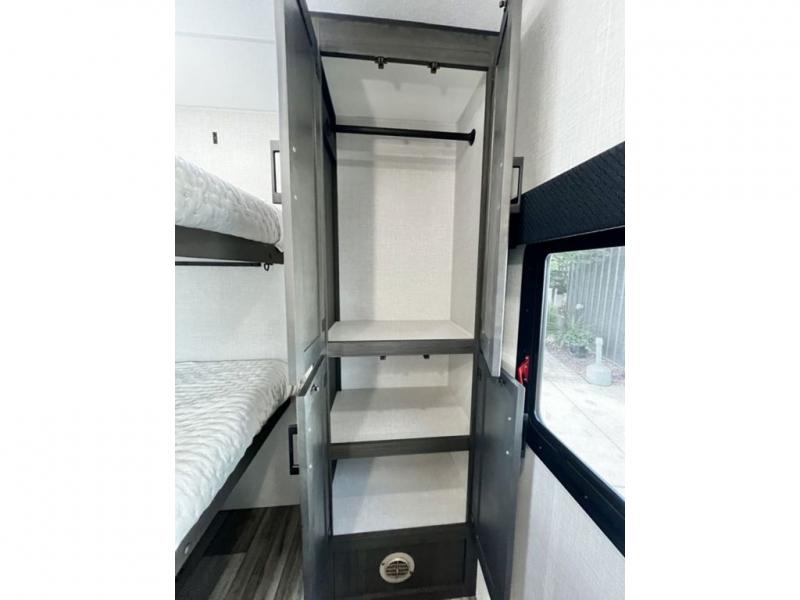 A front master bedroom with a Sleep Tight queen bed is sure to make you feel at home, while your guests take the queen-size bunks in the bunkhouse. There is also a TV mount here if you want to add a television plus a closet to keep clothes wrinkle-free. The large slide out in the main living area houses the 70" sofa and Sit N' Slide table with flipside reversible cushions, and there is a fireplace opposite here for a more cozy feel. There is plenty of storage space, including a walk-in pantry with coat hooks, dual bedside closets to keep clothes organized, and an exterior pass-thru storage for camp gear! A full kitchen inside will let you cook in comfort when the weather isn't cooperating, and an exterior campfire cafe includes an outdoor refrigerator, sink, and griddle for a sunrise breakfast!