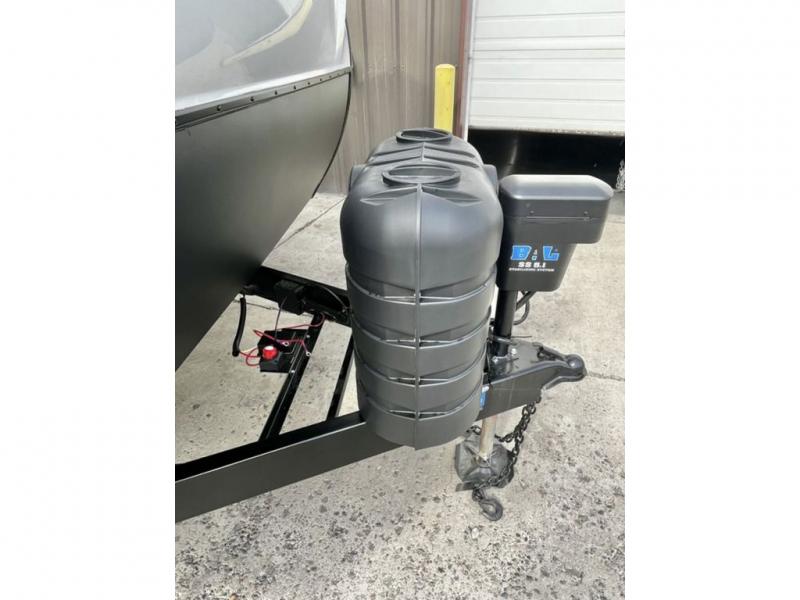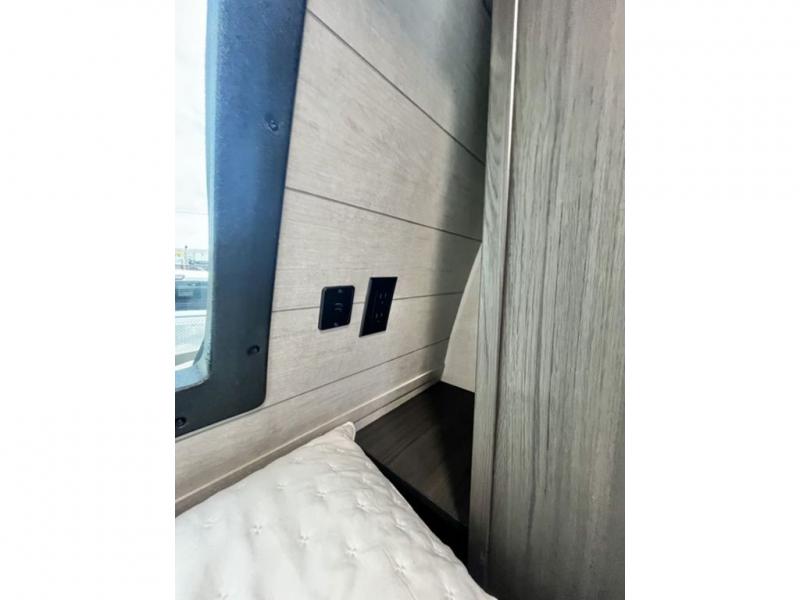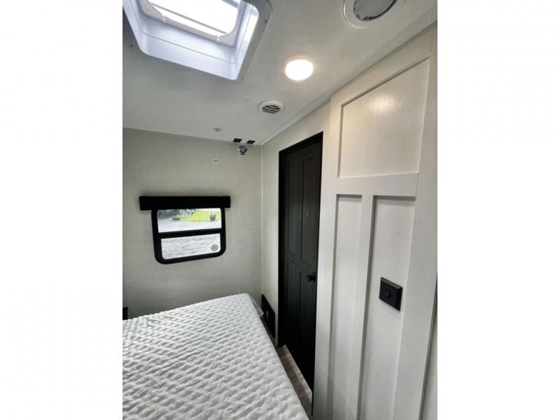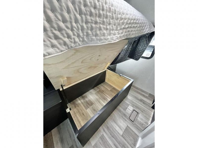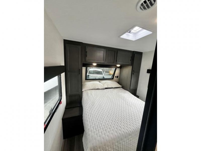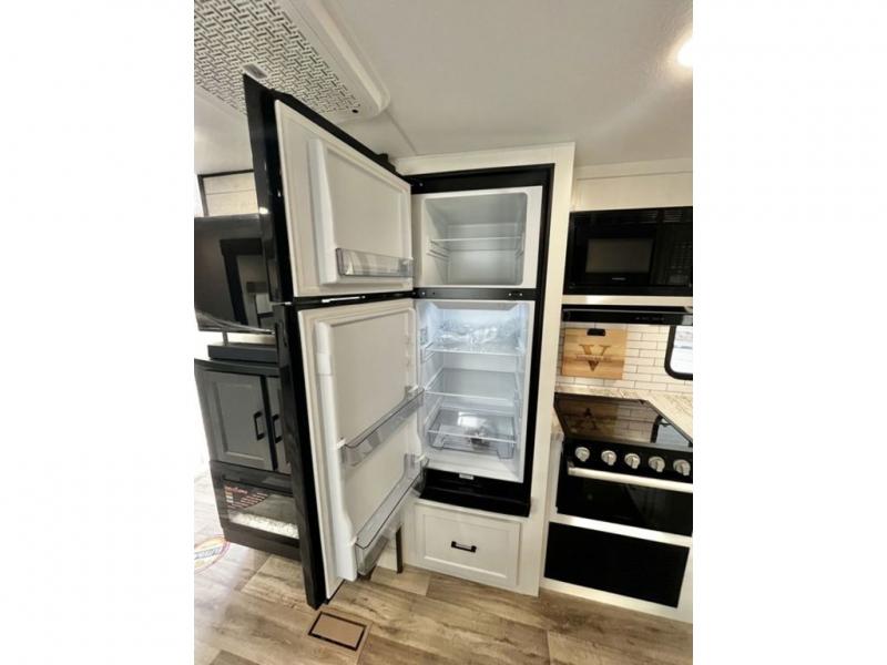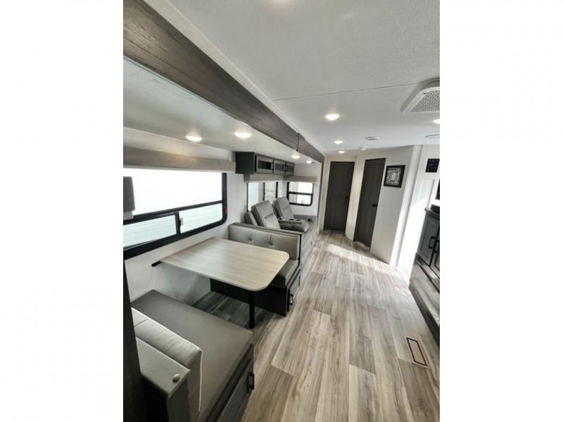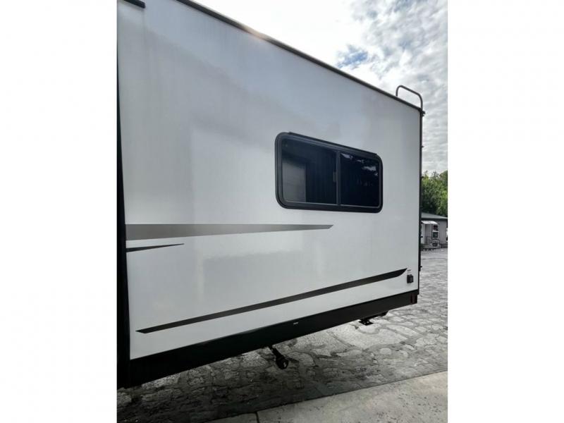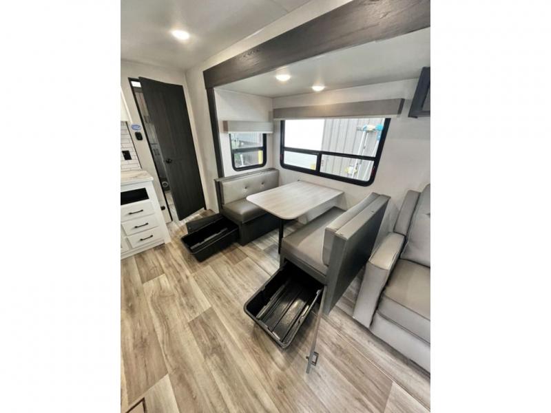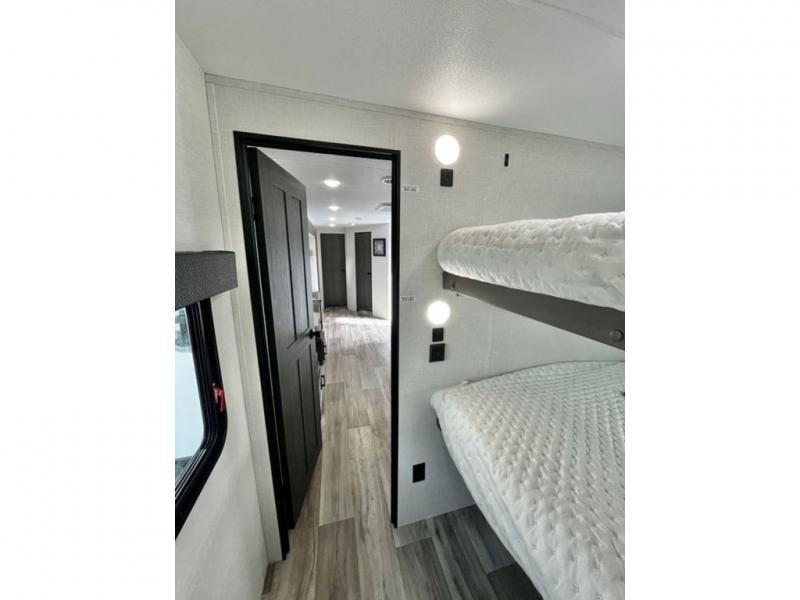 A front master bedroom with a Sleep Tight queen bed is sure to make you feel at home, while your guests take the queen-size bunks in the bunkhouse. There is also a TV mount here if you want to add a television plus a closet to keep clothes wrinkle-free. The large slide out in the main living area houses the 70" sofa and Sit N' Slide table with flipside reversible cushions, and there is a fireplace opposite here for a more cozy feel. There is plenty of storage space, including a walk-in pantry with coat hooks, dual bedside closets to keep clothes organized, and an exterior pass-thru storage for camp gear! A full kitchen inside will let you cook in comfort when the weather isn't cooperating, and an exterior campfire cafe includes an outdoor refrigerator, sink, and griddle for a sunrise breakfast!