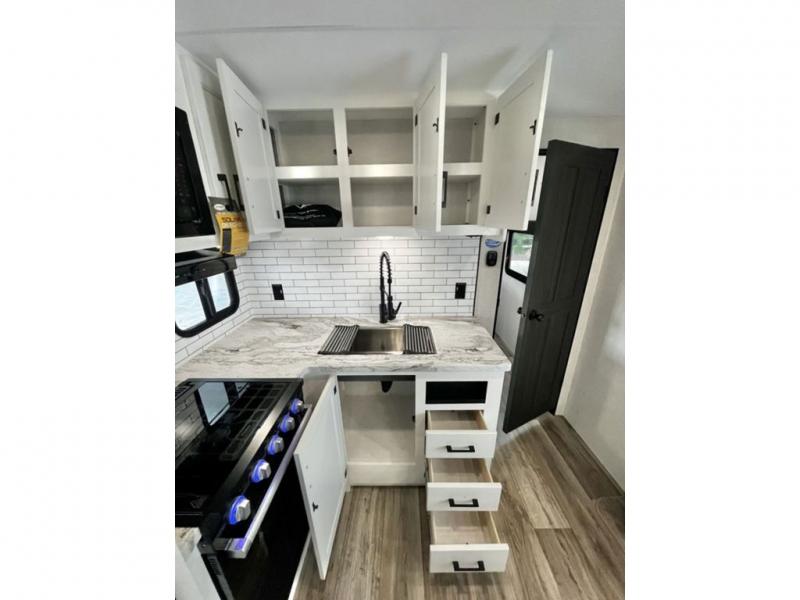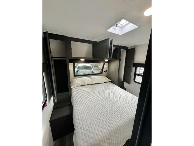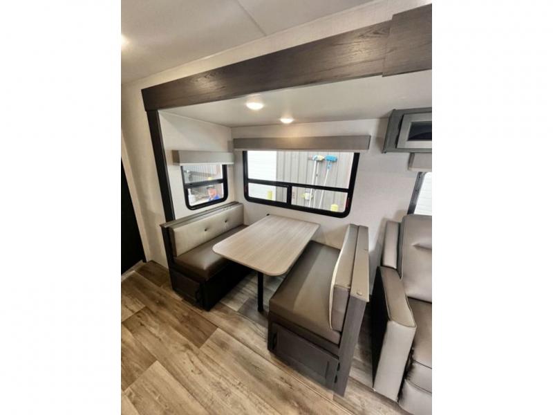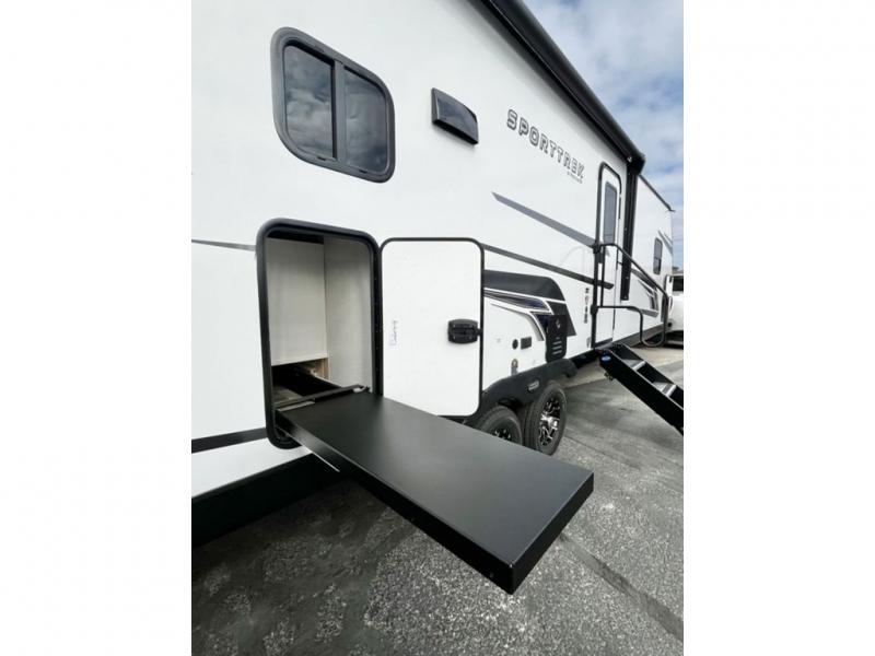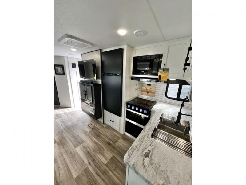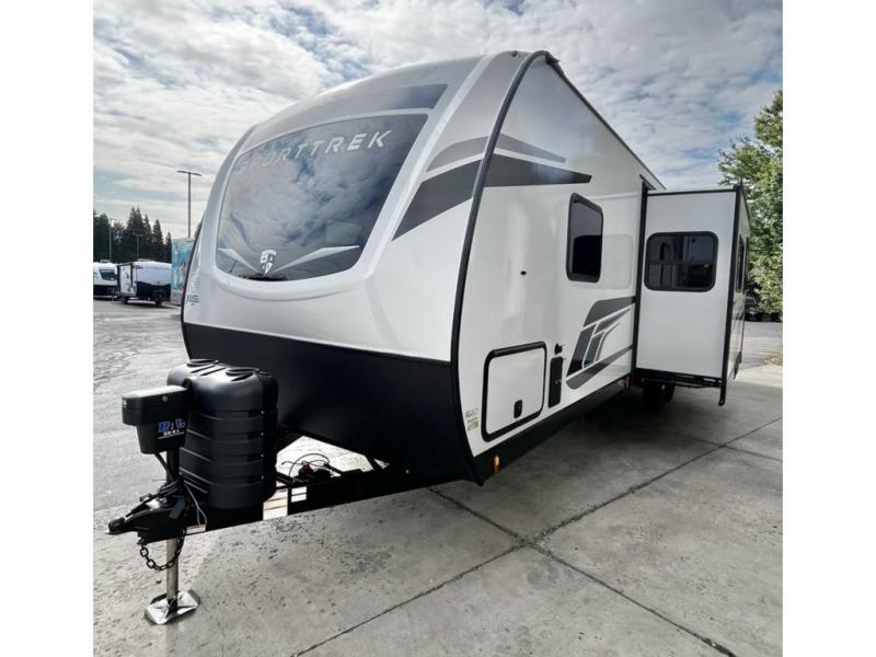 Every Venture RV SportTrek lightweight travel trailer is constructed to offer peace of mind and the comforts of home! Their purposeful residential kitchens are packed with handy features like a Furrion oven and three burner cooktop, a large stainless steel sink with a cover and dish drying rack, plus a 12V refrigerator. You will find plenty of storage throughout, including Safe-Tek hidden storage with a charging center and StorMore nightstands on either side of the bed behind the full-length closets. And the magnetic slam-latch baggage doors and spacious pass-through storage area will hold your outdoor gear in place. They even come with a hot and cold exterior shower and SporTrek's Weather Shield which includes a forced air heated and enclosed underbelly, high output A/C ducting, and more features that will let you extend your camping season. You will also love the new residential upgraded furniture, Serta memory foam mattress, barn style passage doors, and many more comforts!