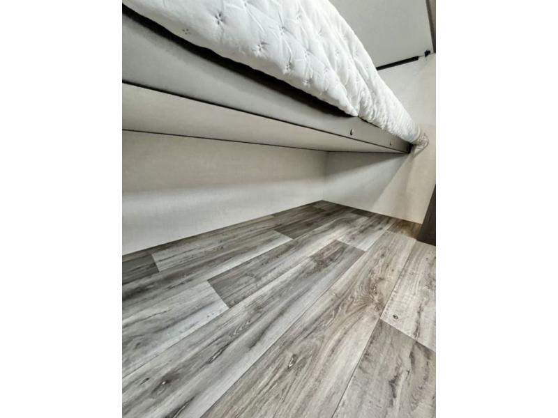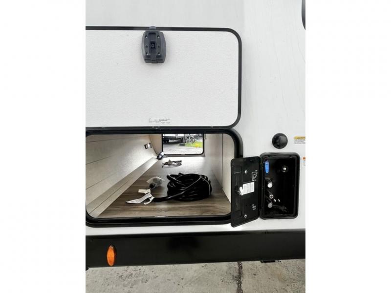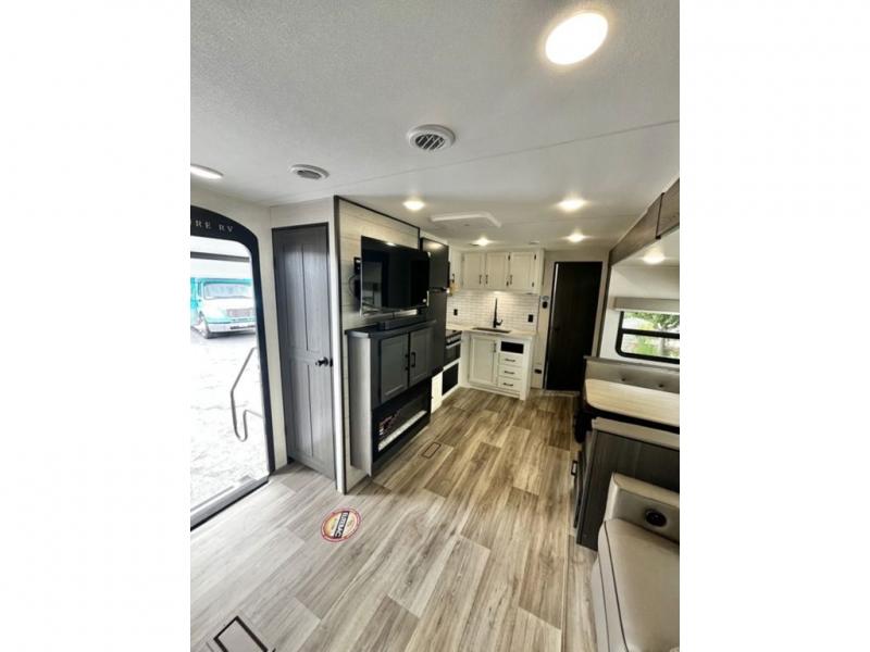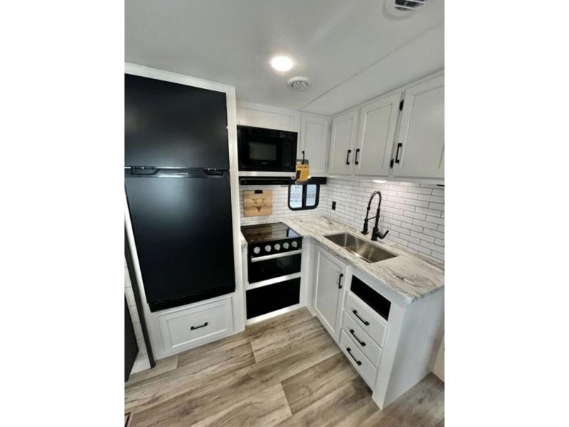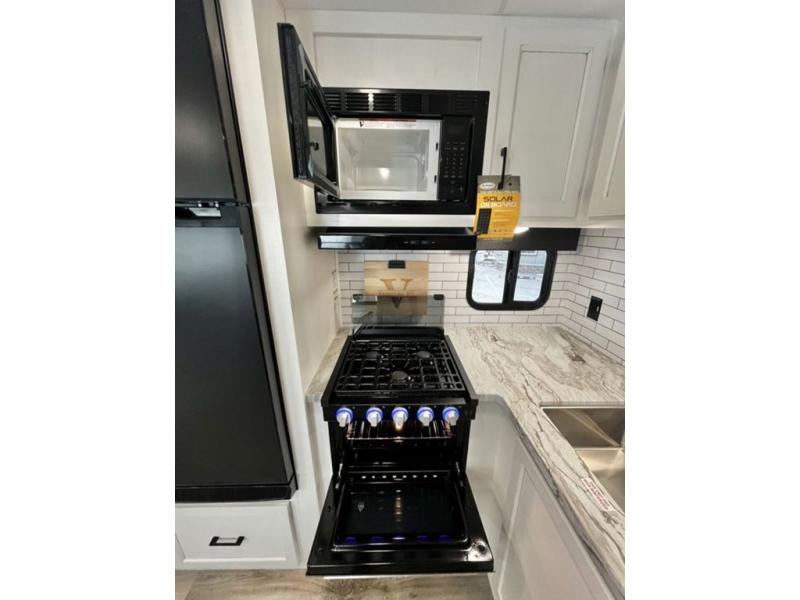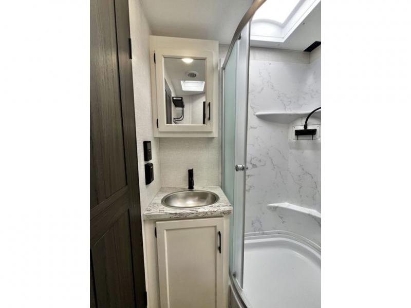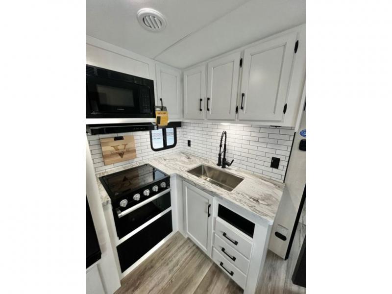 Every Venture RV SportTrek lightweight travel trailer is constructed to offer peace of mind and the comforts of home! Their purposeful residential kitchens are packed with handy features like a Furrion oven and three burner cooktop, a large stainless steel sink with a cover and dish drying rack, plus a 12V refrigerator. You will find plenty of storage throughout, including Safe-Tek hidden storage with a charging center and StorMore nightstands on either side of the bed behind the full-length closets. And the magnetic slam-latch baggage doors and spacious pass-through storage area will hold your outdoor gear in place. They even come with a hot and cold exterior shower and SporTrek's Weather Shield which includes a forced air heated and enclosed underbelly, high output A/C ducting, and more features that will let you extend your camping season. You will also love the new residential upgraded furniture, Serta memory foam mattress, barn style passage doors, and many more comforts!
