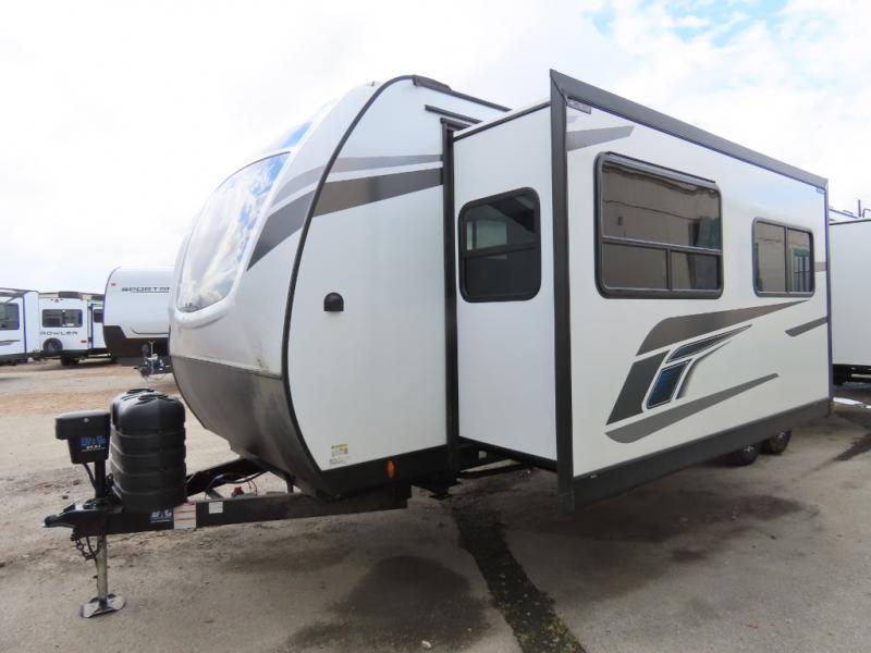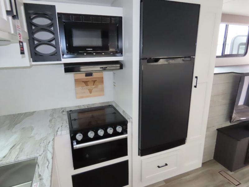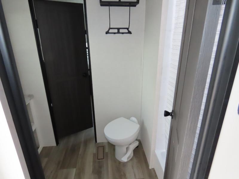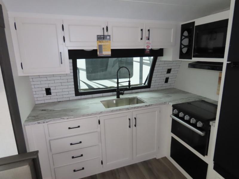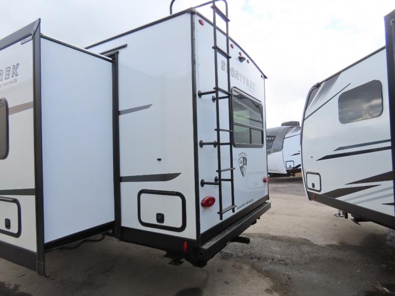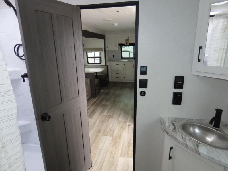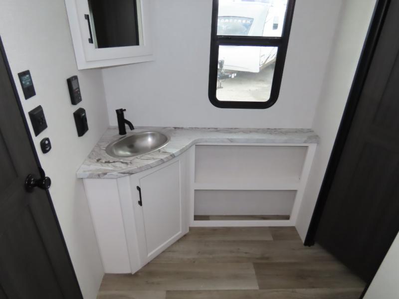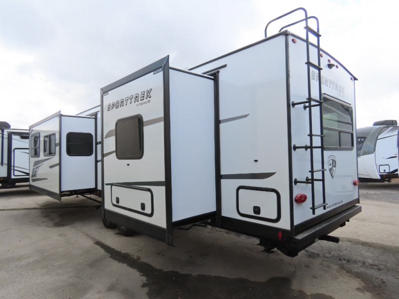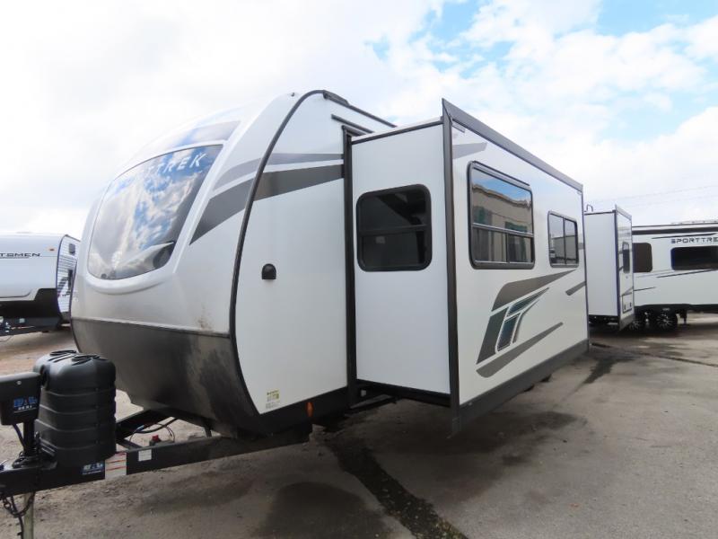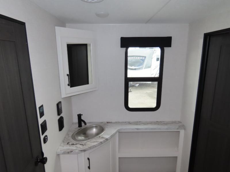 Every Venture RV SportTrek lightweight travel trailer is constructed to offer peace of mind and the comforts of home! Their purposeful residential kitchens are packed with handy features like a Furrion oven and three burner cooktop, a large stainless steel sink with a cover and dish drying rack, plus a 12V refrigerator. You will find plenty of storage throughout, including Safe-Tek hidden storage with a charging center and StorMore nightstands on either side of the bed behind the full-length closets. And the magnetic slam-latch baggage doors and spacious pass-through storage area will hold your outdoor gear in place. They even come with a hot and cold exterior shower and SporTrek's Weather Shield which includes a forced air heated and enclosed underbelly, high output A/C ducting, and more features that will let you extend your camping season. You will also love the new residential upgraded furniture, Serta memory foam mattress, barn style passage doors, and many more comforts!