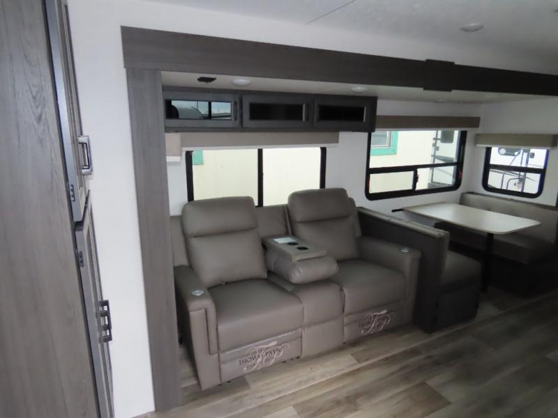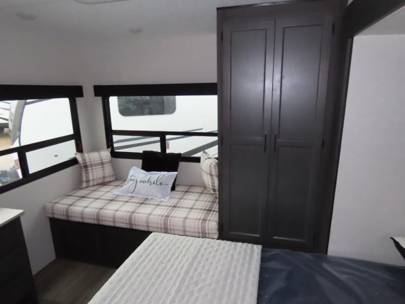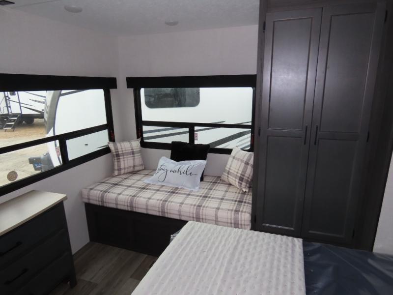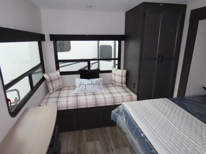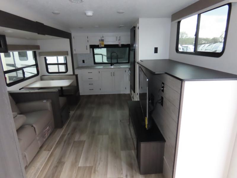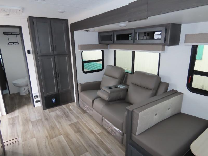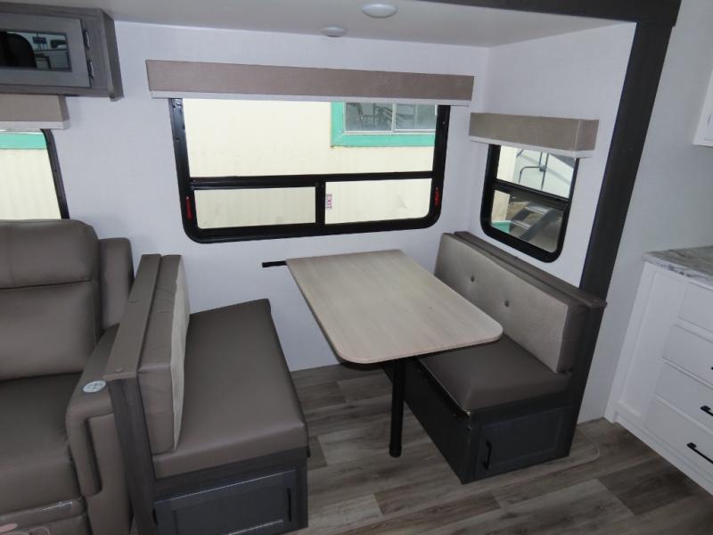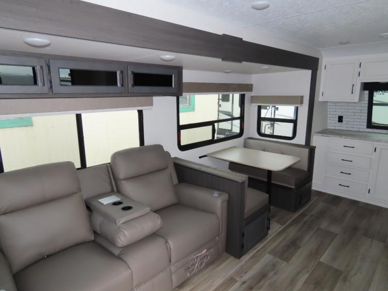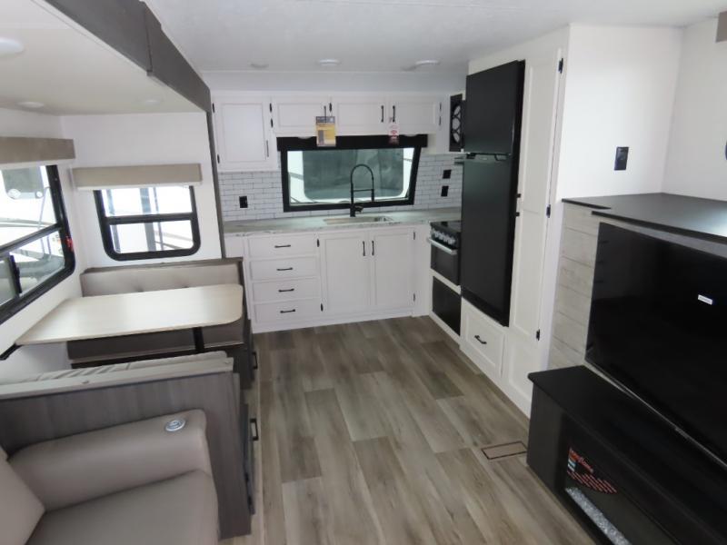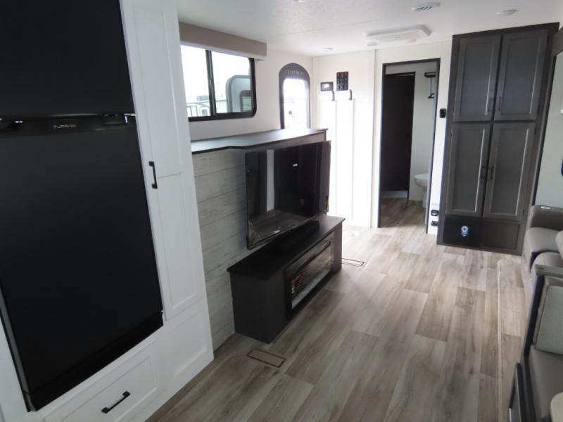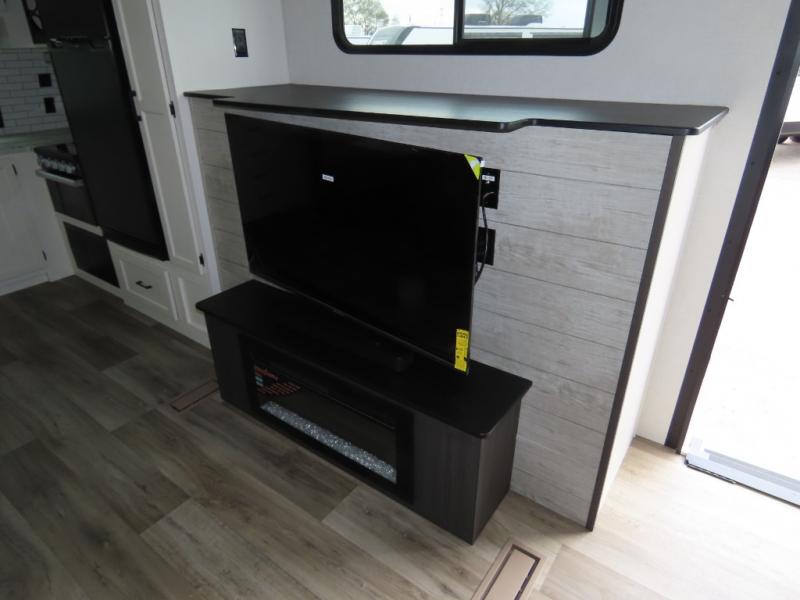 A front kitchen in this travel trailer provides more interior space! Once you have prepared your best meals with the Furrion oven and three burner cooktop, you can head to the Sit N' Slide table with flipside reversible cushions to dine. The 70" sofa also offers a comfortable place to take an afternoon nap or sit while enjoying the entertainment center with a frameless electric fireplace and 40" TV on a swing arm. A walk-thru bath makes it easy for all to enter and has a 30" x 36" shower to freshen up in each morning. The rear private bedroom has a Sleep Tight queen bed slide for a good night's rest, a dresser, two wardrobes, and a bench seat where you sit to put your hiking boots on. You'll also find one of the dual entry doors here for added convenience!