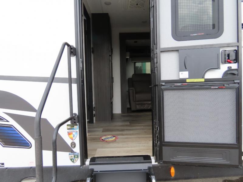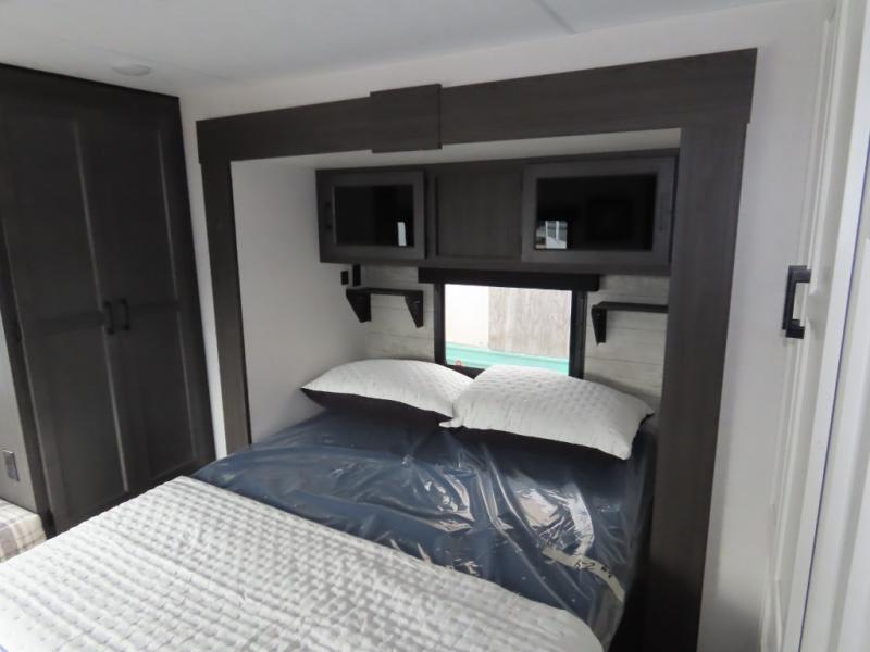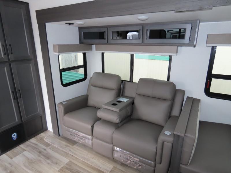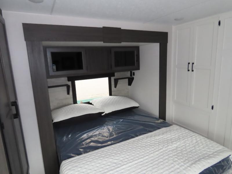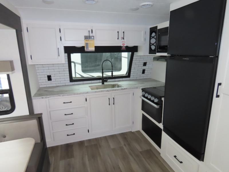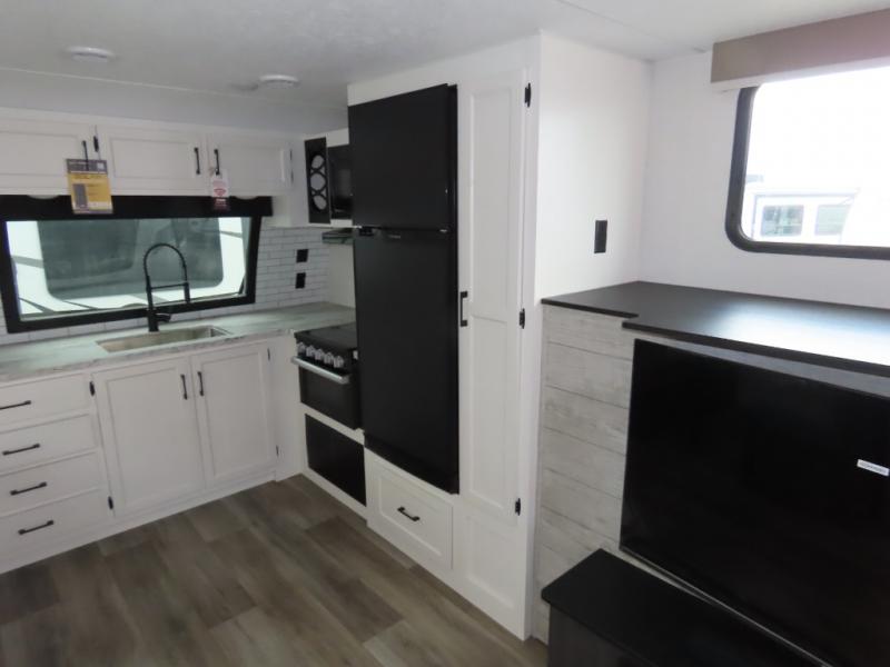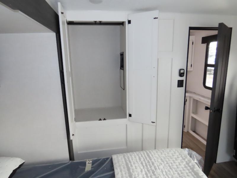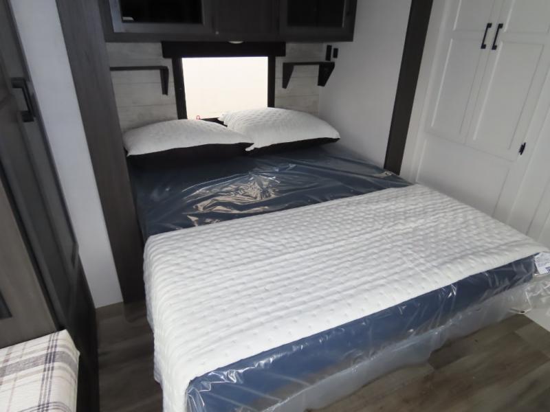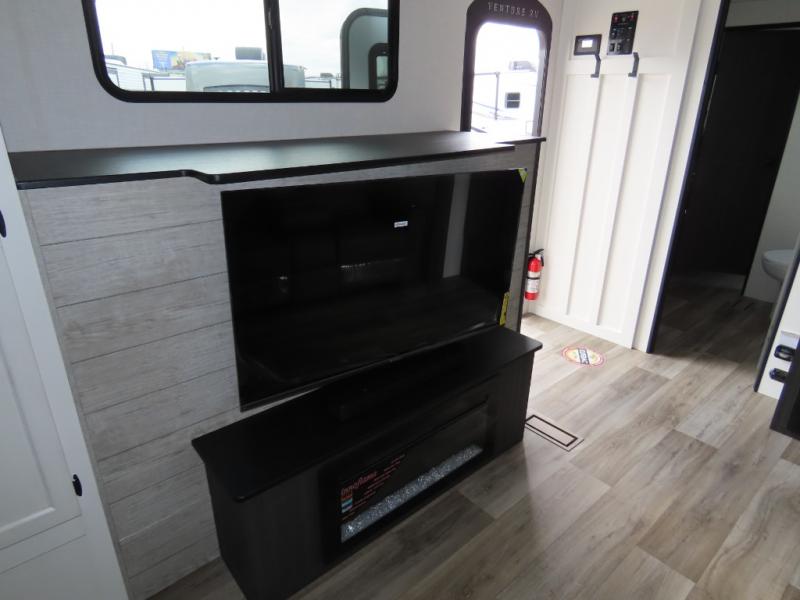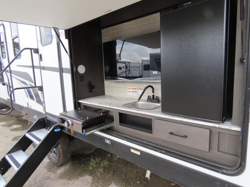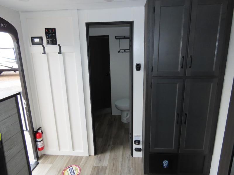 A front kitchen in this travel trailer provides more interior space! Once you have prepared your best meals with the Furrion oven and three burner cooktop, you can head to the Sit N' Slide table with flipside reversible cushions to dine. The 70" sofa also offers a comfortable place to take an afternoon nap or sit while enjoying the entertainment center with a frameless electric fireplace and 40" TV on a swing arm. A walk-thru bath makes it easy for all to enter and has a 30" x 36" shower to freshen up in each morning. The rear private bedroom has a Sleep Tight queen bed slide for a good night's rest, a dresser, two wardrobes, and a bench seat where you sit to put your hiking boots on. You'll also find one of the dual entry doors here for added convenience!