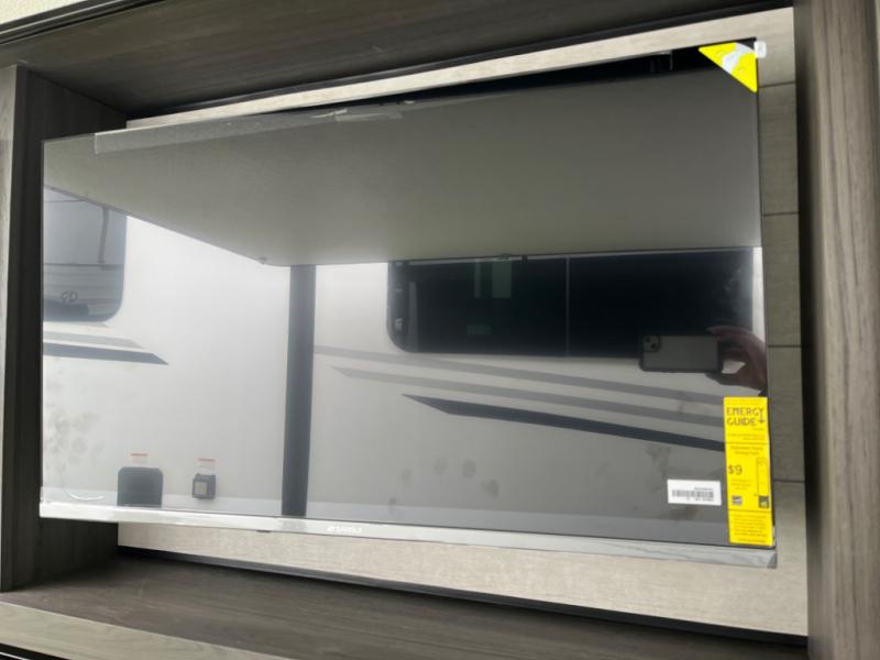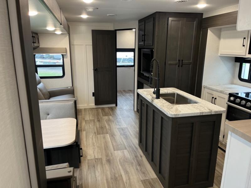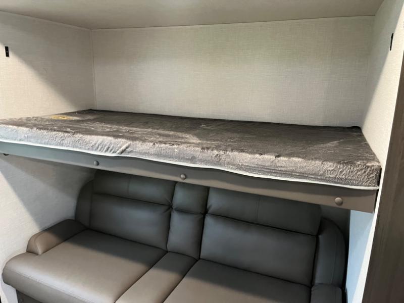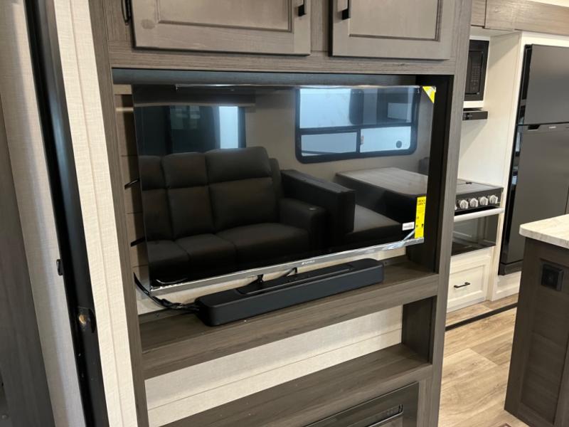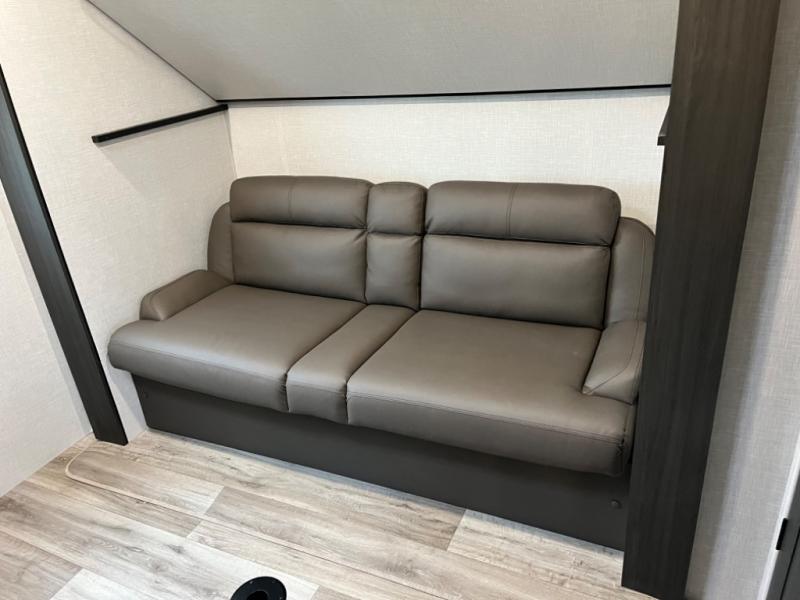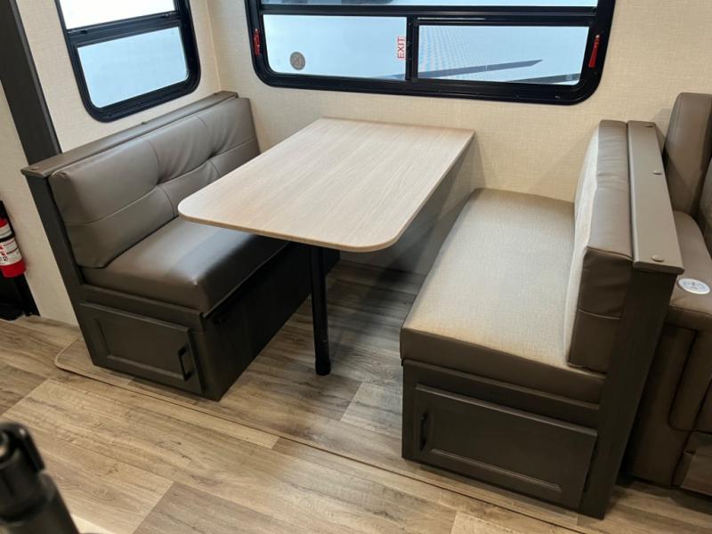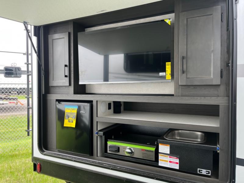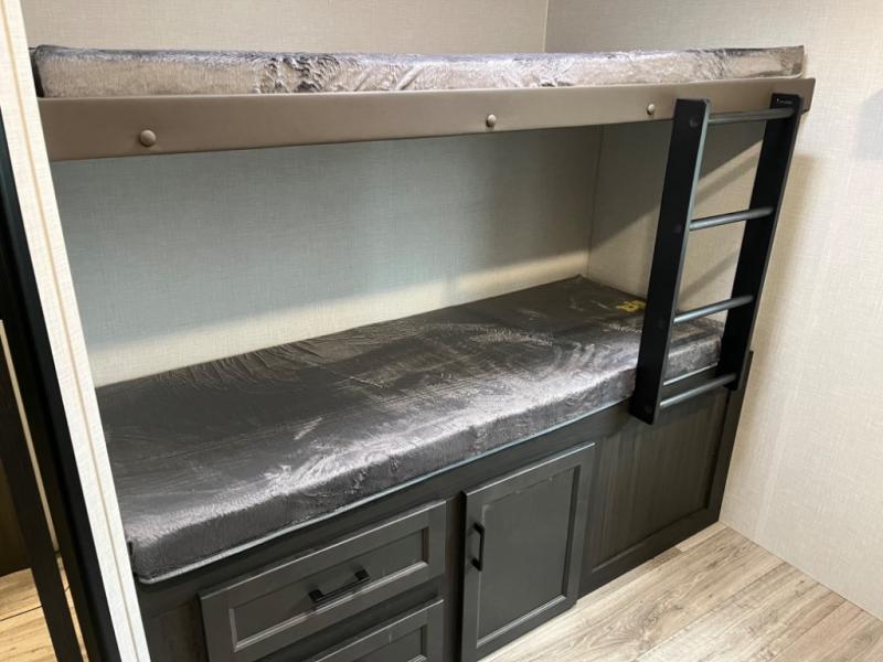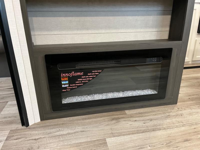 Stay protected rain or shine with the two 10' legless awnings with wind sensors on this travel trailer! Some other exterior features you will enjoy include a campfire café with a 40" TV to watch the big game while you grill steaks on the griddle, and the pass-through storage area with slam latch baggage doors will keep your gear in place. Inside, there is a rear private bunkhouse with a closet, a 32" x 70" flip-up bunk above a 70" sofa with a table, and a 28" x 70" bunk above a 40" x 70" bottom bunk. The living area has a sofa across from an entertainment center with a frameless fireplace and a 40" TV with a swing arm so others can watch it from the Sit N' Slide table. The dual entry bathroom has a 34" radius shower to freshen up in, and is easy to access, especially those staying in the front private bedroom!