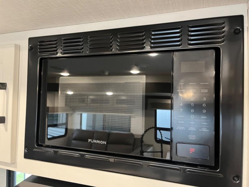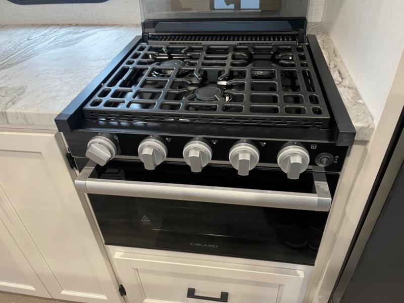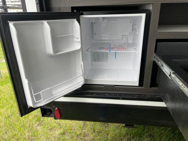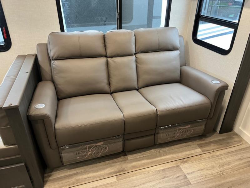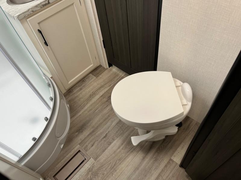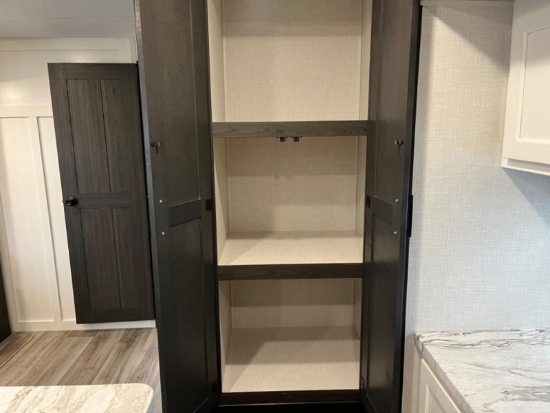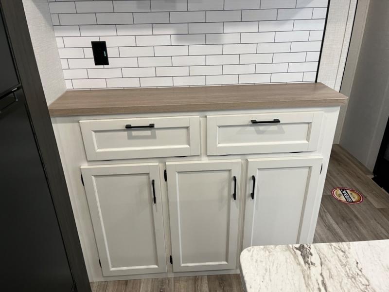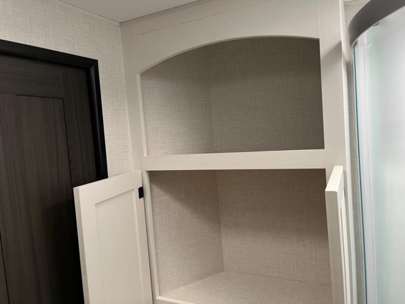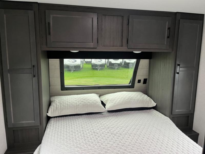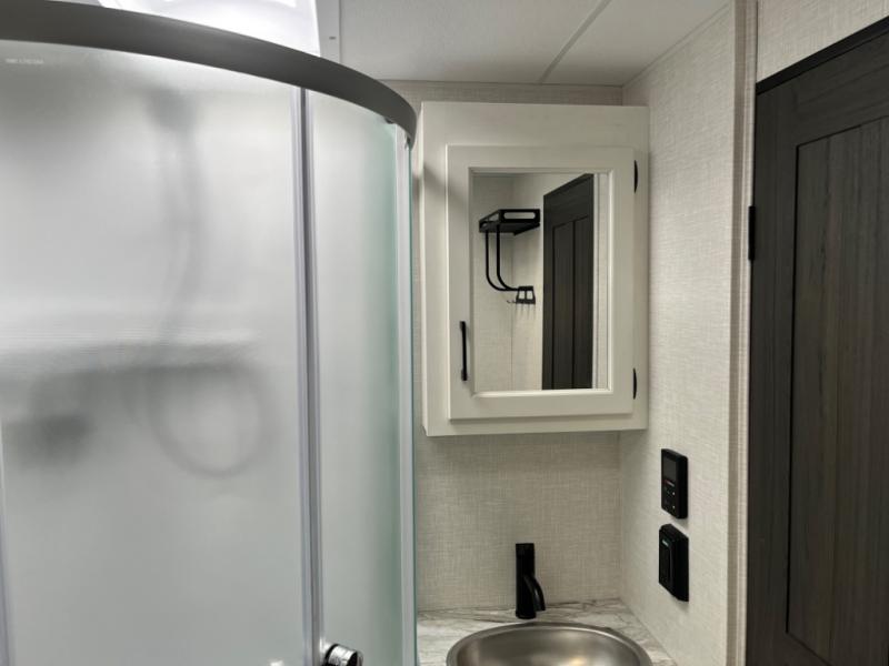 Stay protected rain or shine with the two 10' legless awnings with wind sensors on this travel trailer! Some other exterior features you will enjoy include a campfire café with a 40" TV to watch the big game while you grill steaks on the griddle, and the pass-through storage area with slam latch baggage doors will keep your gear in place. Inside, there is a rear private bunkhouse with a closet, a 32" x 70" flip-up bunk above a 70" sofa with a table, and a 28" x 70" bunk above a 40" x 70" bottom bunk. The living area has a sofa across from an entertainment center with a frameless fireplace and a 40" TV with a swing arm so others can watch it from the Sit N' Slide table. The dual entry bathroom has a 34" radius shower to freshen up in, and is easy to access, especially those staying in the front private bedroom!