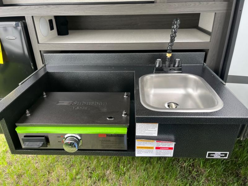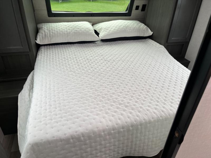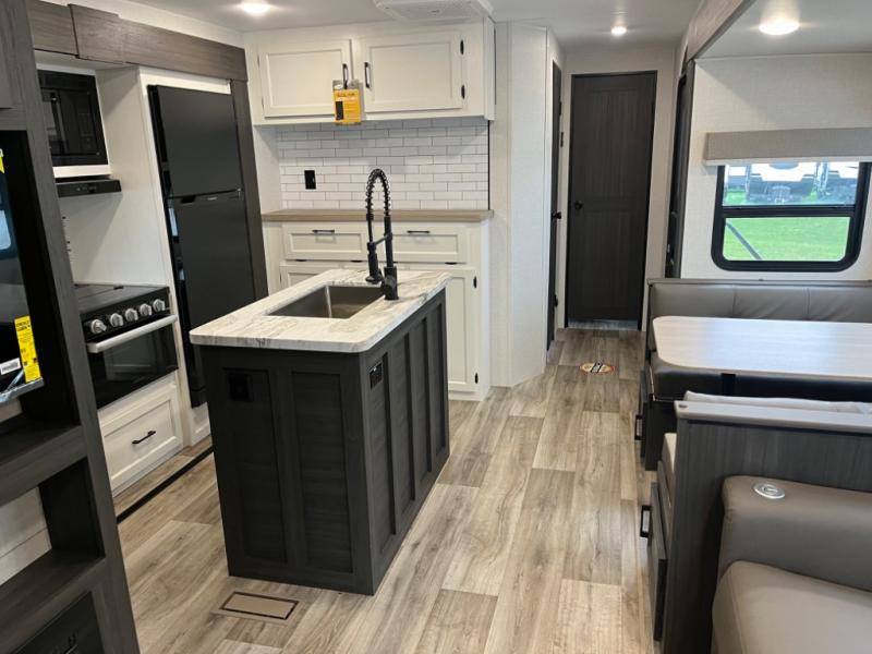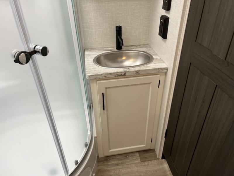 Every Venture RV SportTrek lightweight travel trailer is constructed to offer peace of mind and the comforts of home! Their purposeful residential kitchens are packed with handy features like a Furrion oven and three burner cooktop, a large stainless steel sink with a cover and dish drying rack, plus a 12V refrigerator. You will find plenty of storage throughout, including Safe-Tek hidden storage with a charging center and StorMore nightstands on either side of the bed behind the full-length closets. And the magnetic slam-latch baggage doors and spacious pass-through storage area will hold your outdoor gear in place. They even come with a hot and cold exterior shower and SporTrek's Weather Shield which includes a forced air heated and enclosed underbelly, high output A/C ducting, and more features that will let you extend your camping season. You will also love the new residential upgraded furniture, Serta memory foam mattress, barn style passage doors, and many more comforts!