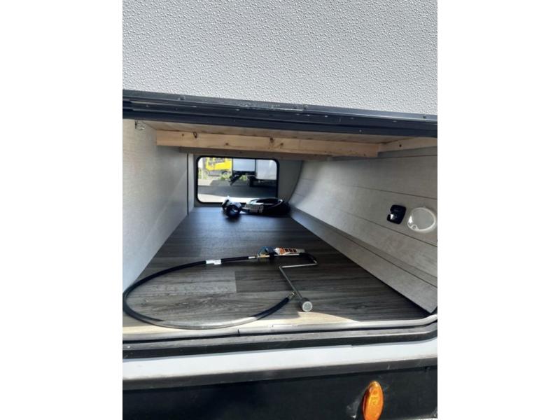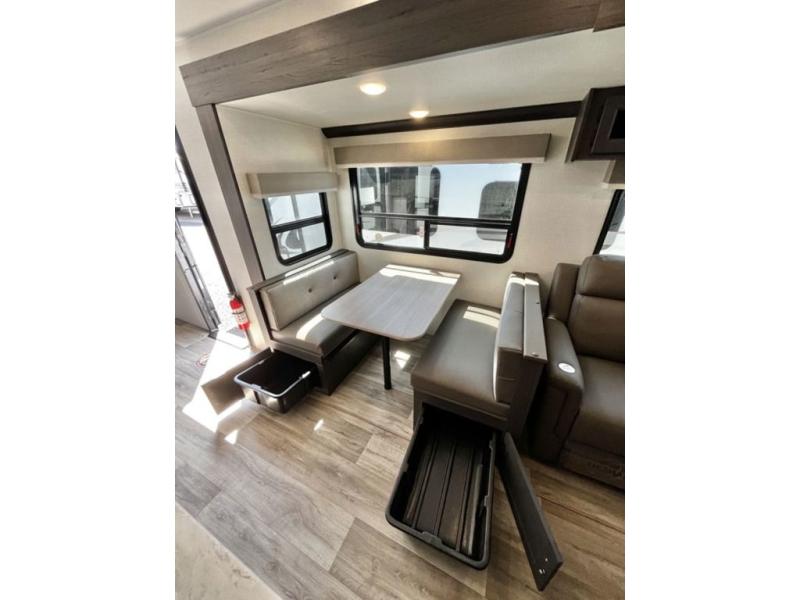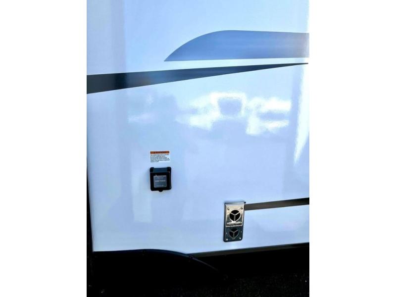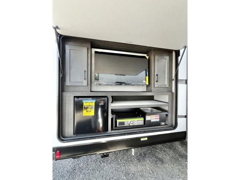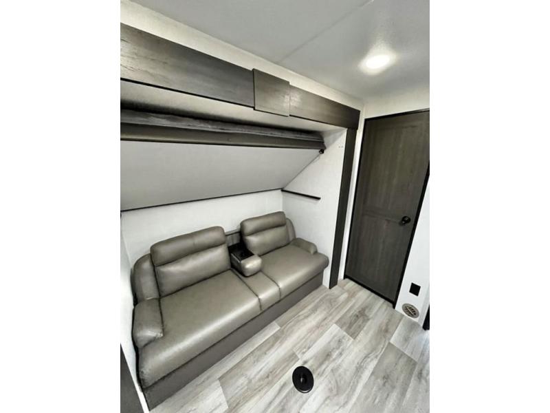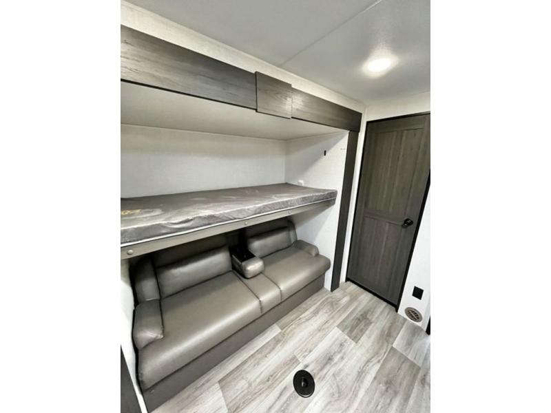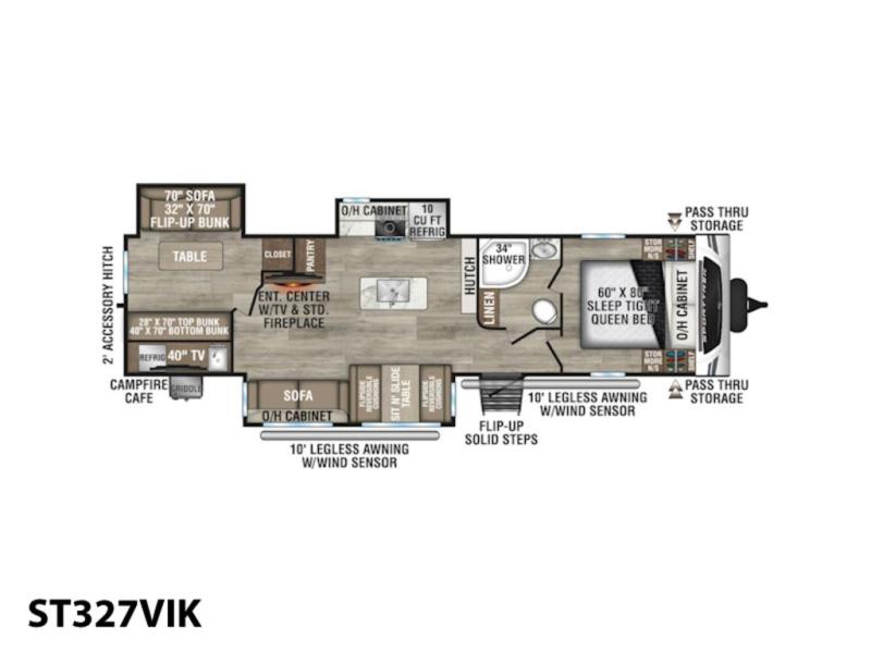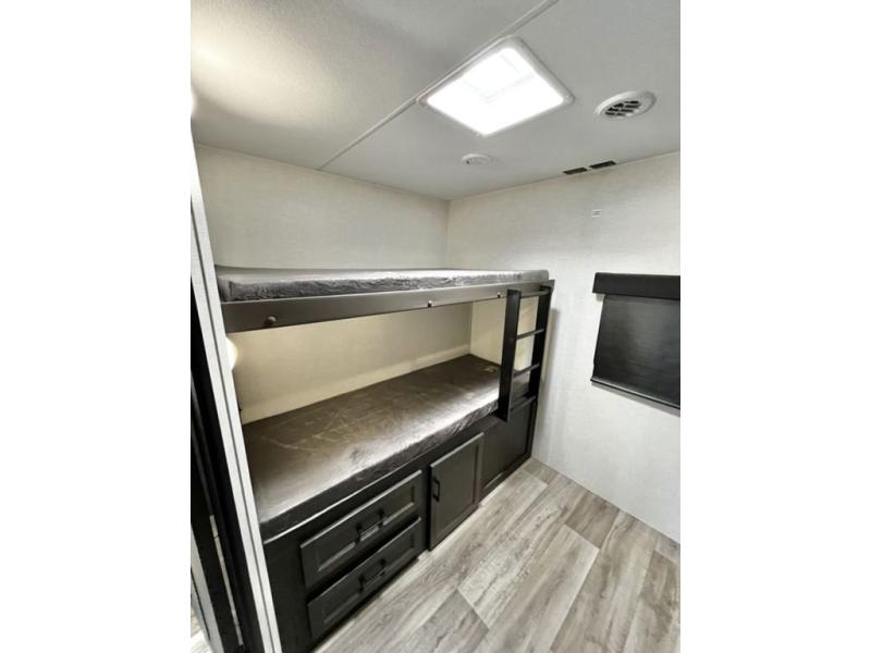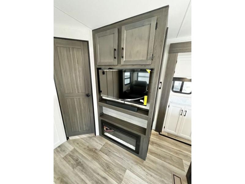 Stay protected rain or shine with the two 10' legless awnings with wind sensors on this travel trailer! Some other exterior features you will enjoy include a campfire café with a 40" TV to watch the big game while you grill steaks on the griddle, and the pass-through storage area with slam latch baggage doors will keep your gear in place. Inside, there is a rear private bunkhouse with a closet, a 32" x 70" flip-up bunk above a 70" sofa with a table, and a 28" x 70" bunk above a 40" x 70" bottom bunk. The living area has a sofa across from an entertainment center with a frameless fireplace and a 40" TV with a swing arm so others can watch it from the Sit N' Slide table. The dual entry bathroom has a 34" radius shower to freshen up in, and is easy to access, especially those staying in the front private bedroom!