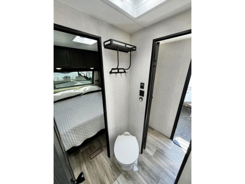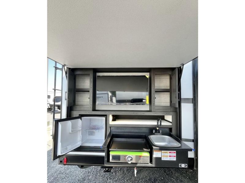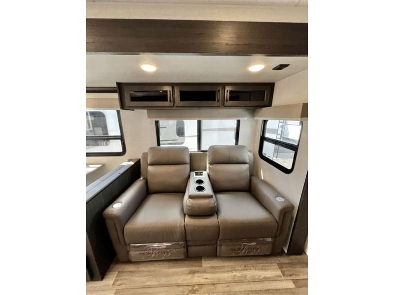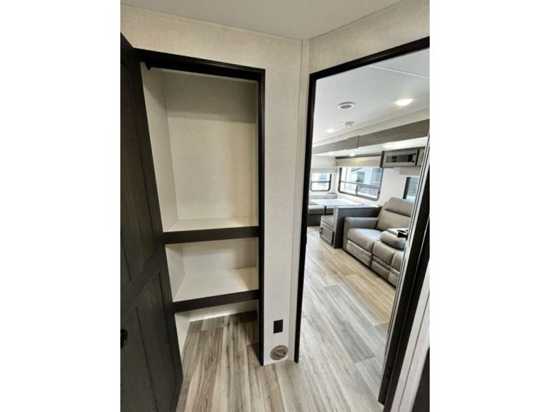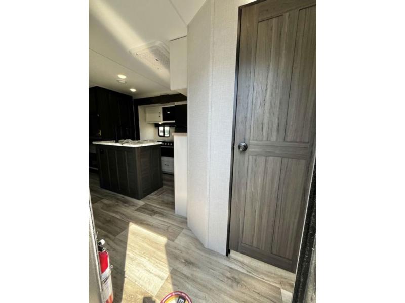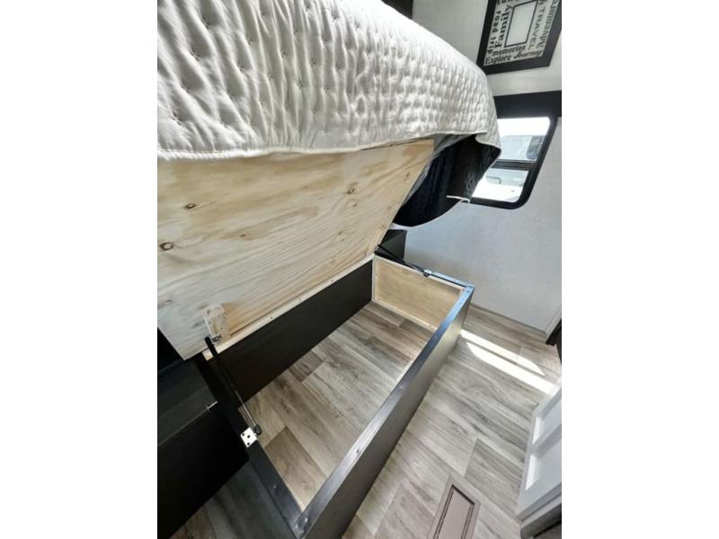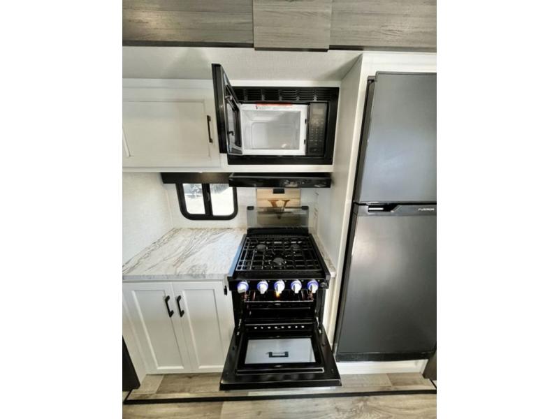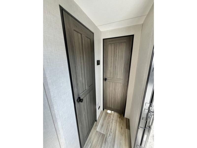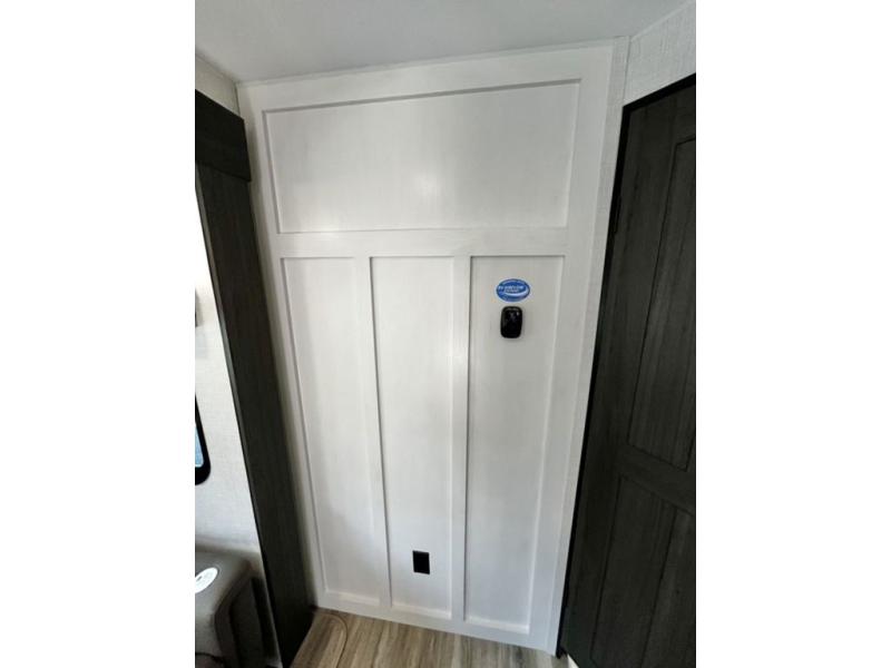 Stay protected rain or shine with the two 10' legless awnings with wind sensors on this travel trailer! Some other exterior features you will enjoy include a campfire café with a 40" TV to watch the big game while you grill steaks on the griddle, and the pass-through storage area with slam latch baggage doors will keep your gear in place. Inside, there is a rear private bunkhouse with a closet, a 32" x 70" flip-up bunk above a 70" sofa with a table, and a 28" x 70" bunk above a 40" x 70" bottom bunk. The living area has a sofa across from an entertainment center with a frameless fireplace and a 40" TV with a swing arm so others can watch it from the Sit N' Slide table. The dual entry bathroom has a 34" radius shower to freshen up in, and is easy to access, especially those staying in the front private bedroom!