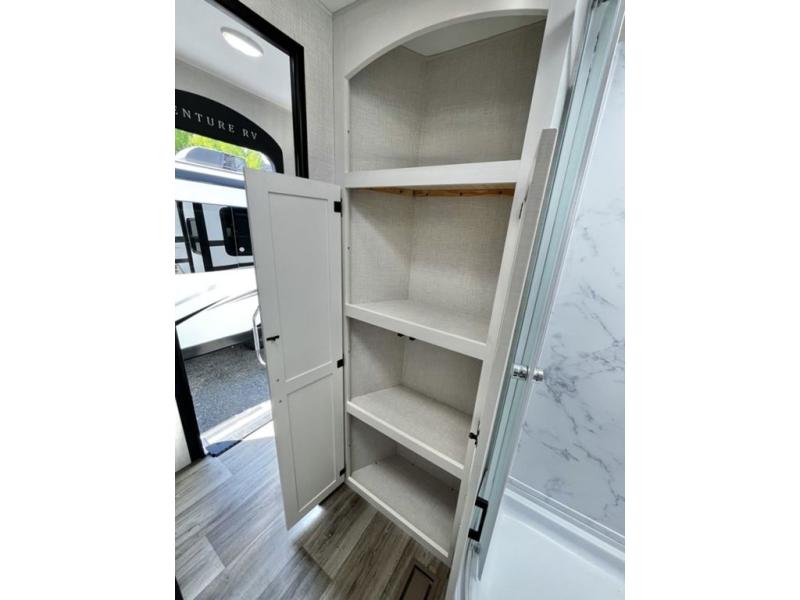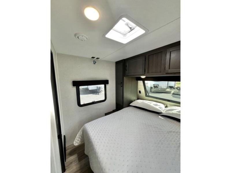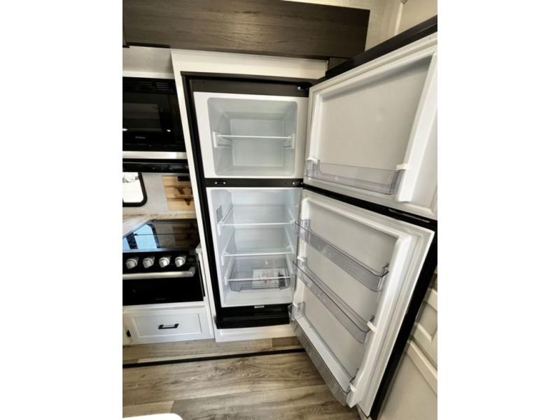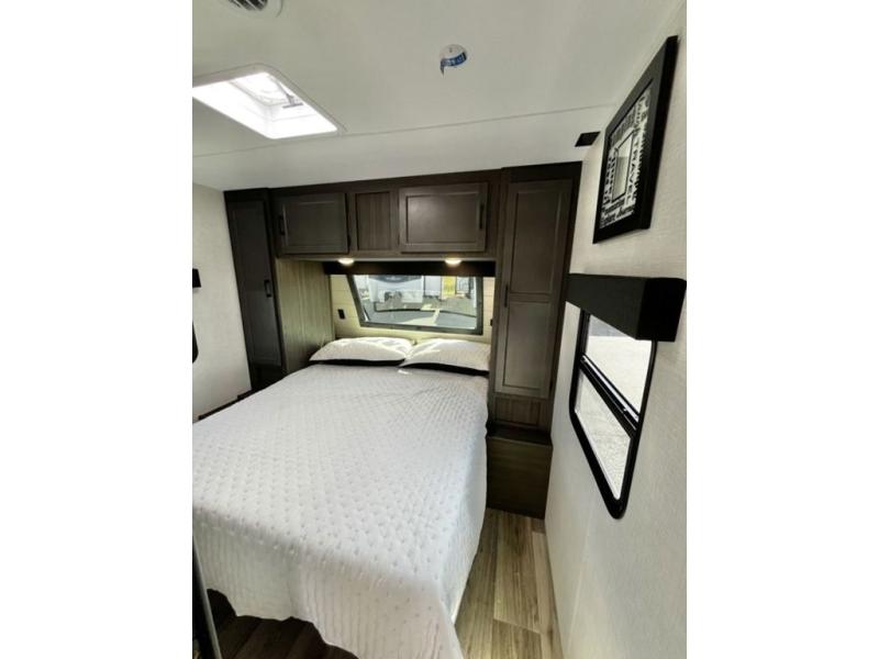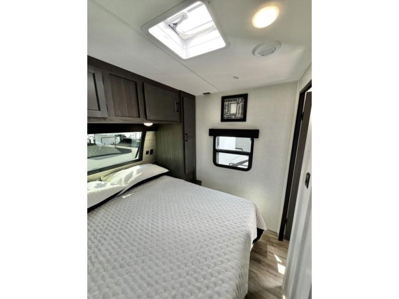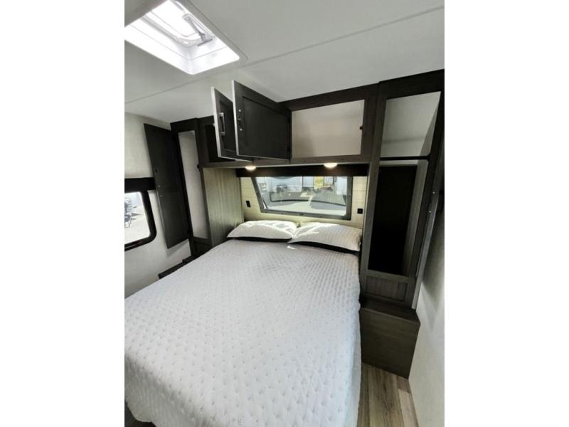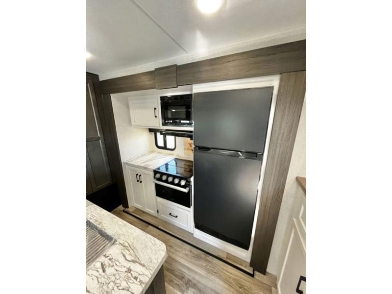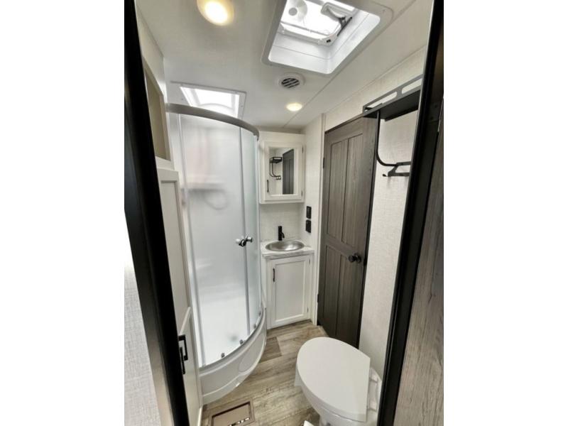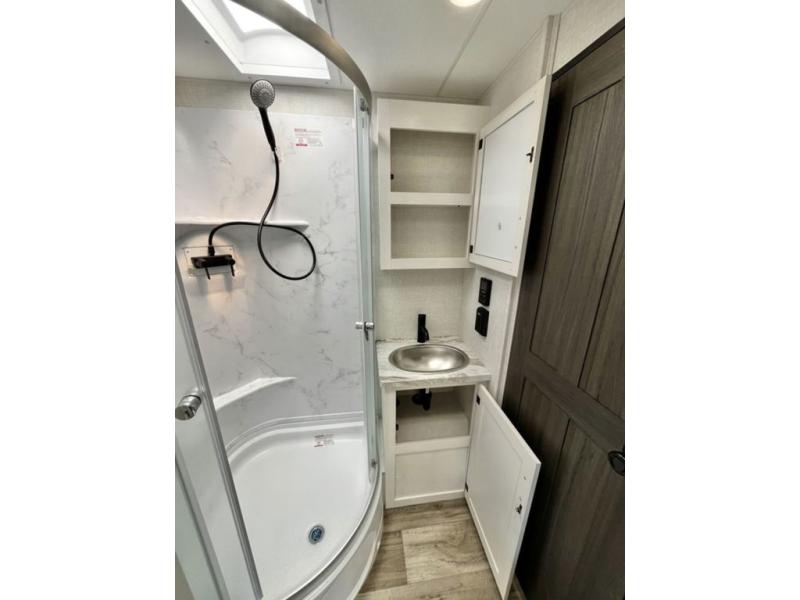 Every Venture RV SportTrek lightweight travel trailer is constructed to offer peace of mind and the comforts of home! Their purposeful residential kitchens are packed with handy features like a Furrion oven and three burner cooktop, a large stainless steel sink with a cover and dish drying rack, plus a 12V refrigerator. You will find plenty of storage throughout, including Safe-Tek hidden storage with a charging center and StorMore nightstands on either side of the bed behind the full-length closets. And the magnetic slam-latch baggage doors and spacious pass-through storage area will hold your outdoor gear in place. They even come with a hot and cold exterior shower and SporTrek's Weather Shield which includes a forced air heated and enclosed underbelly, high output A/C ducting, and more features that will let you extend your camping season. You will also love the new residential upgraded furniture, Serta memory foam mattress, barn style passage doors, and many more comforts!