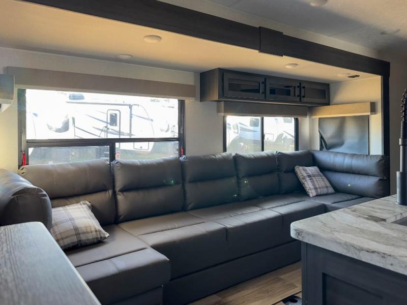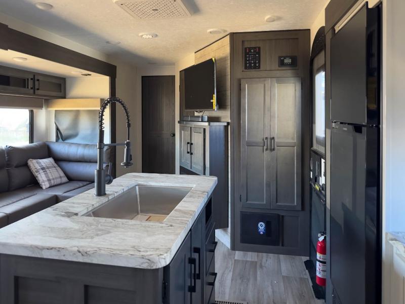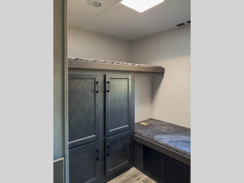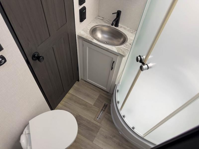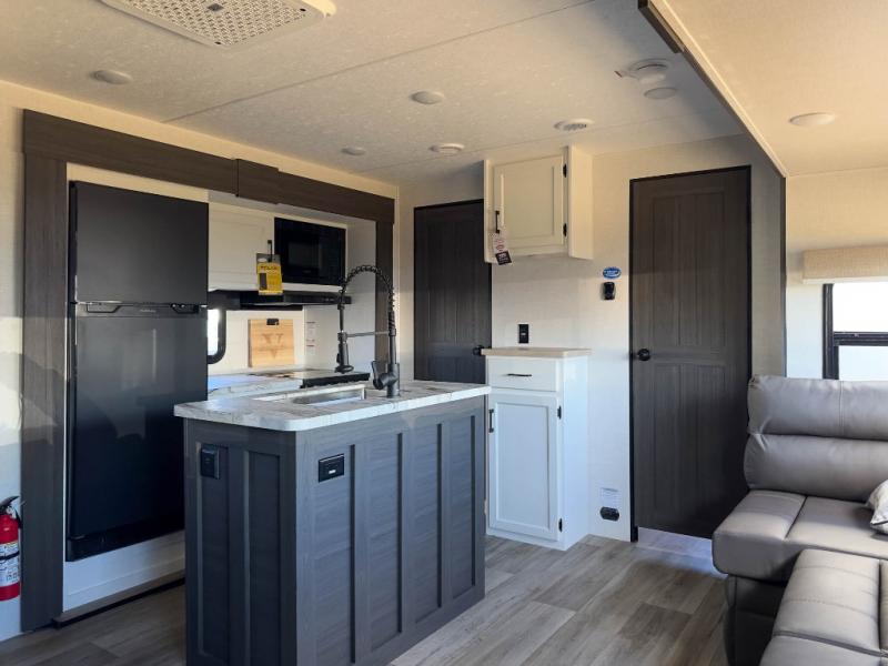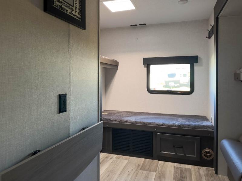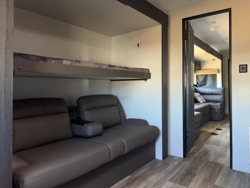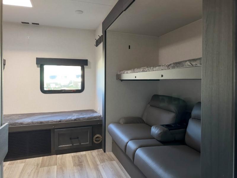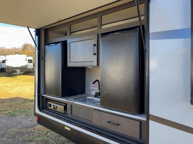 It's a clean decision with a bath and a half to take this travel trailer on your next camping trip! The rear private bunkhouse is decked out with a 28" x 70" bunk bed, a 32" x 70" top bunk, a 28" x 73" flip-up bunk above a 72" sofa with table, and a flip desk to do some school work. The half bathroom has an entry/exit door so you can get back to cooking at the outdoor campfire café which has two outdoor 3 cu. ft. refrigerators, a sink, griddle, and storage. Your clean up will be a breeze thanks to the kitchen island with a large sink and dish drying rack. If you need extra sleeping space then simply convert the 70" sofa at night. There is also a Sit N' Slide table with flipside reversible cushions. Those staying in the front private bedroom will enjoy a good night's rest on the Sleep Tight queen bed and have the convenience of accessing the dual entry bathroom!