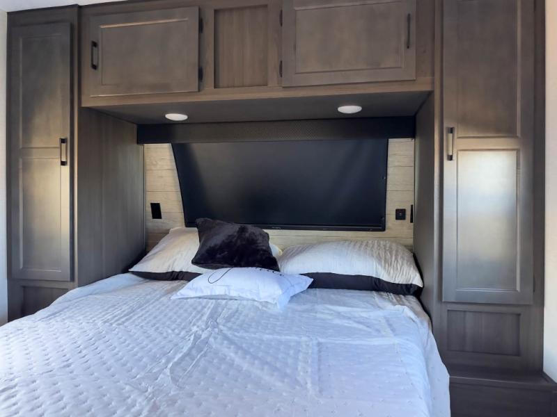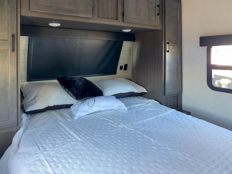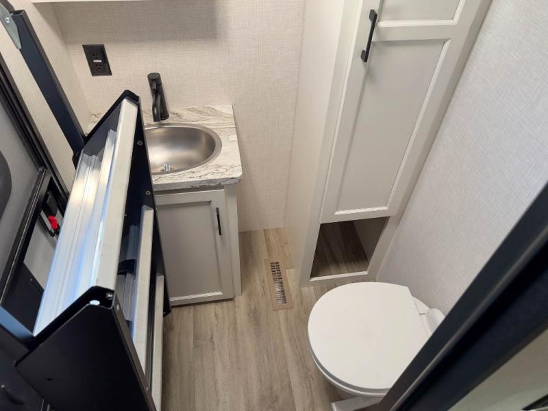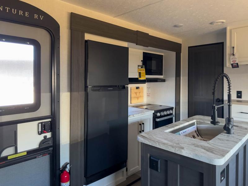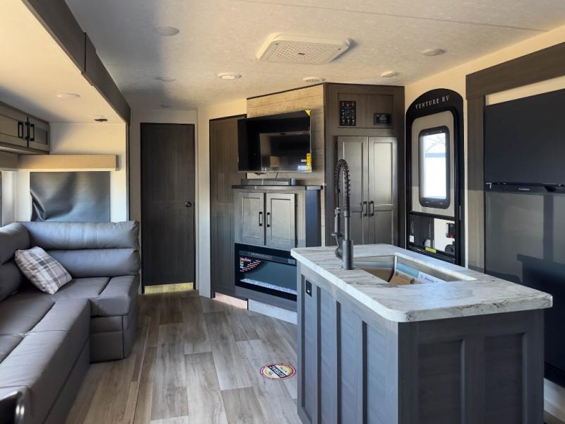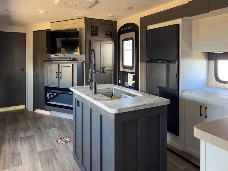 Every Venture RV SportTrek lightweight travel trailer is constructed to offer peace of mind and the comforts of home! Their purposeful residential kitchens are packed with handy features like a Furrion oven and three burner cooktop, a large stainless steel sink with a cover and dish drying rack, plus a 12V refrigerator. You will find plenty of storage throughout, including Safe-Tek hidden storage with a charging center and StorMore nightstands on either side of the bed behind the full-length closets. And the magnetic slam-latch baggage doors and spacious pass-through storage area will hold your outdoor gear in place. They even come with a hot and cold exterior shower and SporTrek's Weather Shield which includes a forced air heated and enclosed underbelly, high output A/C ducting, and more features that will let you extend your camping season. You will also love the new residential upgraded furniture, Serta memory foam mattress, barn style passage doors, and many more comforts!