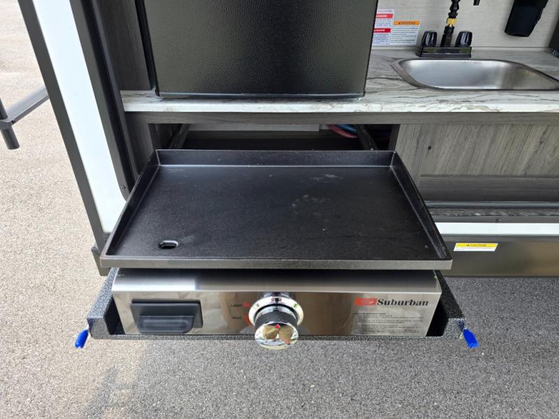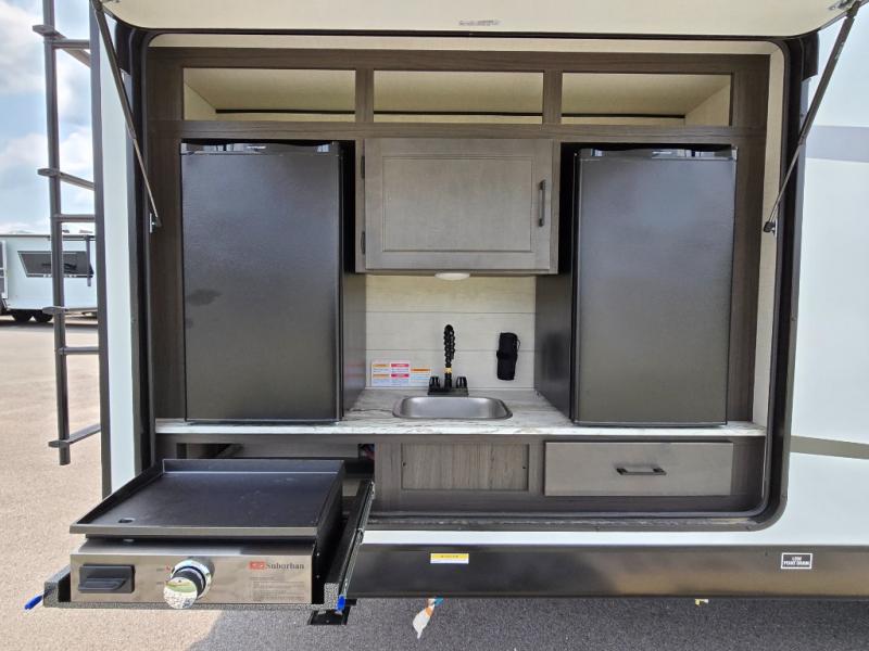 It's a clean decision with a bath and a half to take this travel trailer on your next camping trip! The rear private bunkhouse is decked out with a 28" x 70" bunk bed, a 32" x 70" top bunk, a 28" x 73" flip-up bunk above a 72" sofa with table, and a flip desk to do some school work. The half bathroom has an entry/exit door so you can get back to cooking at the outdoor campfire café which has two outdoor 3 cu. ft. refrigerators, a sink, griddle, and storage. Your clean up will be a breeze thanks to the kitchen island with a large sink and dish drying rack. If you need extra sleeping space then simply convert the 70" sofa at night. There is also a Sit N' Slide table with flipside reversible cushions. Those staying in the front private bedroom will enjoy a good night's rest on the Sleep Tight queen bed and have the convenience of accessing the dual entry bathroom!