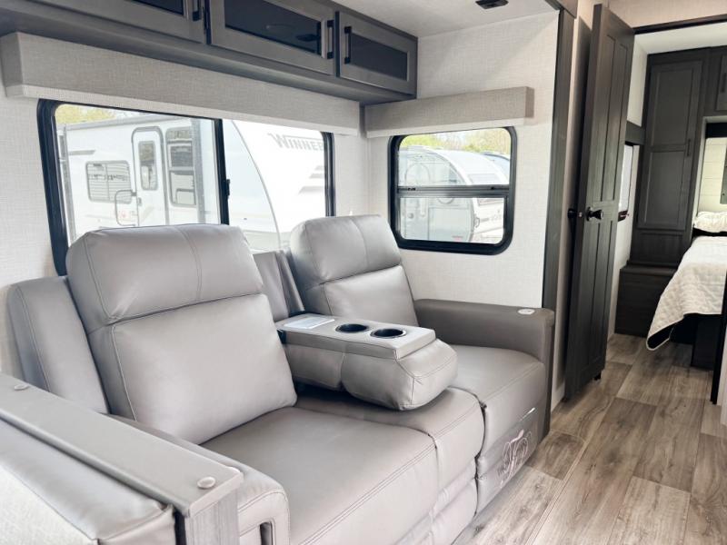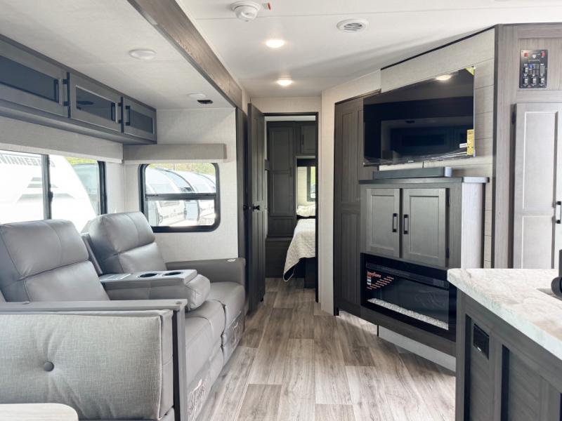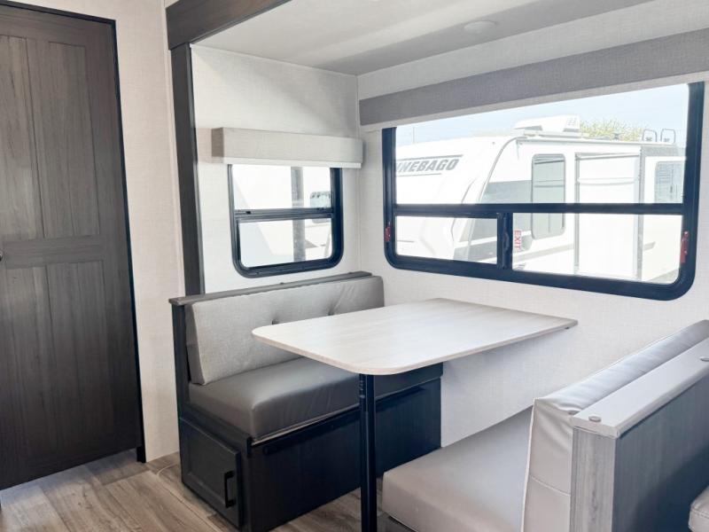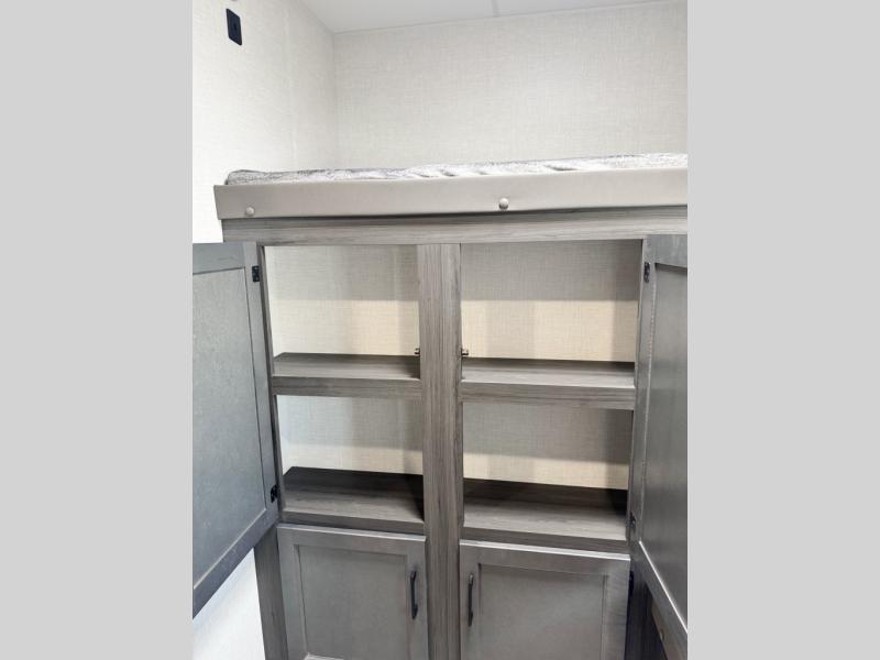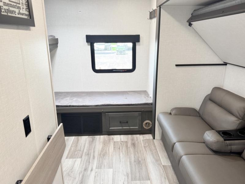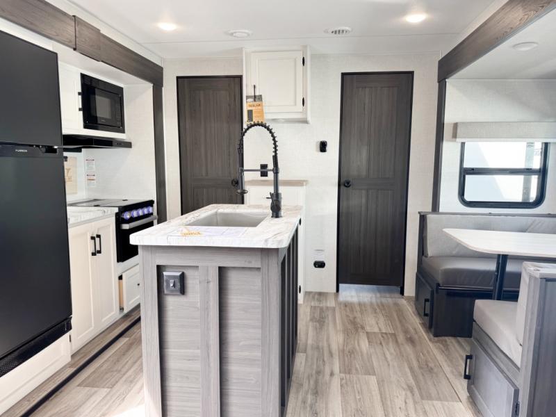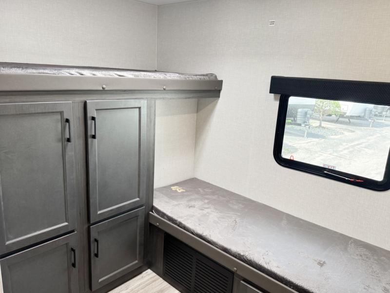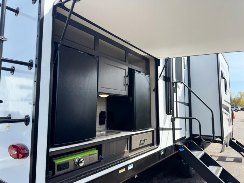 It's a clean decision with a bath and a half to take this travel trailer on your next camping trip! The rear private bunkhouse is decked out with a 28" x 70" bunk bed, a 32" x 70" top bunk, a 28" x 73" flip-up bunk above a 72" sofa with table, and a flip desk to do some school work. The half bathroom has an entry/exit door so you can get back to cooking at the outdoor campfire café which has two outdoor 3 cu. ft. refrigerators, a sink, griddle, and storage. Your clean up will be a breeze thanks to the kitchen island with a large sink and dish drying rack. If you need extra sleeping space then simply convert the 70" sofa at night. There is also a Sit N' Slide table with flipside reversible cushions. Those staying in the front private bedroom will enjoy a good night's rest on the Sleep Tight queen bed and have the convenience of accessing the dual entry bathroom!