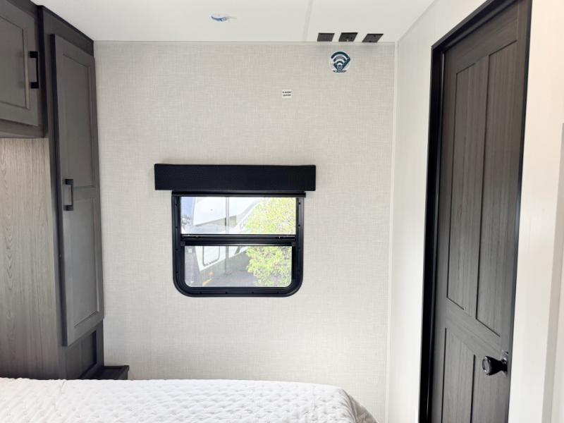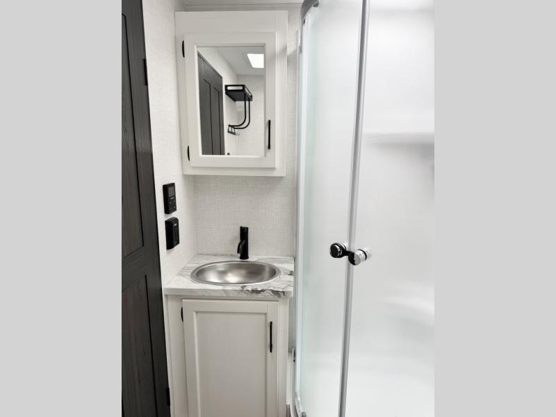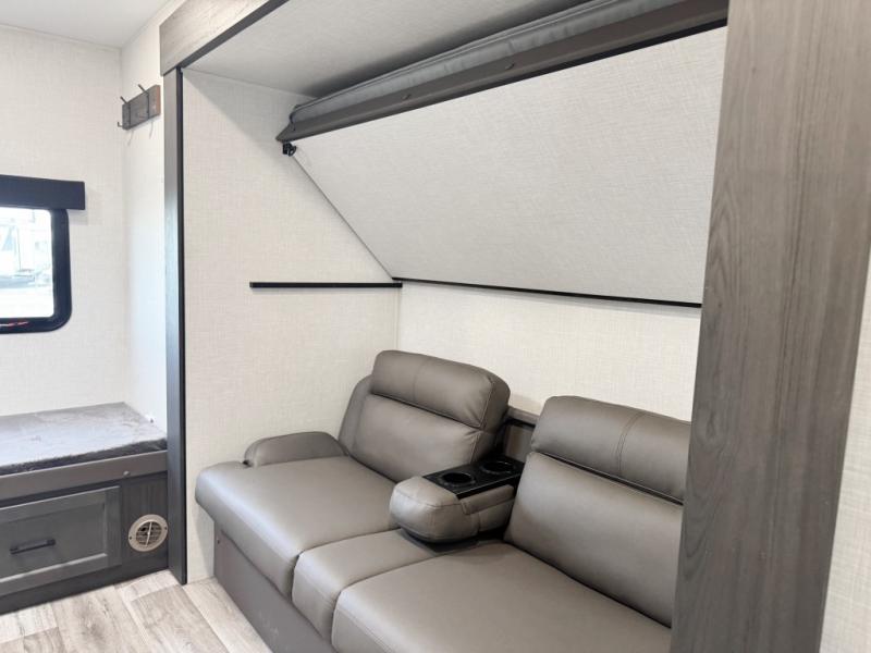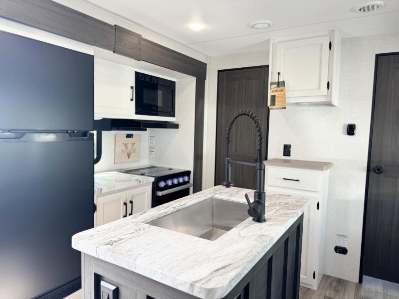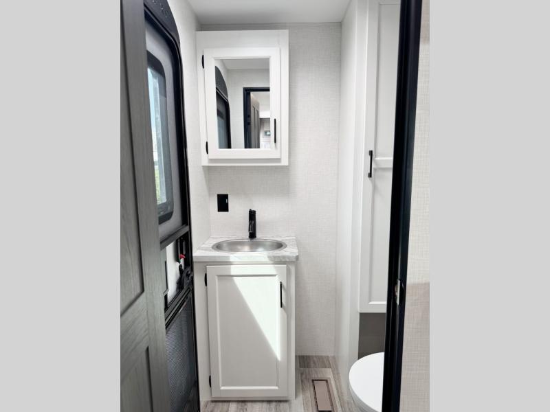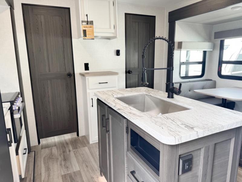 Every Venture RV SportTrek lightweight travel trailer is constructed to offer peace of mind and the comforts of home! Their purposeful residential kitchens are packed with handy features like a Furrion oven and three burner cooktop, a large stainless steel sink with a cover and dish drying rack, plus a 12V refrigerator. You will find plenty of storage throughout, including Safe-Tek hidden storage with a charging center and StorMore nightstands on either side of the bed behind the full-length closets. And the magnetic slam-latch baggage doors and spacious pass-through storage area will hold your outdoor gear in place. They even come with a hot and cold exterior shower and SporTrek's Weather Shield which includes a forced air heated and enclosed underbelly, high output A/C ducting, and more features that will let you extend your camping season. You will also love the new residential upgraded furniture, Serta memory foam mattress, barn style passage doors, and many more comforts!