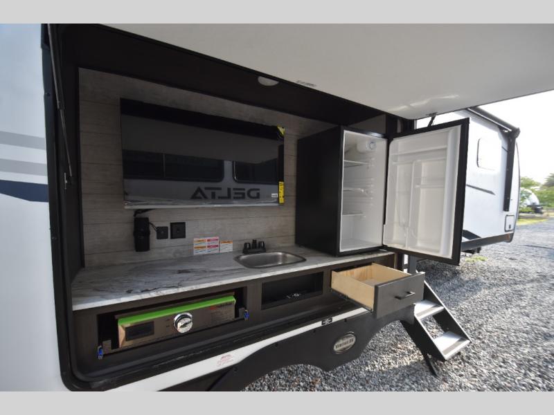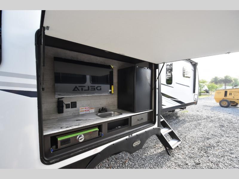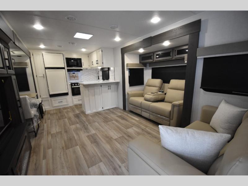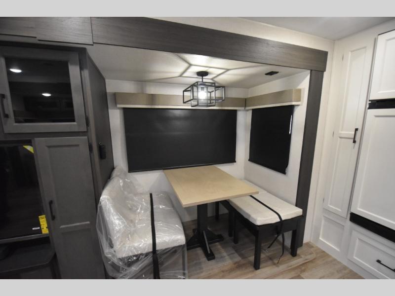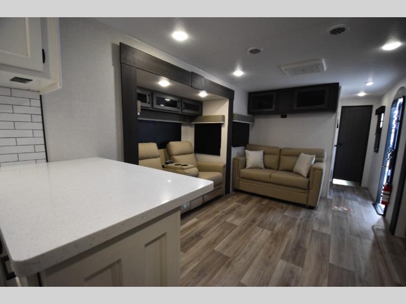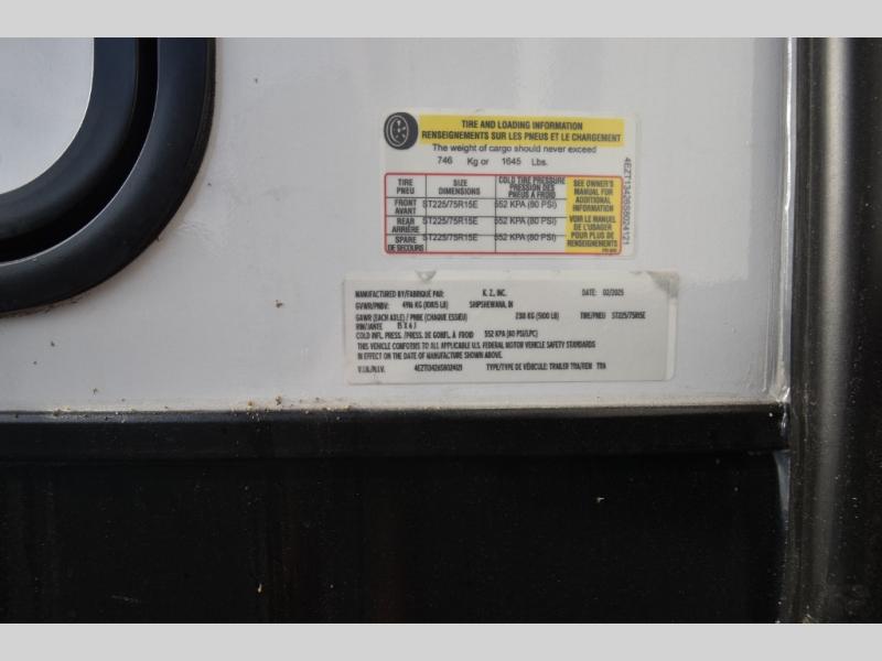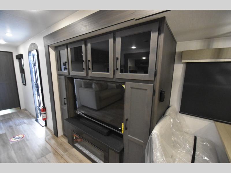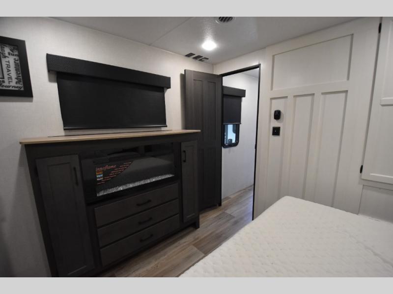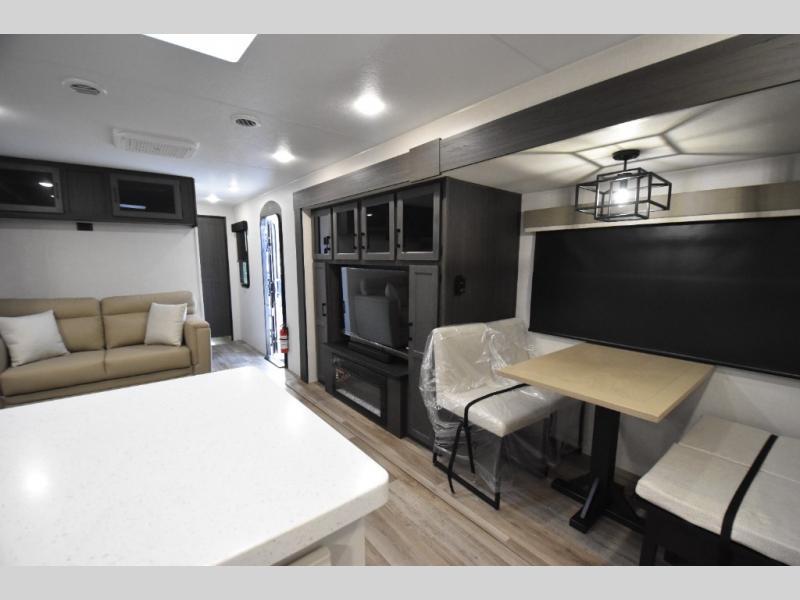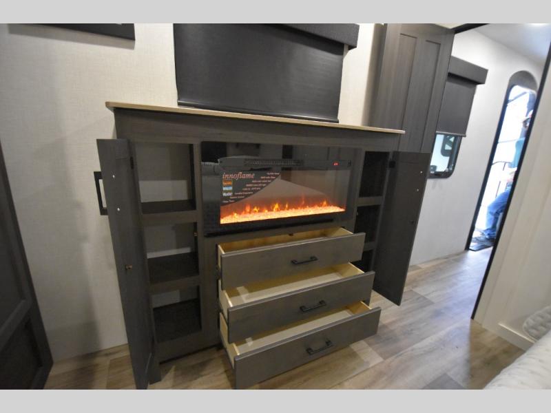 The chef will feel right at home cooking in the rear kitchen with all of the countertop space in this travel trailer! They can even head outside to breathe in some fresh air while cooking at the exterior campfire café with a refrigerator, a sink with countertop space, and a griddle. Relax each night in the middle living area with the 64" sofa and the slide that has theater seating with USB charging across from the entertainment center with a TV and 30" frameless fireplace. When you're ready to wind down your nights, take a hot shower in the full bathroom with the 30" x 36" shower then head to the front private bedroom and either read a book at the window seat or lay in the 70" x 80" sleep tight king bed slide while watching a movie with the TV or watch the 30" frameless fireplace!