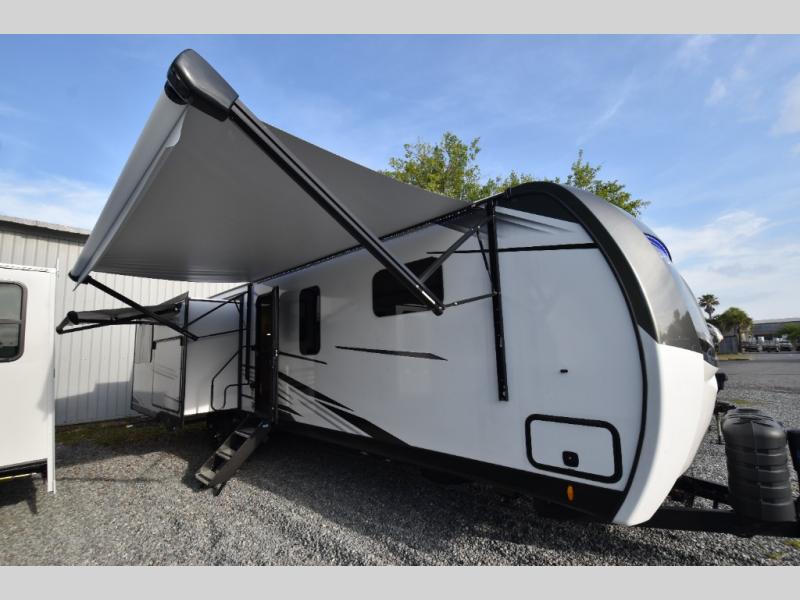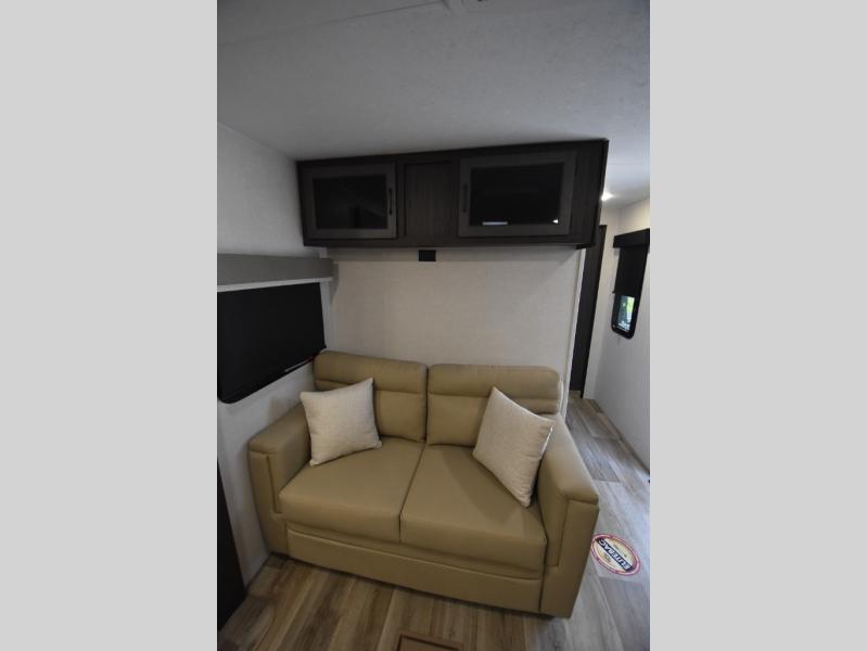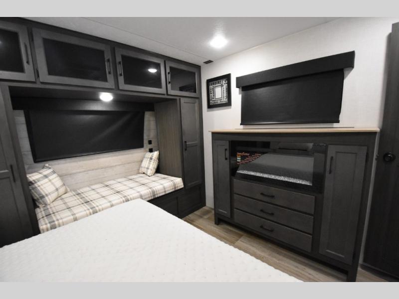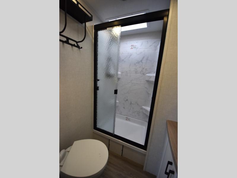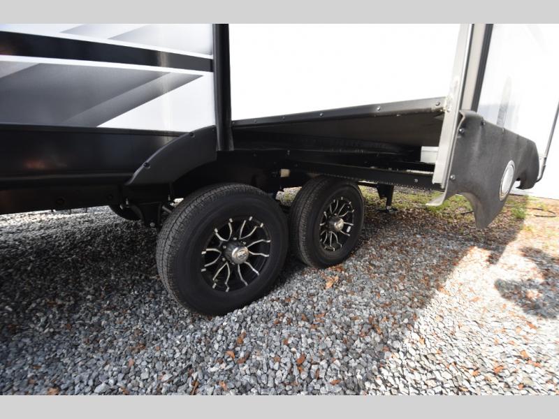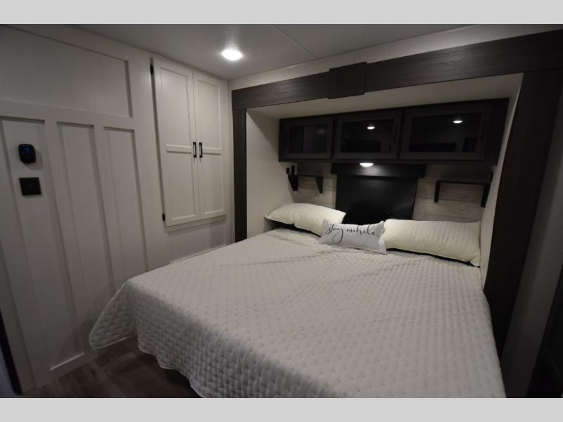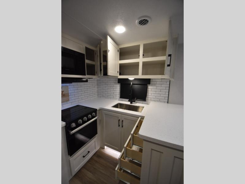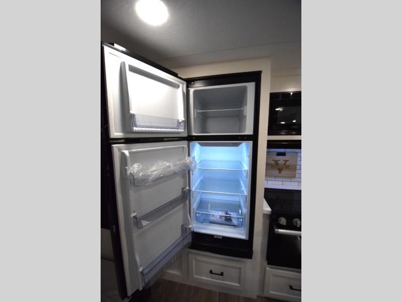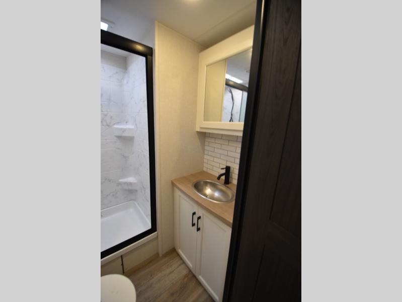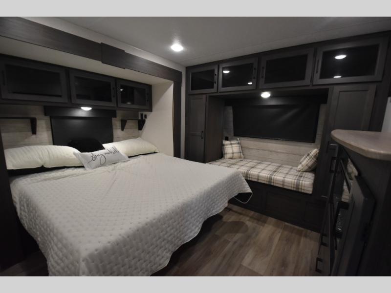 The chef will feel right at home cooking in the rear kitchen with all of the countertop space in this travel trailer! They can even head outside to breathe in some fresh air while cooking at the exterior campfire café with a refrigerator, a sink with countertop space, and a griddle. Relax each night in the middle living area with the 64" sofa and the slide that has theater seating with USB charging across from the entertainment center with a TV and 30" frameless fireplace. When you're ready to wind down your nights, take a hot shower in the full bathroom with the 30" x 36" shower then head to the front private bedroom and either read a book at the window seat or lay in the 70" x 80" sleep tight king bed slide while watching a movie with the TV or watch the 30" frameless fireplace!