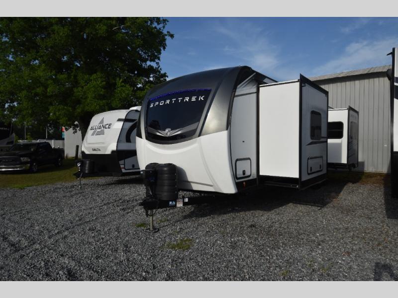 An elegant design and new features come with every one of these Venture RV SportTrek Touring Edition travel trailers! The NXG Huck bolt frame holds these units together and a walkable roof covers them. Heads will turn down the highway and at the campsite with an upgraded graphics package and a painted fiberglass front cap with integrated LED light. The exterior pass-through storage area has slam latch baggage doors with magnetic catches so you don't have to worry about them closing on you and a motion activated light to see your items clearly even at night. Luxury abounds throughout these units, especially with the mandatory Interior Luxury package which comes with solid surface kitchen countertops, designer valances with fabric nightshades, two 30" frameless fireplaces, and Beauflor wood plank flooring that is easy to clean. Come find your favorite model today!