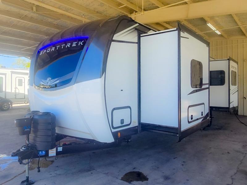 An elegant design and new features come with every one of these Venture RV SportTrek Touring Edition travel trailers! The NXG Huck bolt frame holds these units together and a walkable roof covers them. Heads will turn down the highway and at the campsite with an upgraded graphics package and a painted fiberglass front cap with integrated LED light. The exterior pass-through storage area has slam latch baggage doors with magnetic catches so you don't have to worry about them closing on you and a motion activated light to see your items clearly even at night. Luxury abounds throughout these units, especially with the mandatory Interior Luxury package which comes with solid surface kitchen countertops, designer valances with fabric nightshades, two 30" frameless fireplaces, and Beauflor wood plank flooring that is easy to clean. Come find your favorite model today!