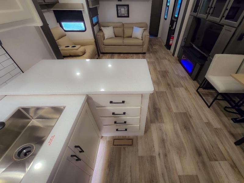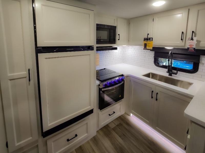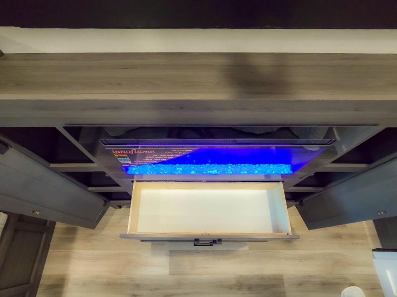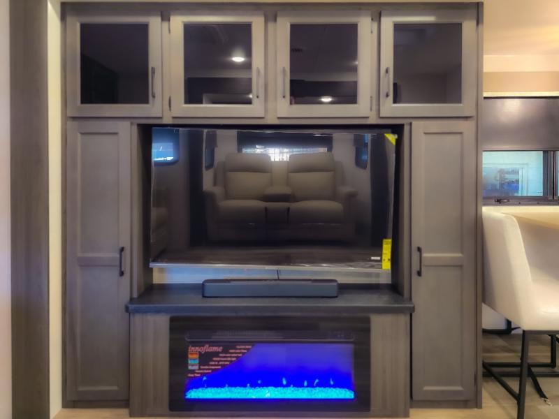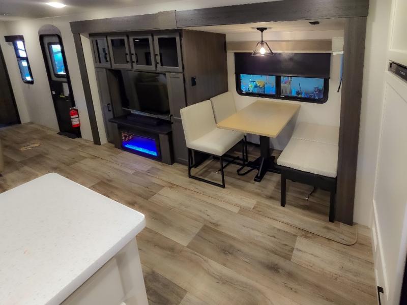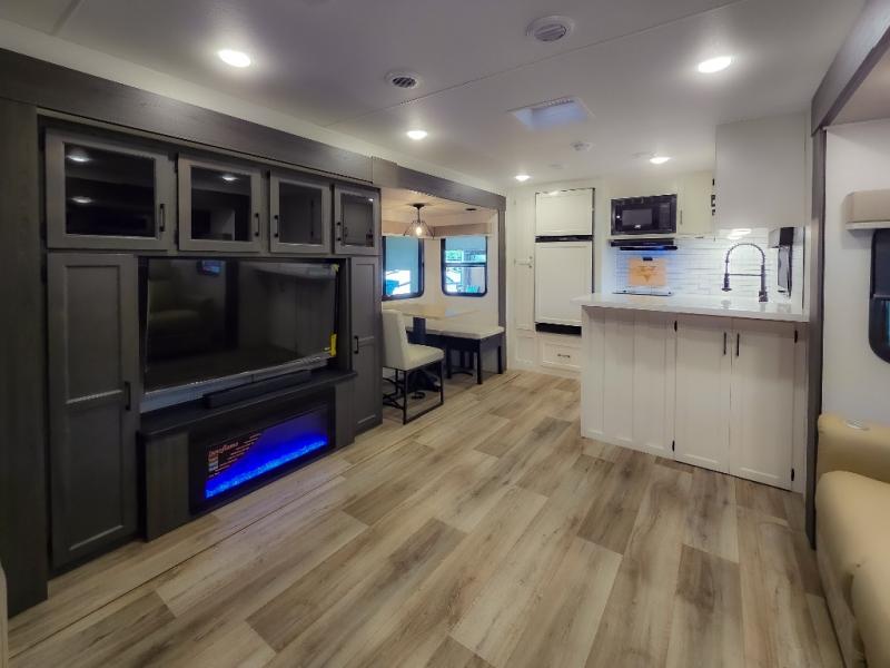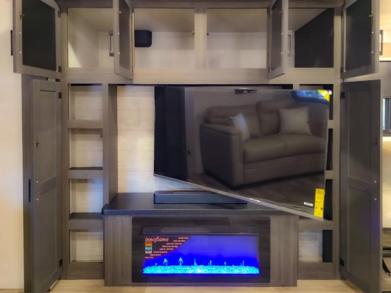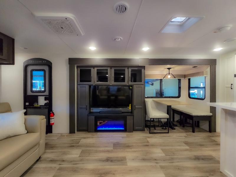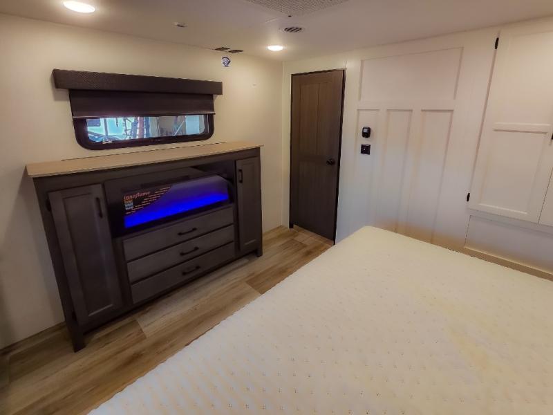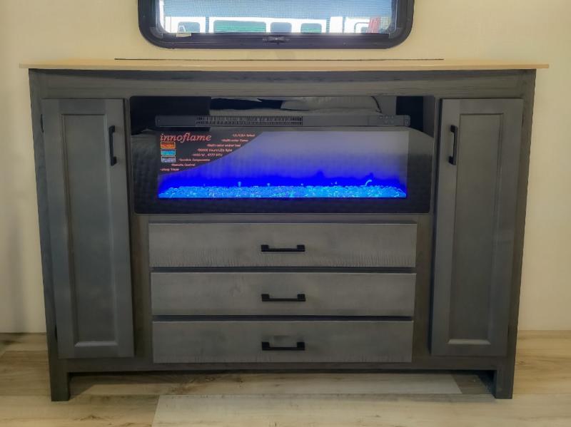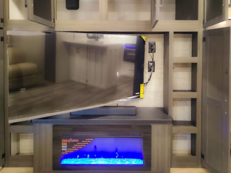 The chef will feel right at home cooking in the rear kitchen with all of the countertop space in this travel trailer! They can even head outside to breathe in some fresh air while cooking at the exterior campfire café with a refrigerator, a sink with countertop space, and a griddle. Relax each night in the middle living area with the 64" sofa and the slide that has theater seating with USB charging across from the entertainment center with a TV and 30" frameless fireplace. When you're ready to wind down your nights, take a hot shower in the full bathroom with the 30" x 36" shower then head to the front private bedroom and either read a book at the window seat or lay in the 70" x 80" sleep tight king bed slide while watching a movie with the TV or watch the 30" frameless fireplace!