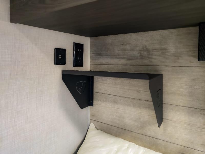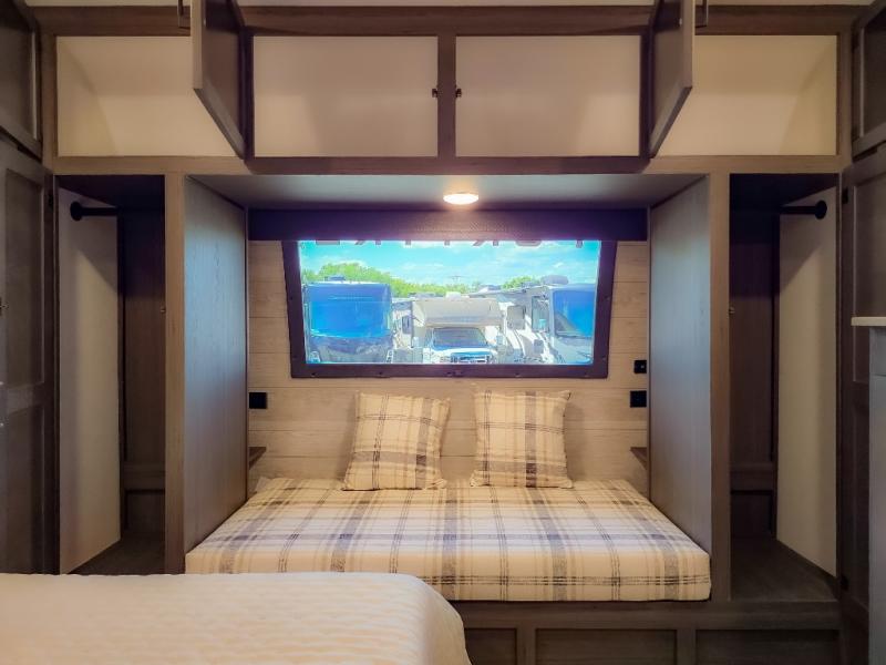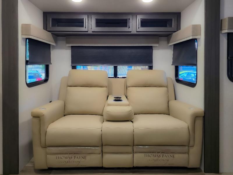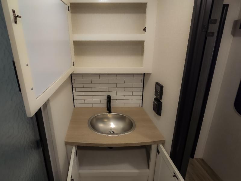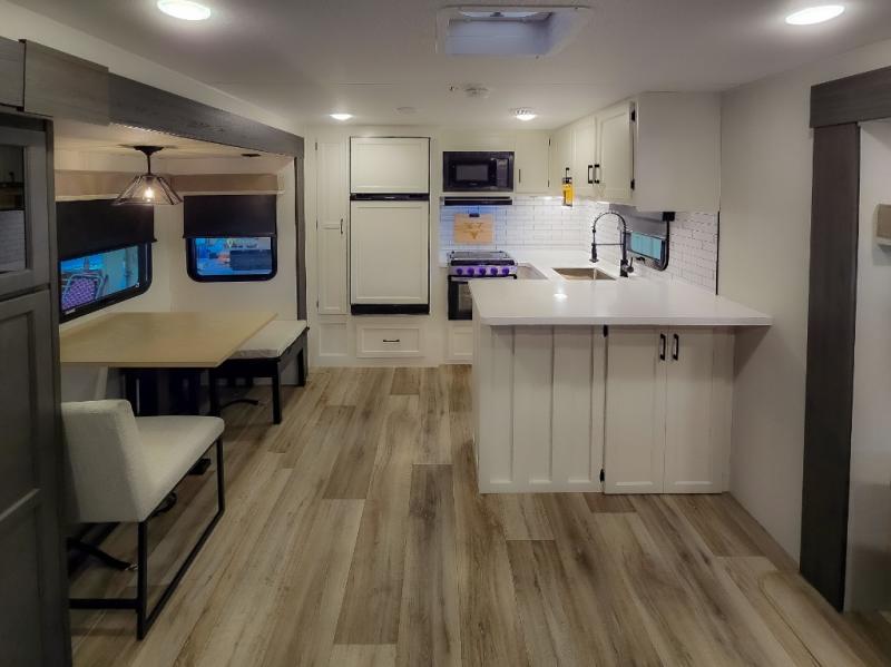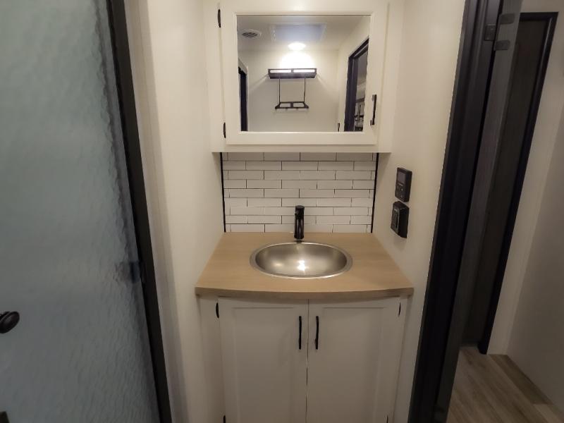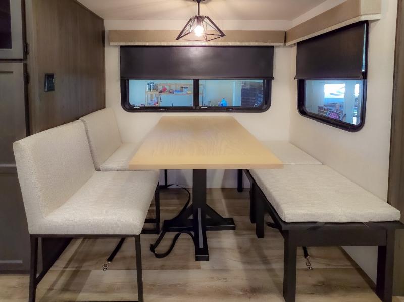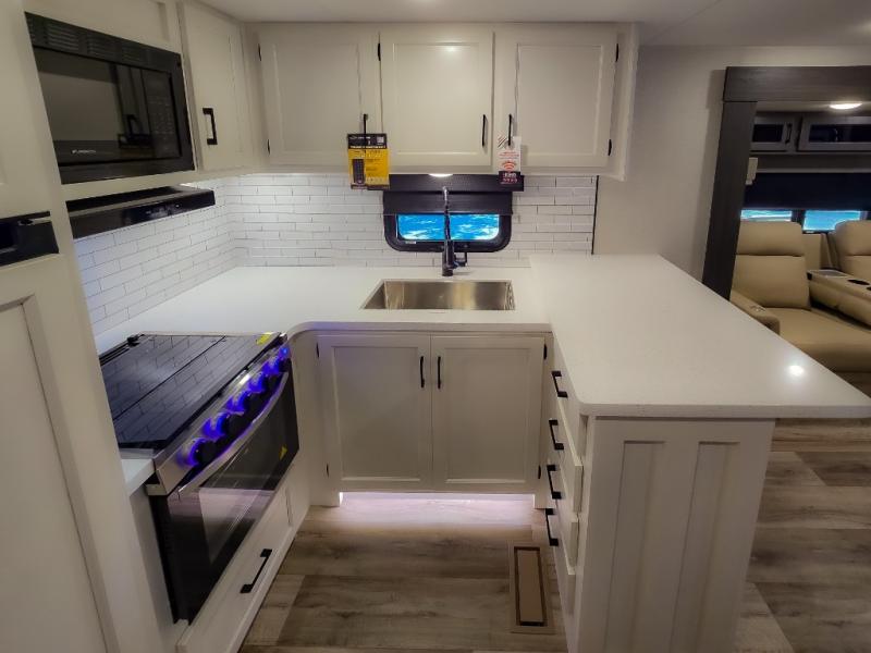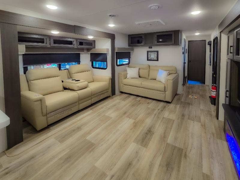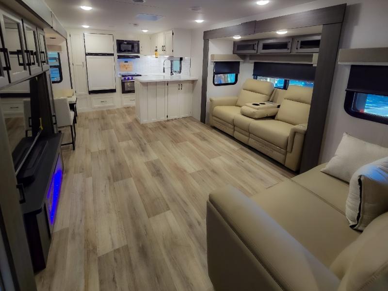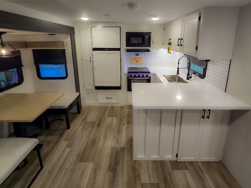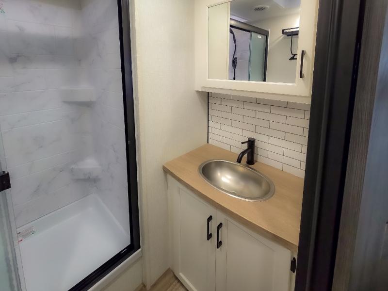 The chef will feel right at home cooking in the rear kitchen with all of the countertop space in this travel trailer! They can even head outside to breathe in some fresh air while cooking at the exterior campfire café with a refrigerator, a sink with countertop space, and a griddle. Relax each night in the middle living area with the 64" sofa and the slide that has theater seating with USB charging across from the entertainment center with a TV and 30" frameless fireplace. When you're ready to wind down your nights, take a hot shower in the full bathroom with the 30" x 36" shower then head to the front private bedroom and either read a book at the window seat or lay in the 70" x 80" sleep tight king bed slide while watching a movie with the TV or watch the 30" frameless fireplace!