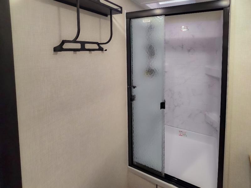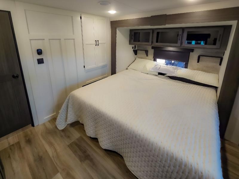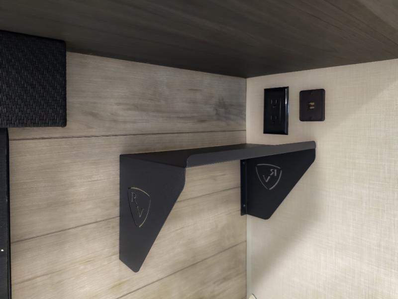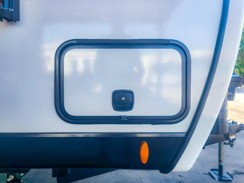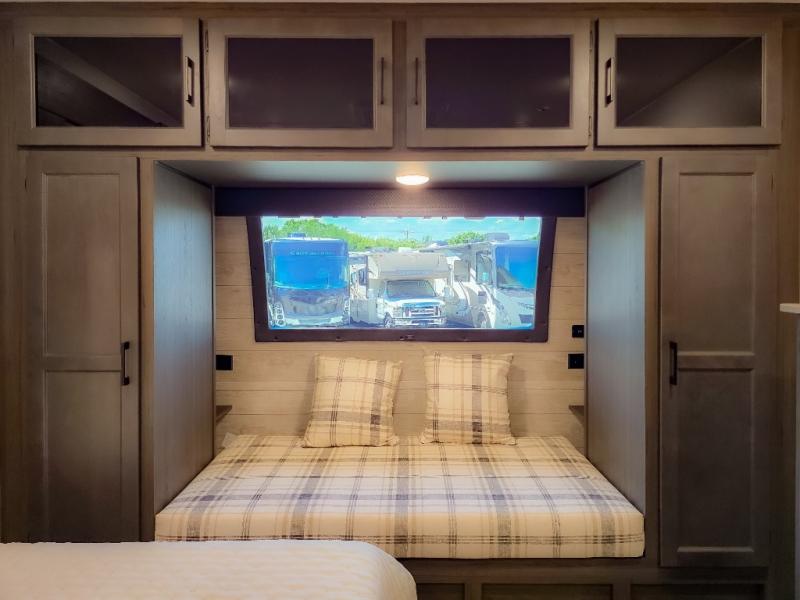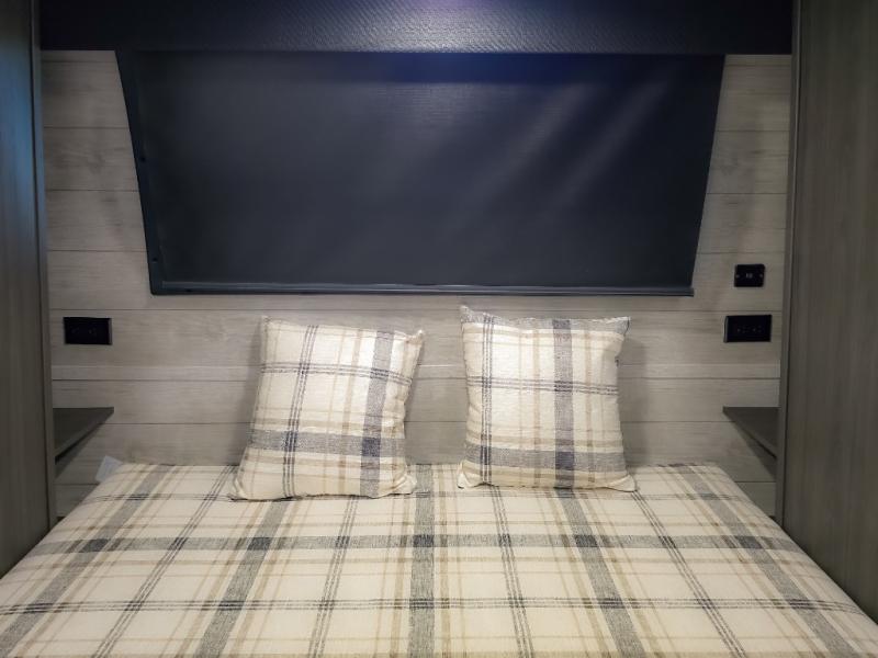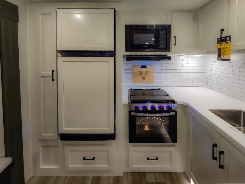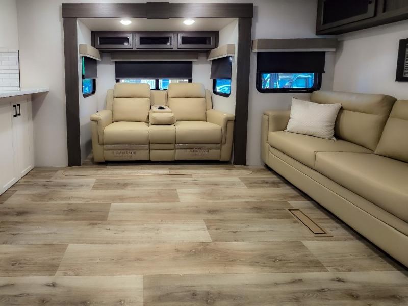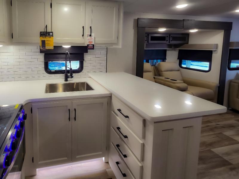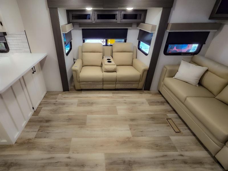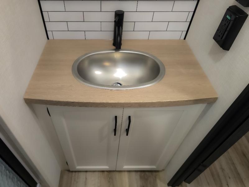 The chef will feel right at home cooking in the rear kitchen with all of the countertop space in this travel trailer! They can even head outside to breathe in some fresh air while cooking at the exterior campfire café with a refrigerator, a sink with countertop space, and a griddle. Relax each night in the middle living area with the 64" sofa and the slide that has theater seating with USB charging across from the entertainment center with a TV and 30" frameless fireplace. When you're ready to wind down your nights, take a hot shower in the full bathroom with the 30" x 36" shower then head to the front private bedroom and either read a book at the window seat or lay in the 70" x 80" sleep tight king bed slide while watching a movie with the TV or watch the 30" frameless fireplace!