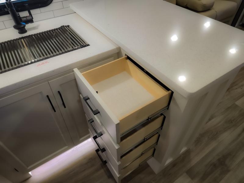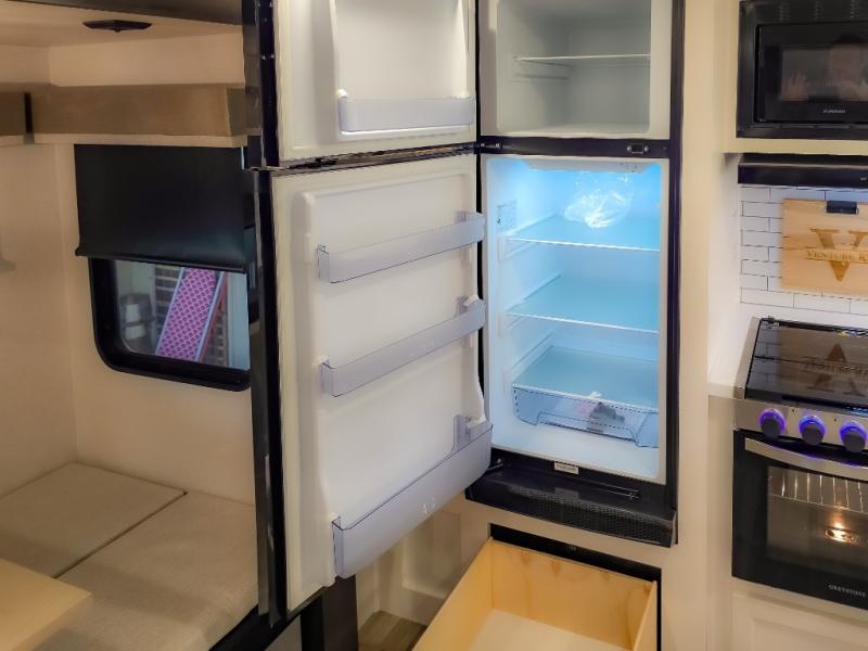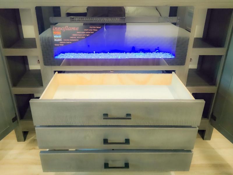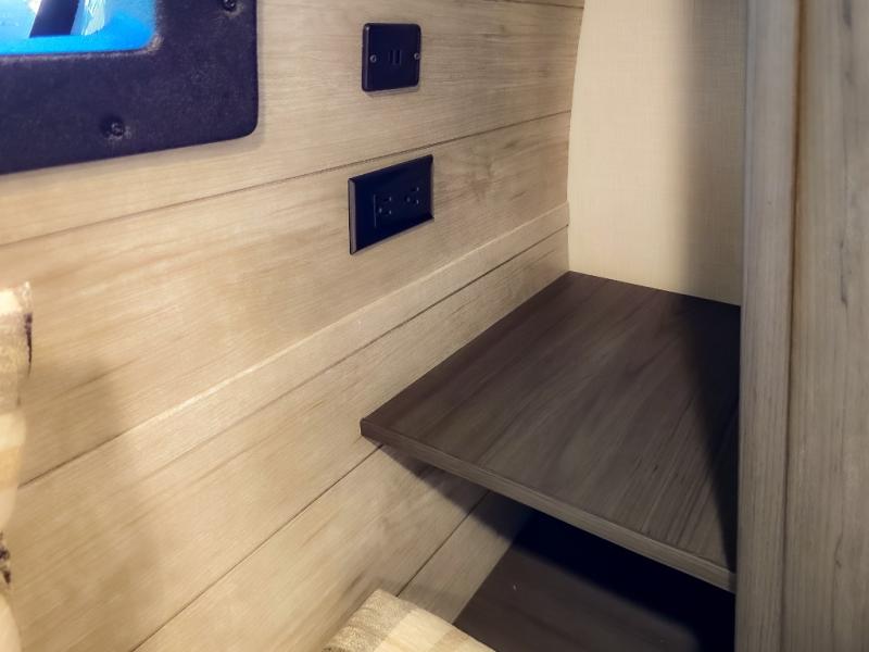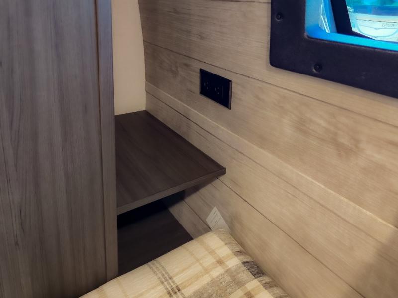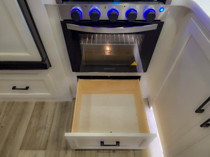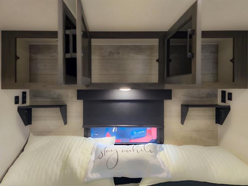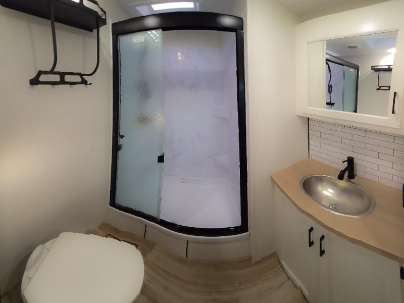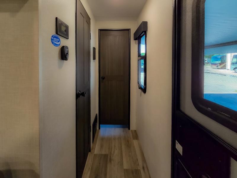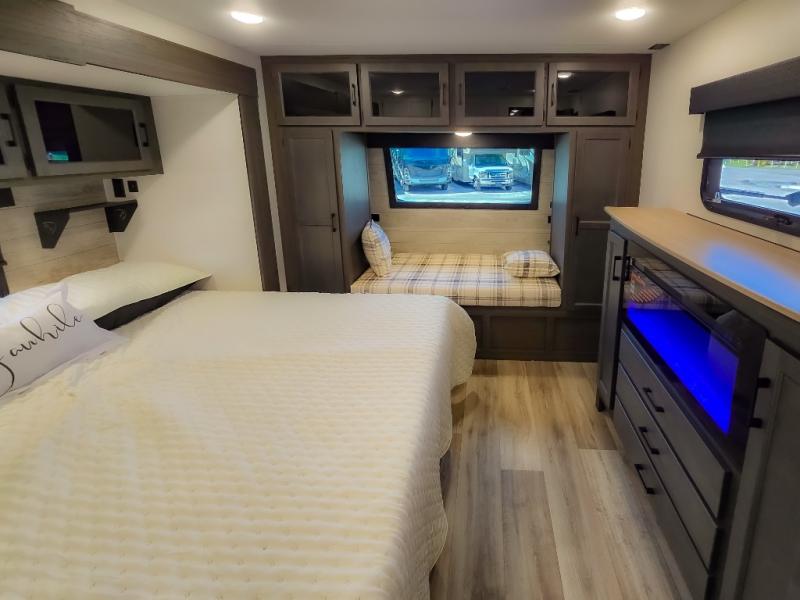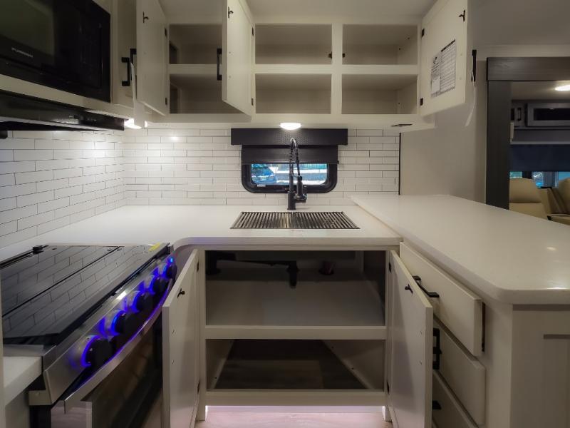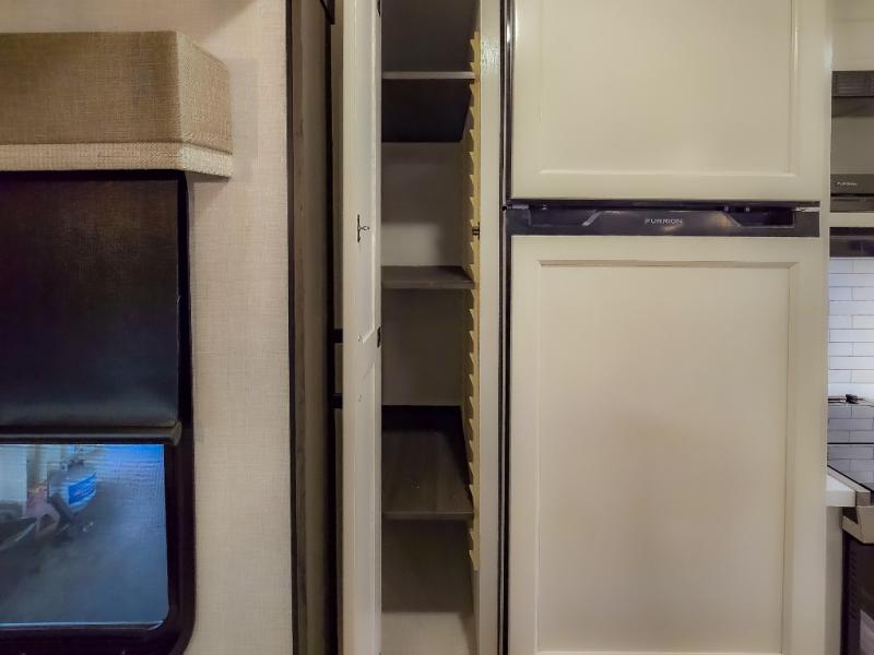 The chef will feel right at home cooking in the rear kitchen with all of the countertop space in this travel trailer! They can even head outside to breathe in some fresh air while cooking at the exterior campfire café with a refrigerator, a sink with countertop space, and a griddle. Relax each night in the middle living area with the 64" sofa and the slide that has theater seating with USB charging across from the entertainment center with a TV and 30" frameless fireplace. When you're ready to wind down your nights, take a hot shower in the full bathroom with the 30" x 36" shower then head to the front private bedroom and either read a book at the window seat or lay in the 70" x 80" sleep tight king bed slide while watching a movie with the TV or watch the 30" frameless fireplace!