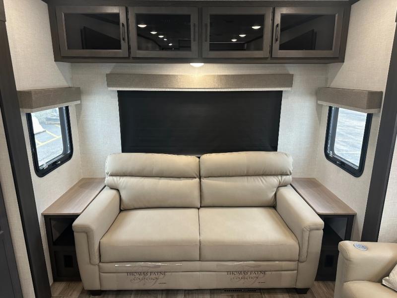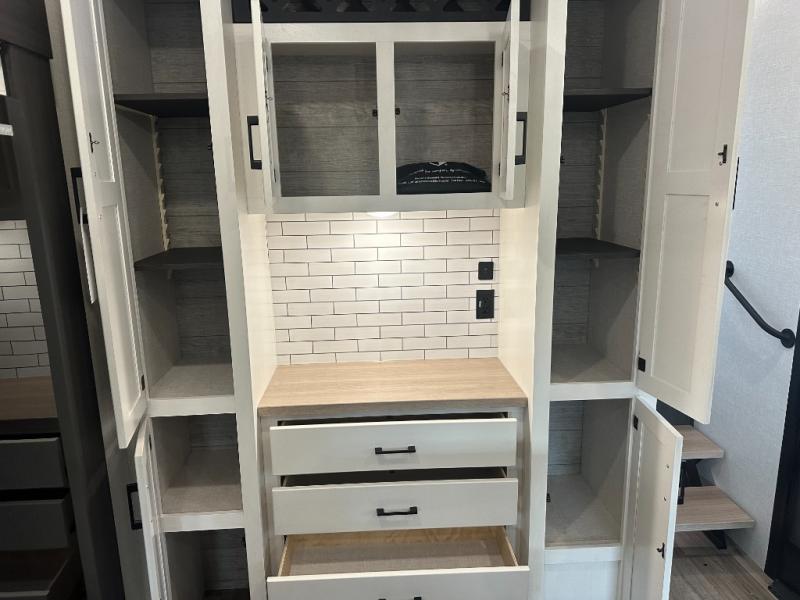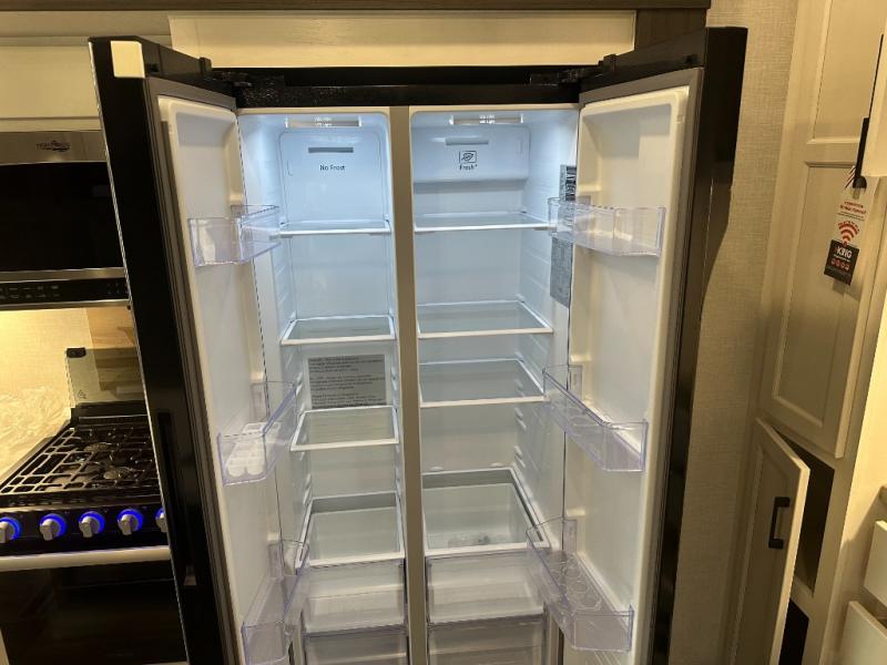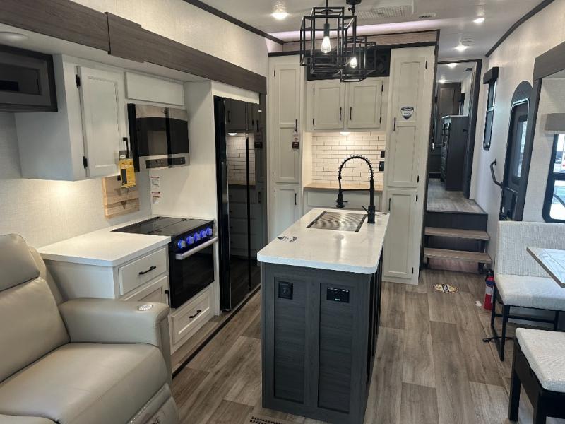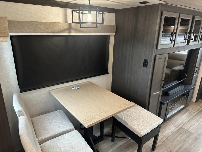 You won't even feel like you're camping in this fifth wheel! The front private bedroom has a Serta king mattress to lay your head on at night, a window seat to comfortably read a book while enjoying the 5,000 BTU fireplace, a shelf storage closet, and a prepped area for a washer and dryer. Freshen up each morning with the 48" fiberglass shower in the full bathroom then head down the floating steps with shoe storage to whip up a delicious breakfast. The fully equipped kitchen even comes with a 18" GE stainless steel dishwasher at the kitchen island for easy clean up. Enjoy your meals at the table with two chairs and two Versa benches. You could even cook at the outside campfire cafe with the griddle. Inside the rear living area, you will find a 70" tri-fold sofa with end tables and theater seating with USB charging across from the entertainment center with a 5,000 BTU fireplace!