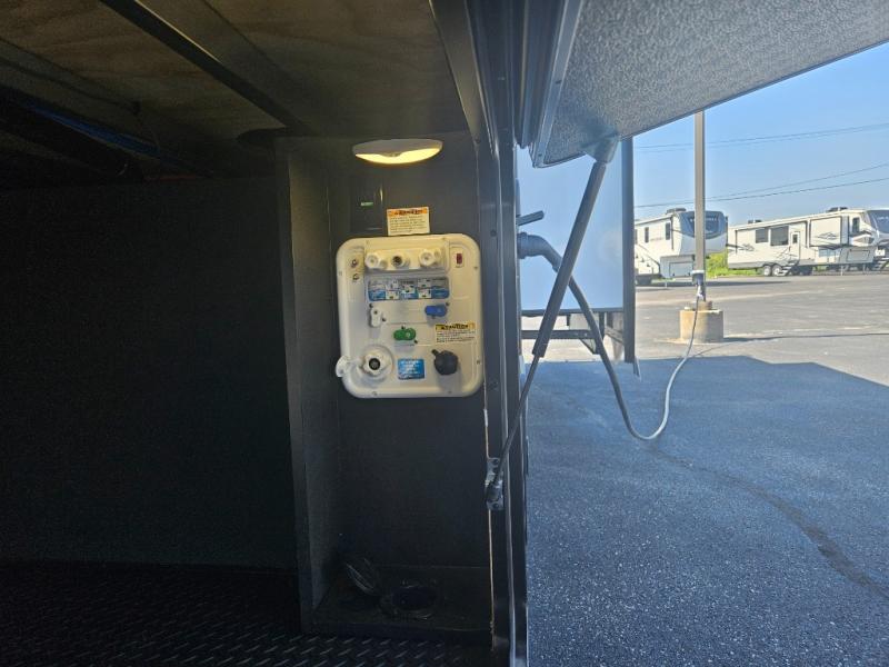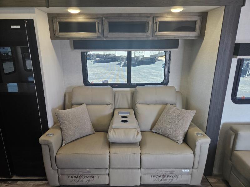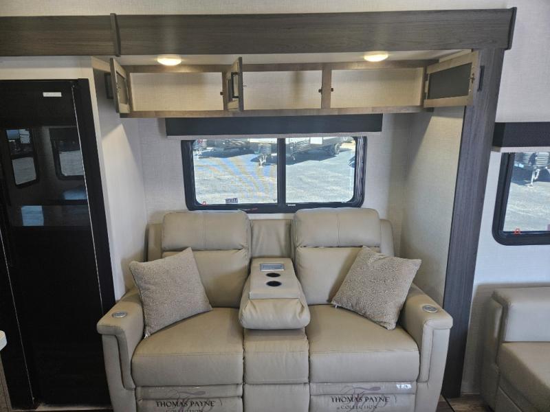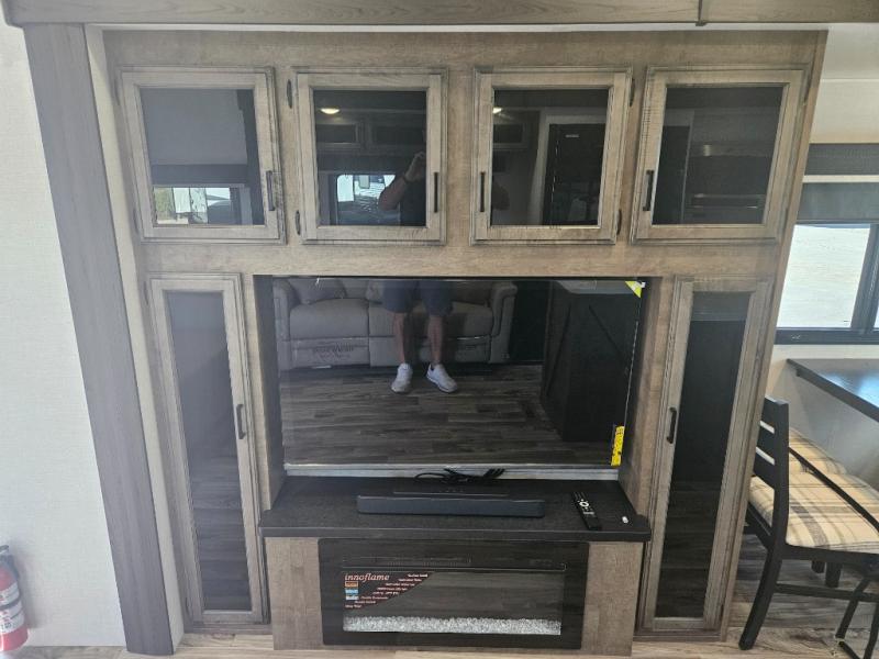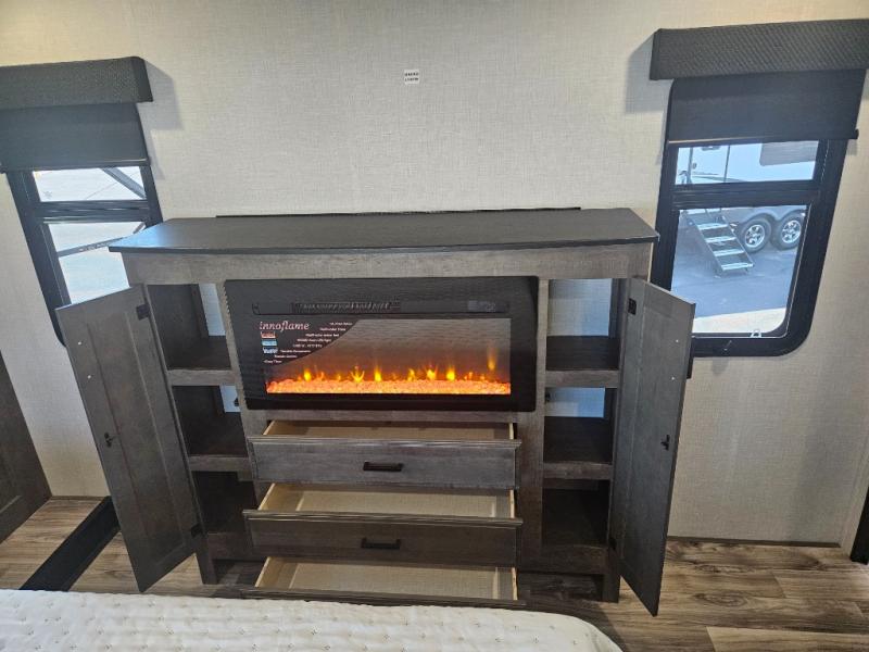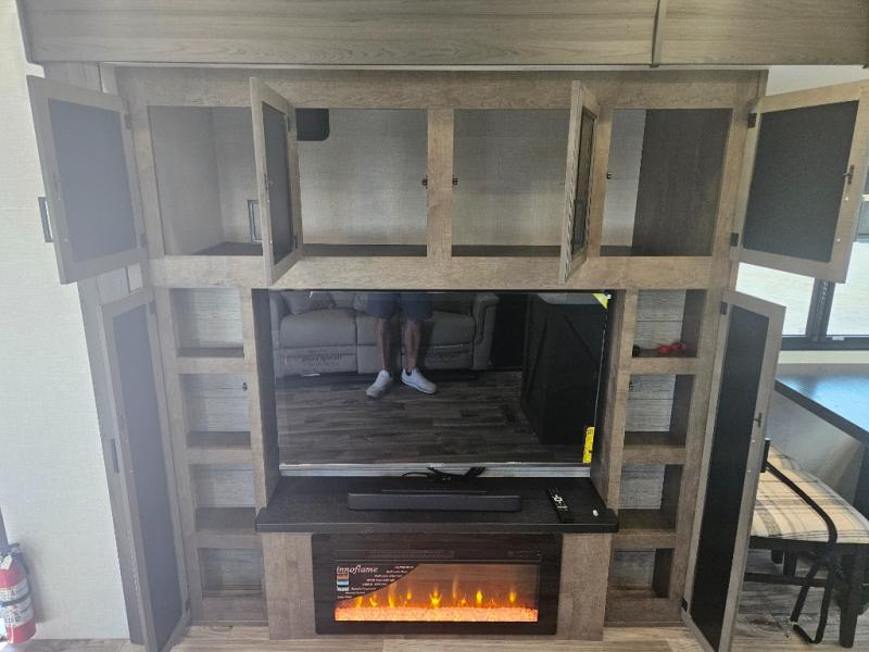 Kick back and relax in the cozy living area, complete with theater seating, a tri-fold sleeper sofa, an entertainment center with a large LED TV, and a fireplace for those cooler evenings. The open floorplan and dual opposing slide-outs provide an incredibly roomy interior with residential appeal.