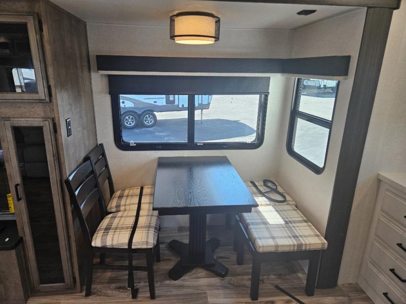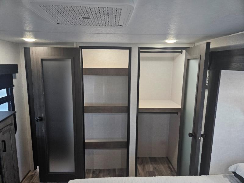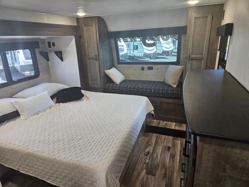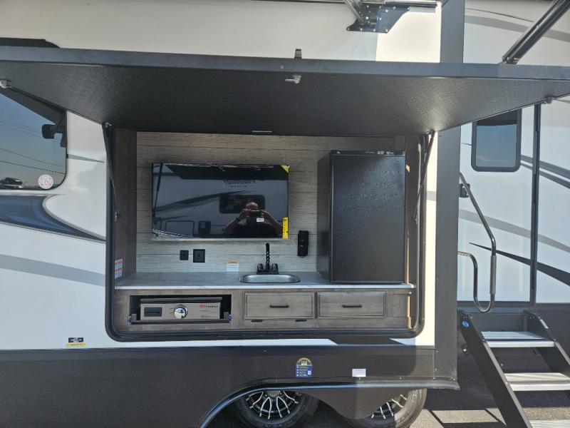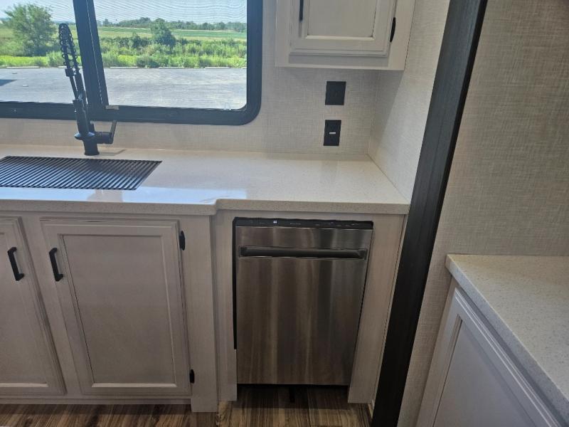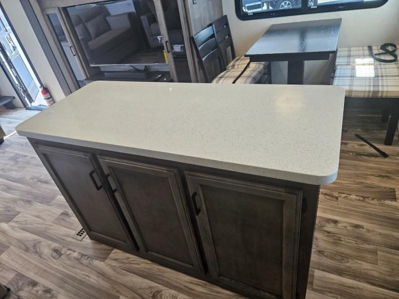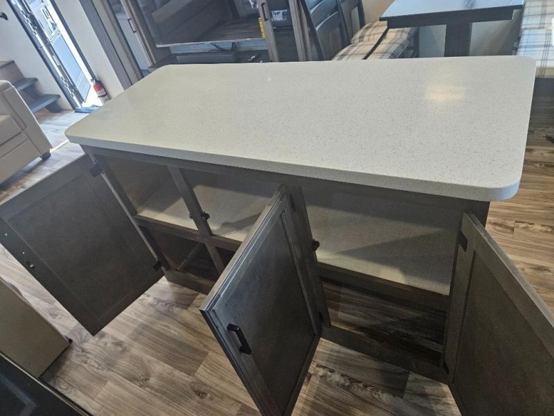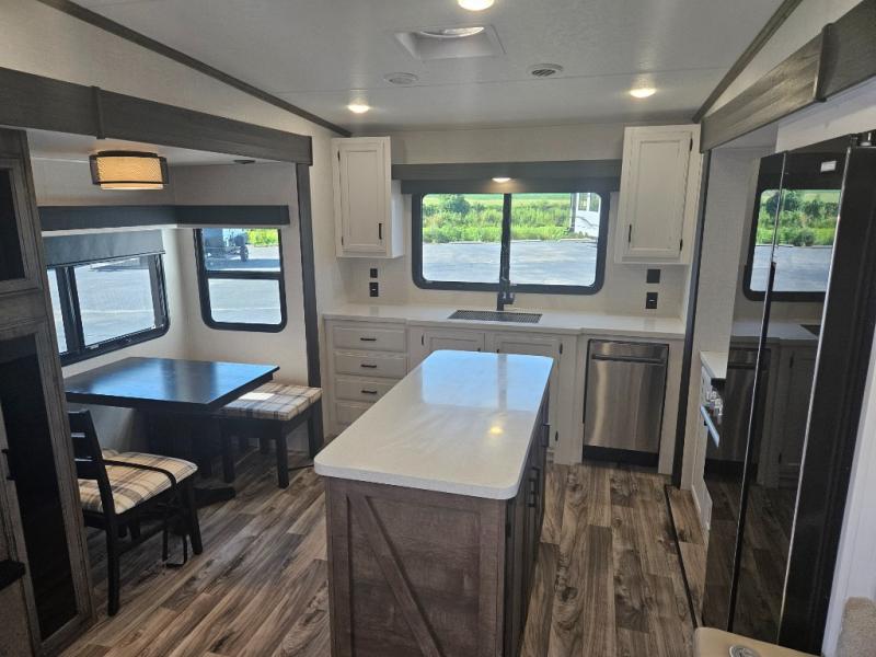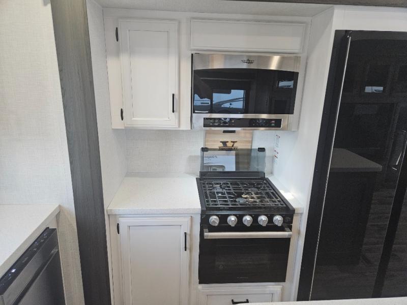 The 353VRK stands out with its beautifully designed rear kitchen layout. Enjoy solid surface countertops, stainless steel appliances, a large refrigerator, microwave, oven, and generous pantry space. The wraparound counter gives you tons of room to prep meals and entertain, while large windows keep the space bright and inviting.