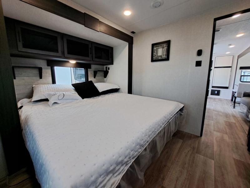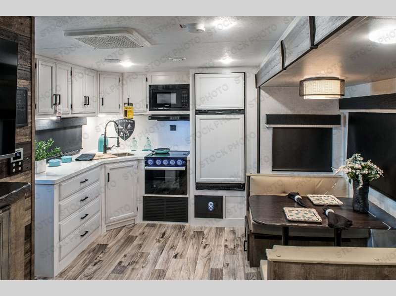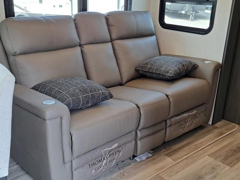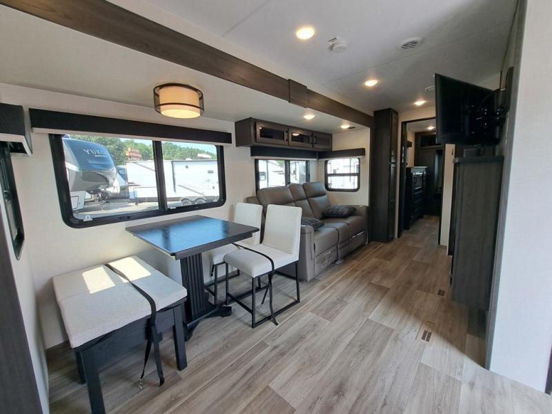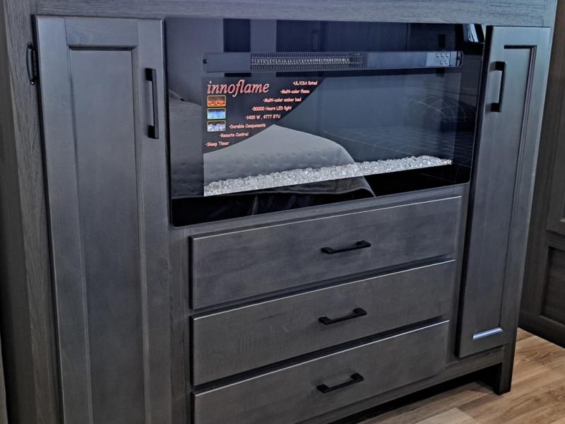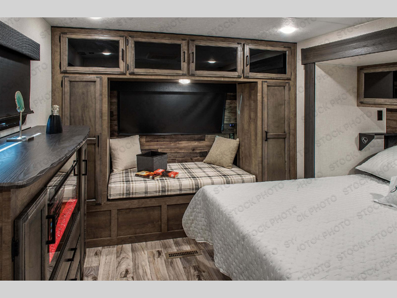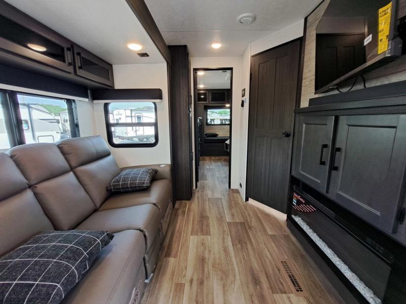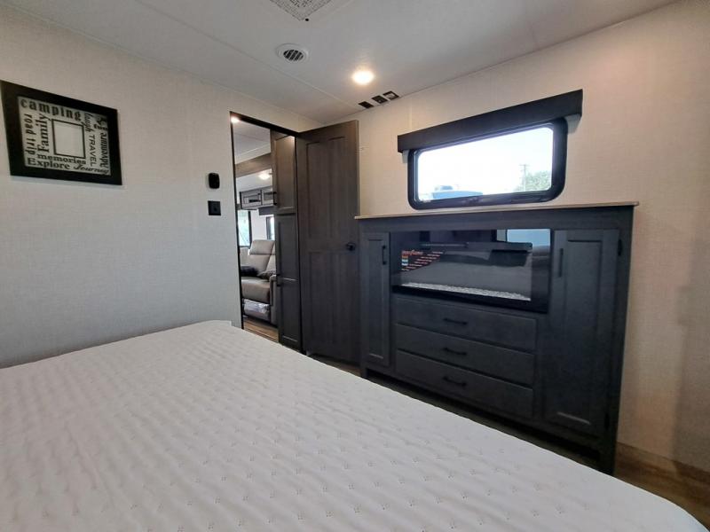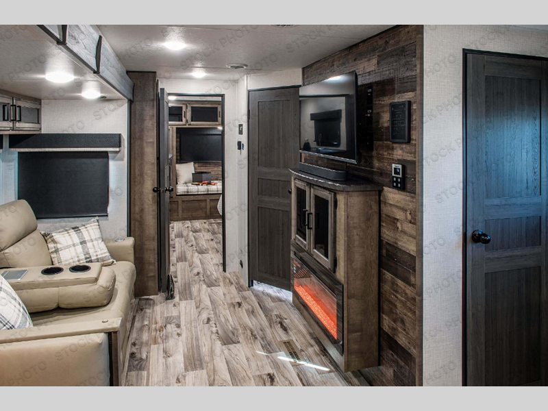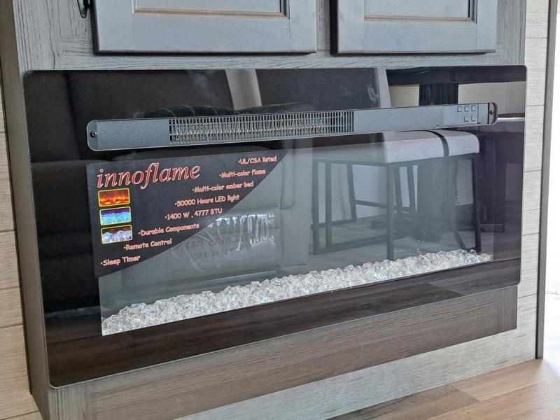 This travel trailer is perfect for two people who want to escape from everyday life! The front private bedroom has a 70" x 80" Sleep Tight king bed slide for more interior space, a dresser with a 30" frameless fireplace and TV, and a window seat to read a book with a view. Freshen up each morning in the full bathroom with the 30" x 36" shower then head to the rear kitchen to fry up some eggs on the three burner cooktop. The 42" grand dinette offers a comfortable place to enjoy your meals, play card games, and even transform into an extra sleeping space. Grab a snack from the walk-in pantry and relax on the 70" tri-fold sofa across from the entertainment center with a 30" frameless fireplace!