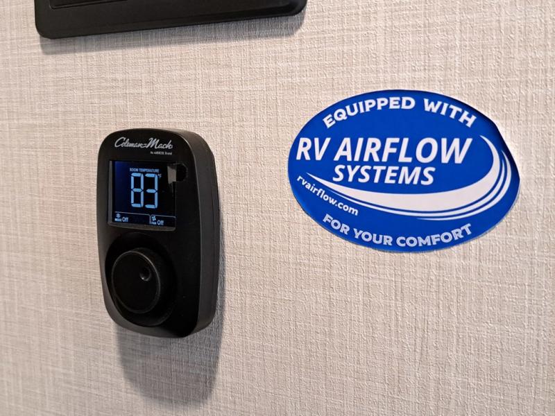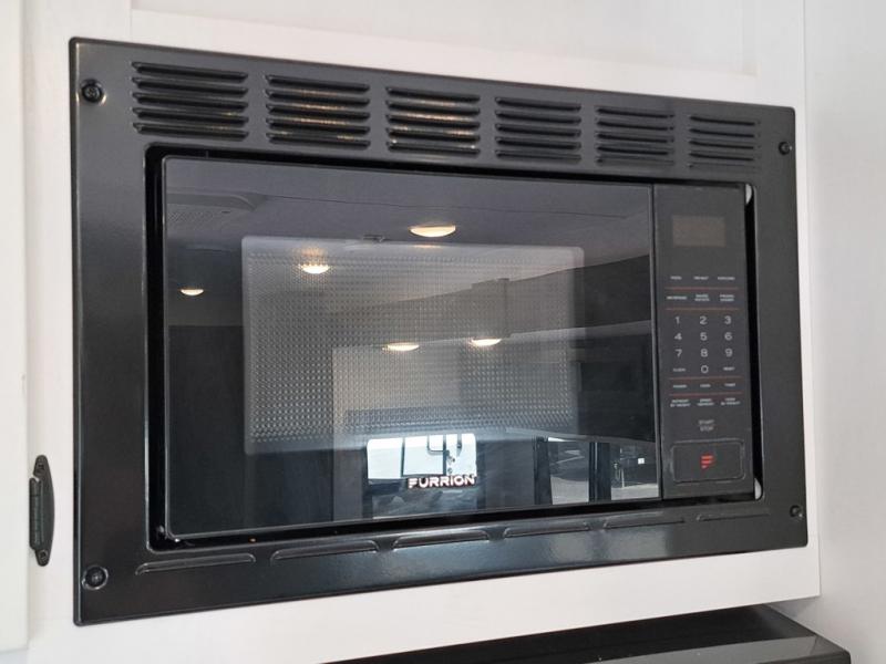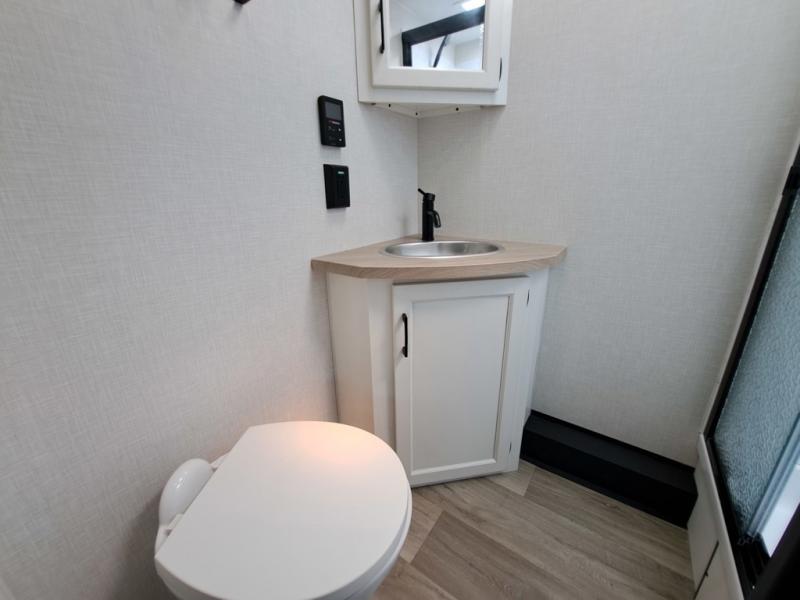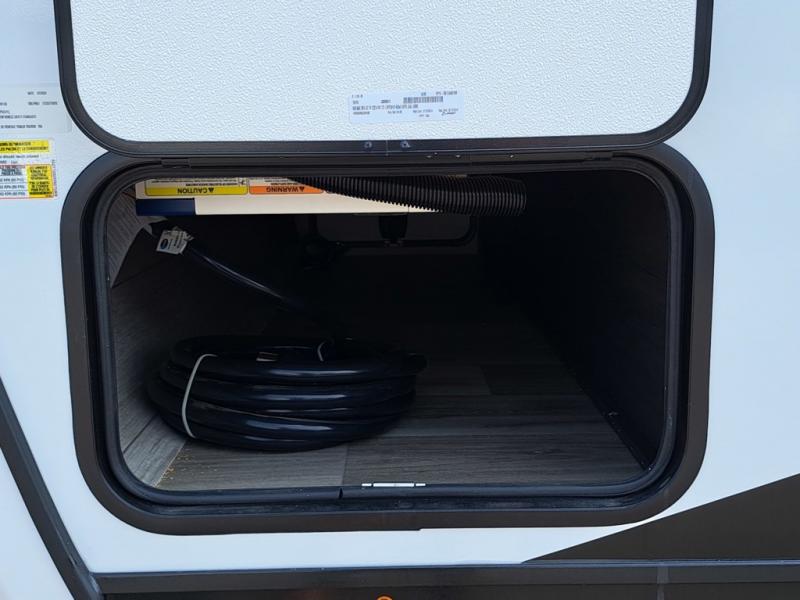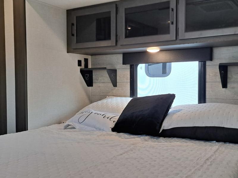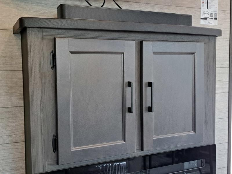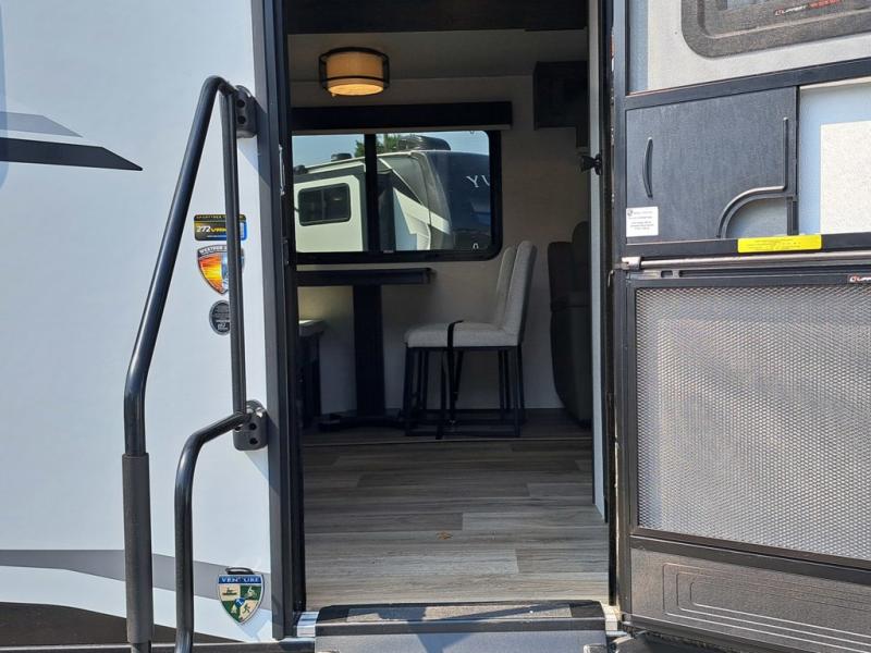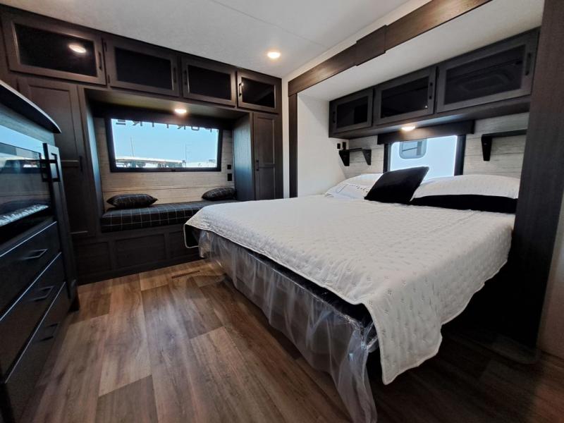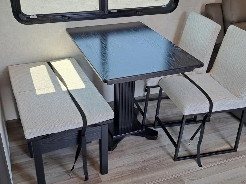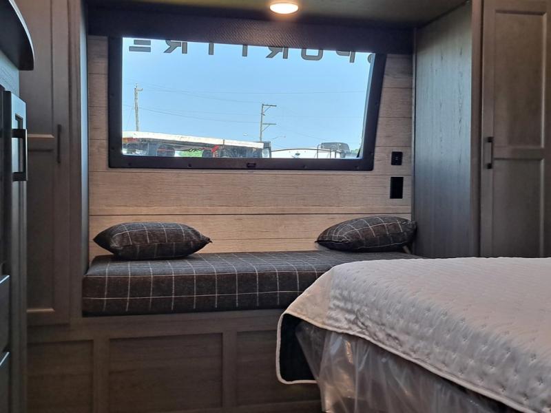 This travel trailer is perfect for two people who want to escape from everyday life! The front private bedroom has a 70" x 80" Sleep Tight king bed slide for more interior space, a dresser with a 30" frameless fireplace and TV, and a window seat to read a book with a view. Freshen up each morning in the full bathroom with the 30" x 36" shower then head to the rear kitchen to fry up some eggs on the three burner cooktop. The 42" grand dinette offers a comfortable place to enjoy your meals, play card games, and even transform into an extra sleeping space. Grab a snack from the walk-in pantry and relax on the 70" tri-fold sofa across from the entertainment center with a 30" frameless fireplace!