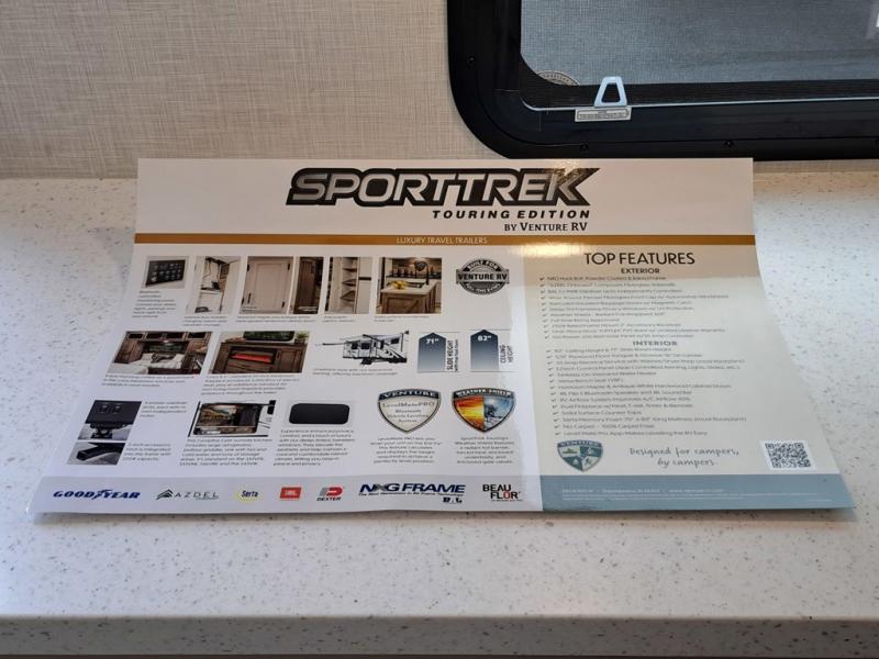 An elegant design and new features come with every one of these Venture RV SportTrek Touring Edition travel trailers! The NXG Huck bolt frame holds these units together and a walkable roof covers them. Heads will turn down the highway and at the campsite with an upgraded graphics package and a painted fiberglass front cap with integrated LED light. The exterior pass-through storage area has slam latch baggage doors with magnetic catches so you don't have to worry about them closing on you and a motion activated light to see your items clearly even at night. Luxury abounds throughout these units, especially with the mandatory Interior Luxury package which comes with solid surface kitchen countertops, designer valances with fabric nightshades, two 30" frameless fireplaces, and Beauflor wood plank flooring that is easy to clean. Come find your favorite model today!