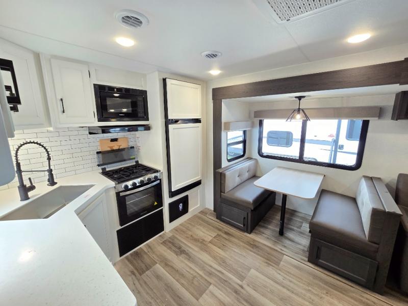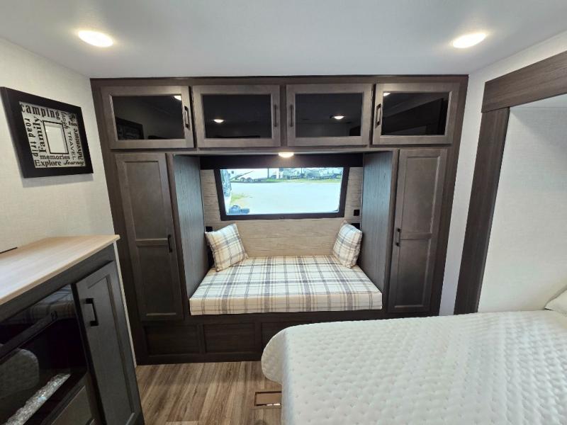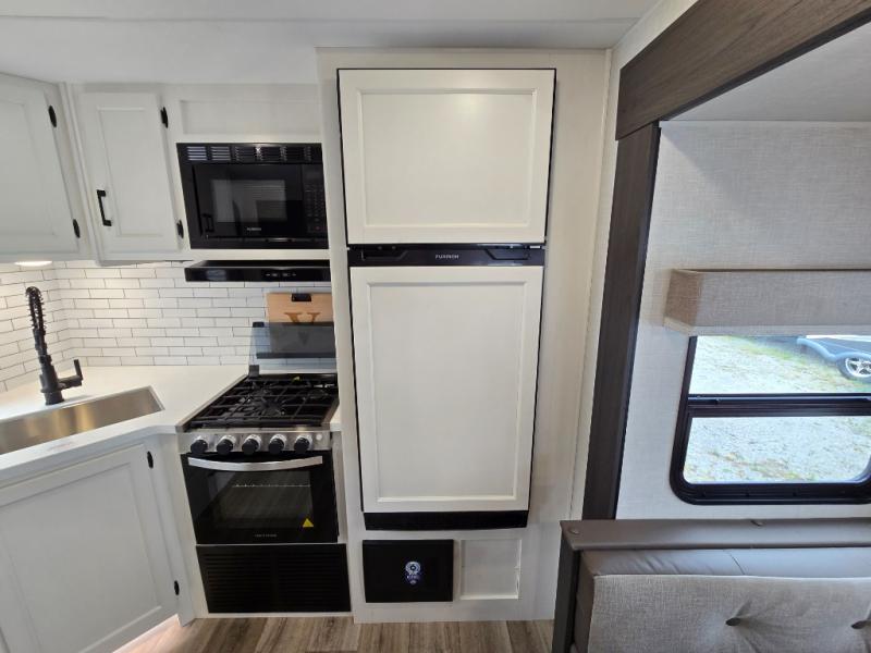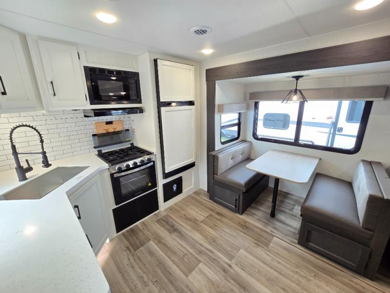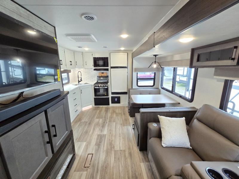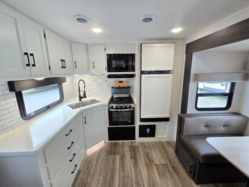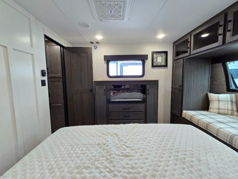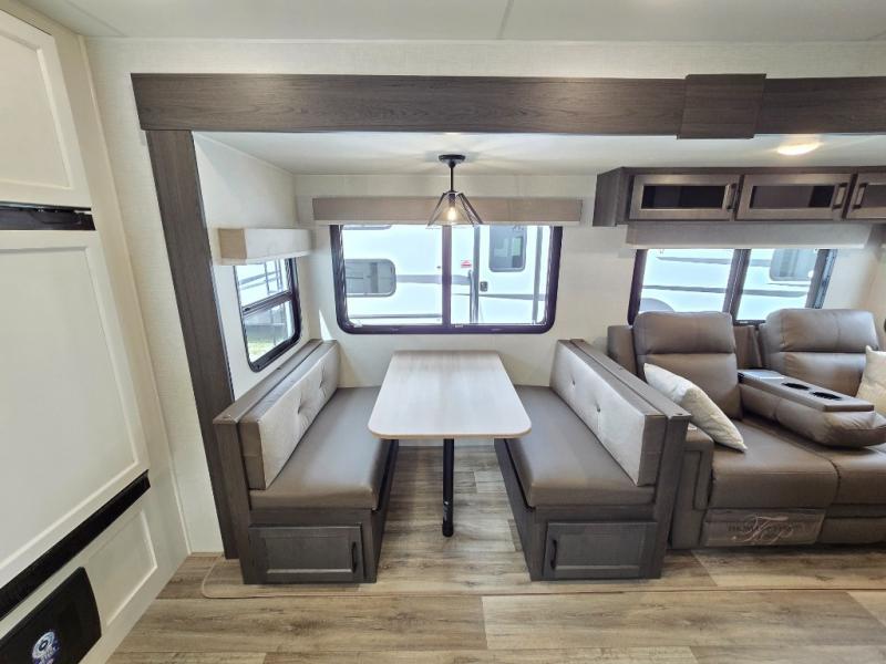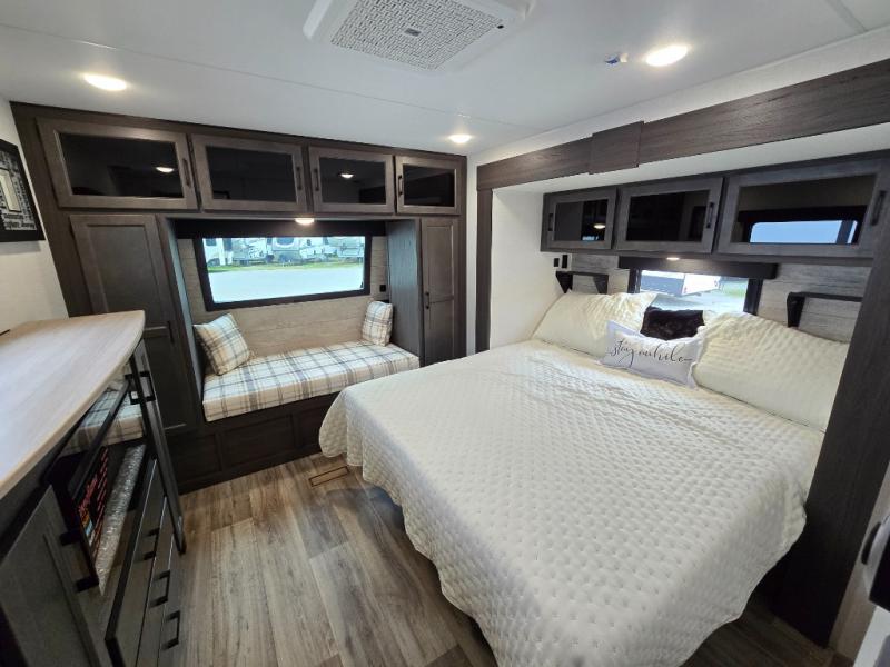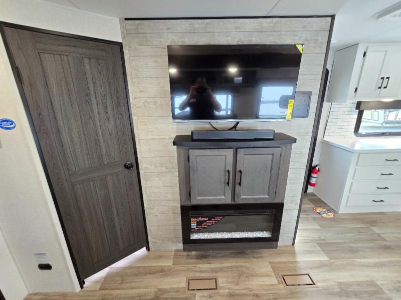 This travel trailer is perfect for two people who want to escape from everyday life! The front private bedroom has a 70" x 80" Sleep Tight king bed slide for more interior space, a dresser with a 30" frameless fireplace and TV, and a window seat to read a book with a view. Freshen up each morning in the full bathroom with the 30" x 36" shower then head to the rear kitchen to fry up some eggs on the three burner cooktop. The Sit N' Slide table offers a comfortable place to enjoy your meals, play card games, and even transform into an extra sleeping space. Grab a snack from the walk-in pantry and relax on the 70" tri-fold sofa across from the entertainment center with a 30" frameless fireplace!
