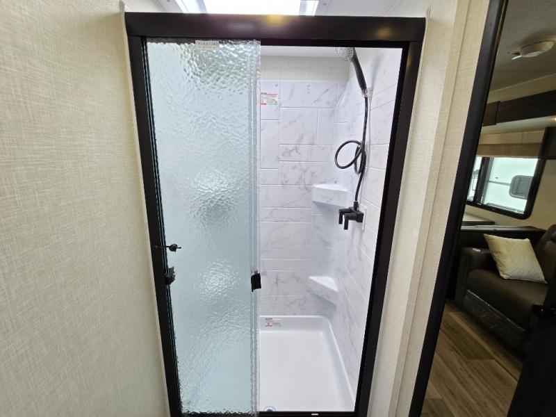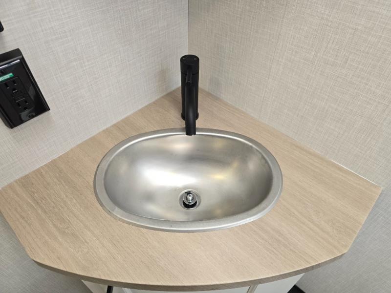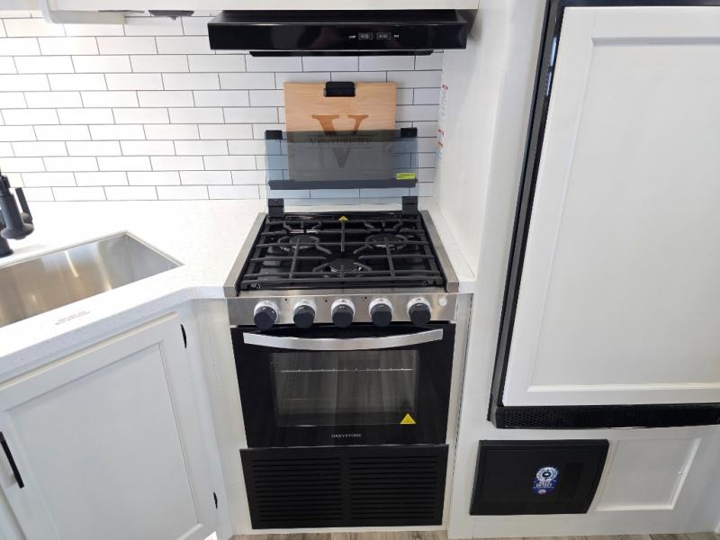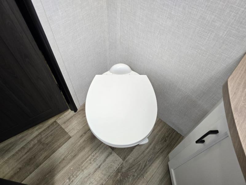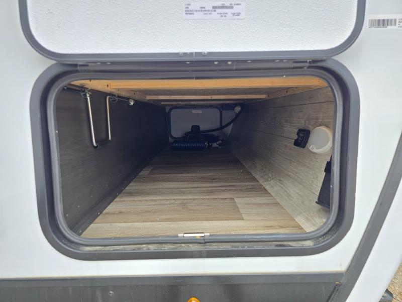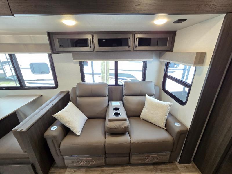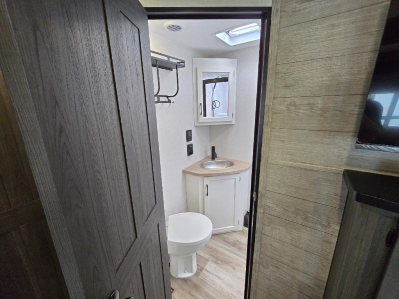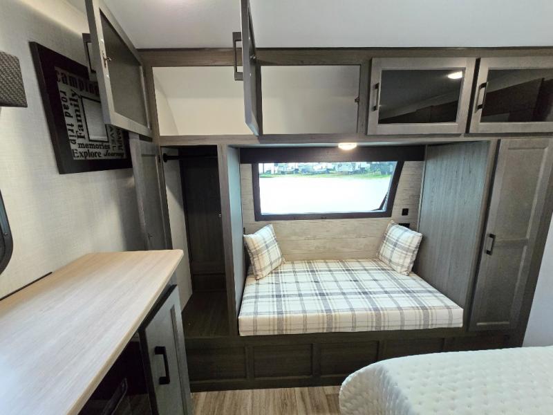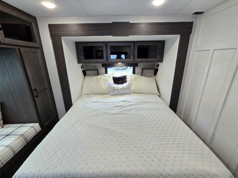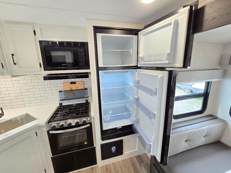 This travel trailer is perfect for two people who want to escape from everyday life! The front private bedroom has a 70" x 80" Sleep Tight king bed slide for more interior space, a dresser with a 30" frameless fireplace and TV, and a window seat to read a book with a view. Freshen up each morning in the full bathroom with the 30" x 36" shower then head to the rear kitchen to fry up some eggs on the three burner cooktop. The Sit N' Slide table offers a comfortable place to enjoy your meals, play card games, and even transform into an extra sleeping space. Grab a snack from the walk-in pantry and relax on the 70" tri-fold sofa across from the entertainment center with a 30" frameless fireplace!