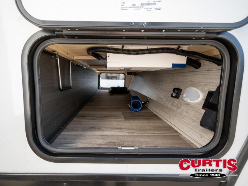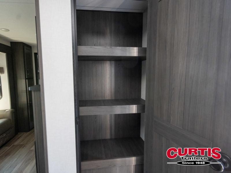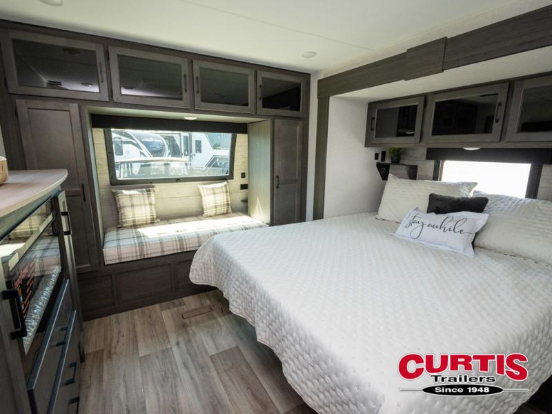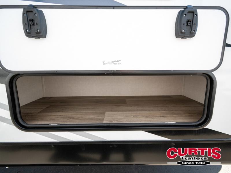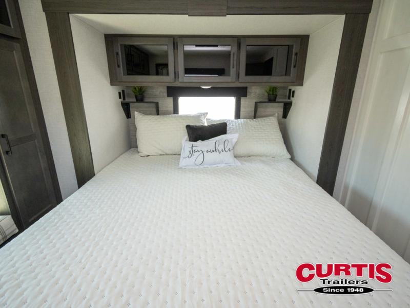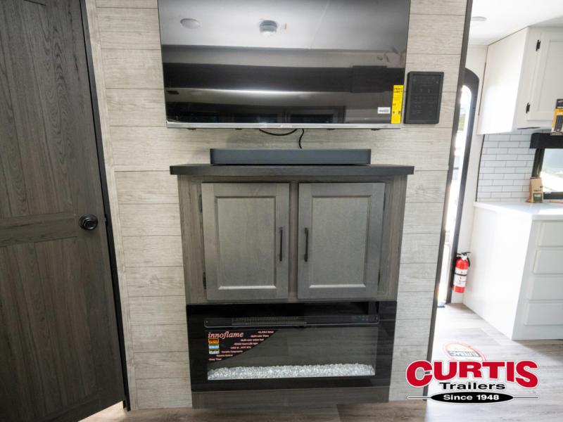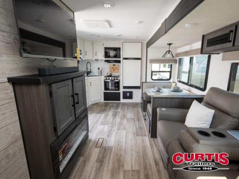 This travel trailer is perfect for two people who want to escape from everyday life! The front private bedroom has a 70" x 80" Sleep Tight king bed slide for more interior space, a dresser with a 30" frameless fireplace and TV, and a window seat to read a book with a view. Freshen up each morning in the full bathroom with the 30" x 36" shower then head to the rear kitchen to fry up some eggs on the three burner cooktop. The Sit N' Slide table offers a comfortable place to enjoy your meals, play card games, and even transform into an extra sleeping space. Grab a snack from the walk-in pantry and relax on the 70" tri-fold sofa across from the entertainment center with a 30" frameless fireplace!