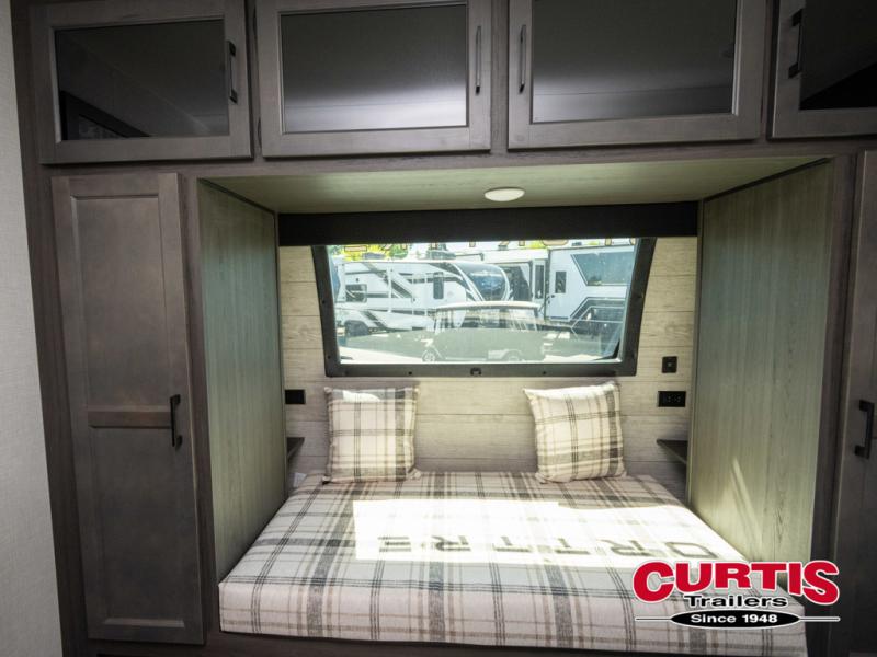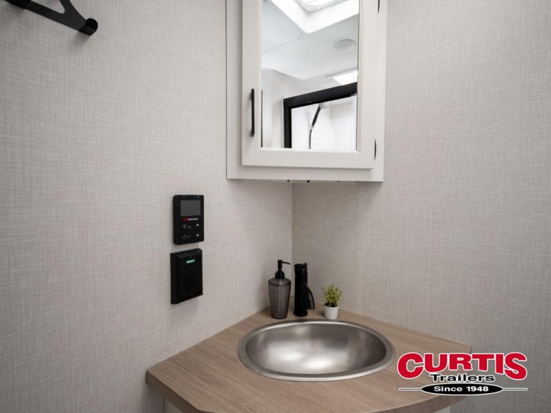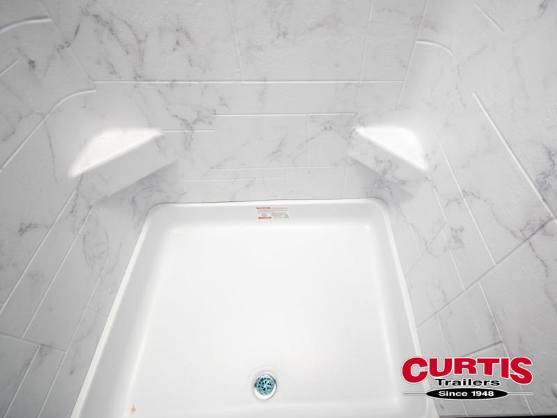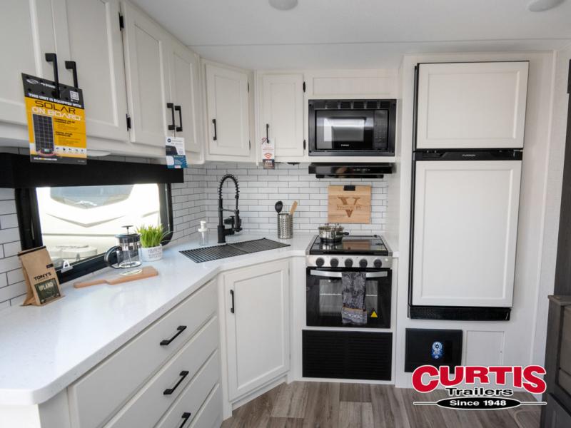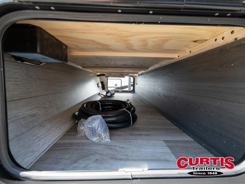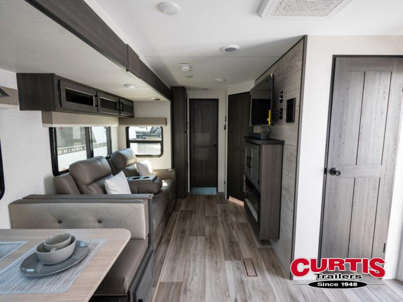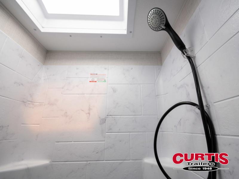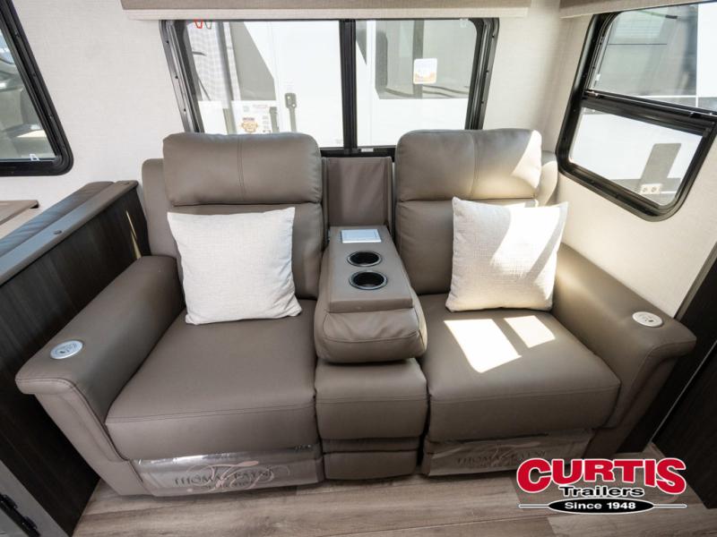 This travel trailer is perfect for two people who want to escape from everyday life! The front private bedroom has a 70" x 80" Sleep Tight king bed slide for more interior space, a dresser with a 30" frameless fireplace and TV, and a window seat to read a book with a view. Freshen up each morning in the full bathroom with the 30" x 36" shower then head to the rear kitchen to fry up some eggs on the three burner cooktop. The Sit N' Slide table offers a comfortable place to enjoy your meals, play card games, and even transform into an extra sleeping space. Grab a snack from the walk-in pantry and relax on the 70" tri-fold sofa across from the entertainment center with a 30" frameless fireplace!