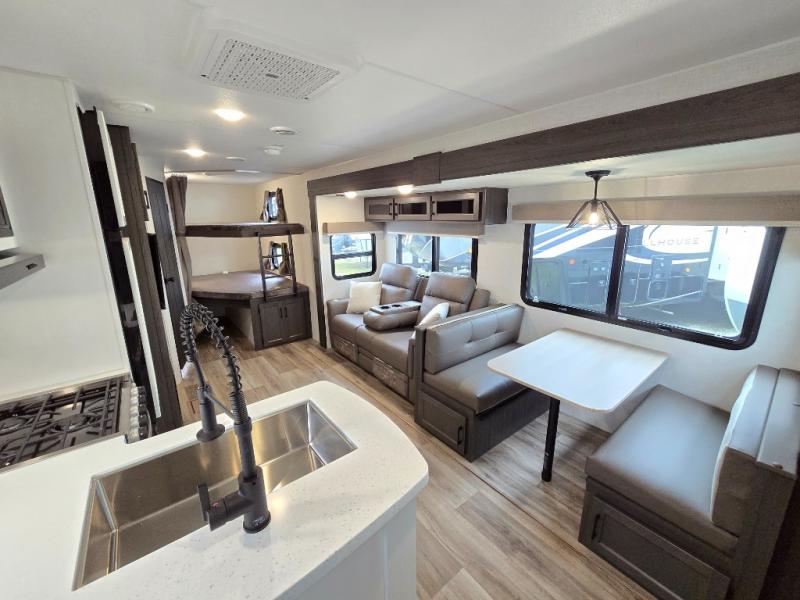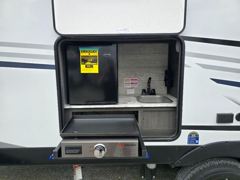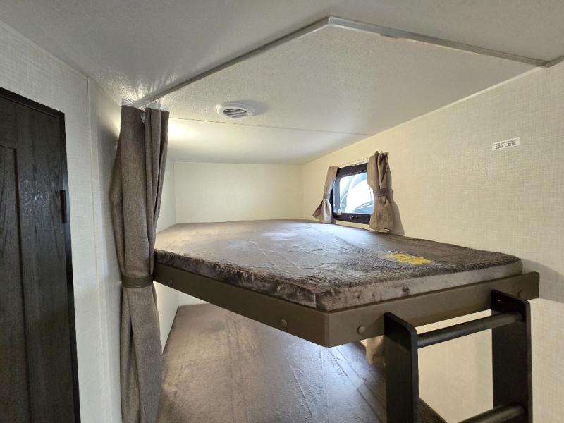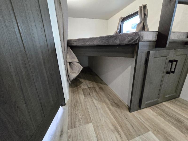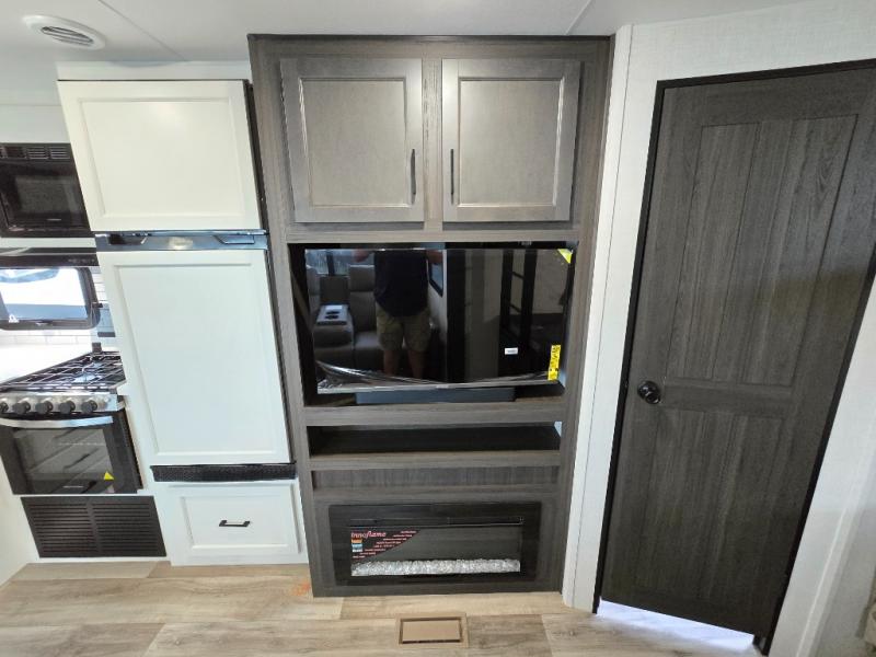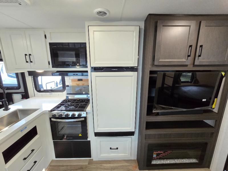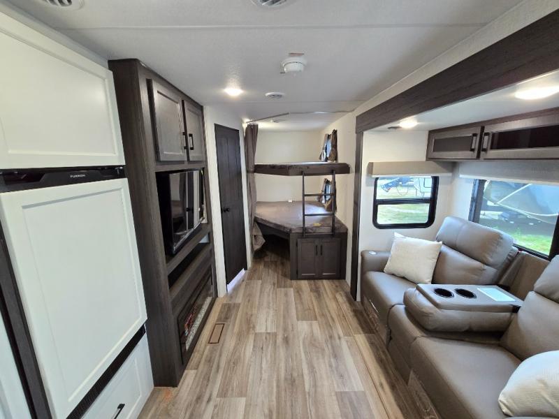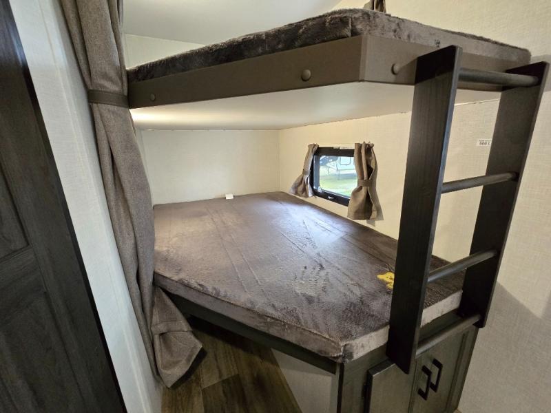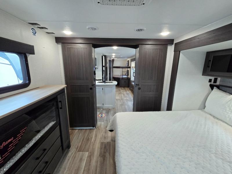 You will experience a smooth flow of traffic in and out of this travel trailer with dual entry doors! One of the entrances even leads directly into the rear corner bathroom so you can get back to having fun outside fast. The 51" x 75" double-size bunk beds are right next to the bathroom so those sleeping on them don't have to go far to freshen up in the 30" x 36" shower. You will enjoy your own privacy with the front private bedroom which has a 70" x 80" sleep tight king bed slide across from a dresser with a TV and a 30" frameless fireplace, plus a window seat with wardrobes and shelves on either side to hang your clothes and place your books. Just outside the sliding doors to the bedroom is a closet on one side and a pantry on the other. The chef will love being able to cook in the great outdoors with the exterior campfire café with a refrigerator, a sink, and a griddle for a sunrise breakfast!