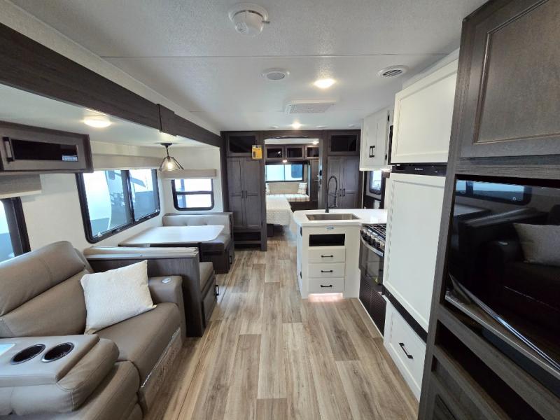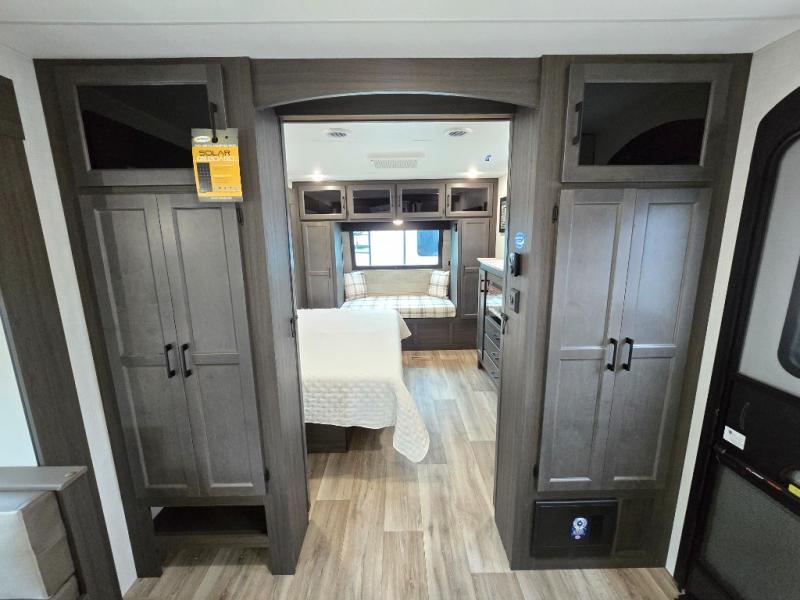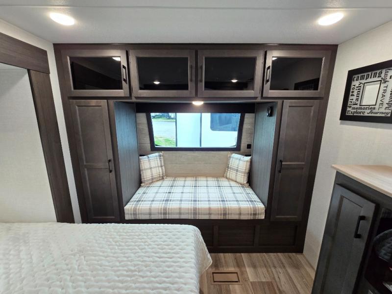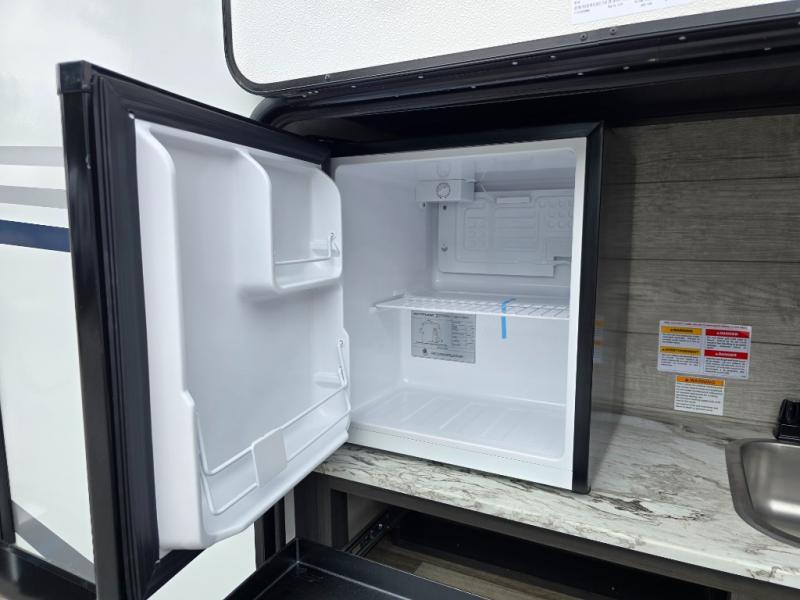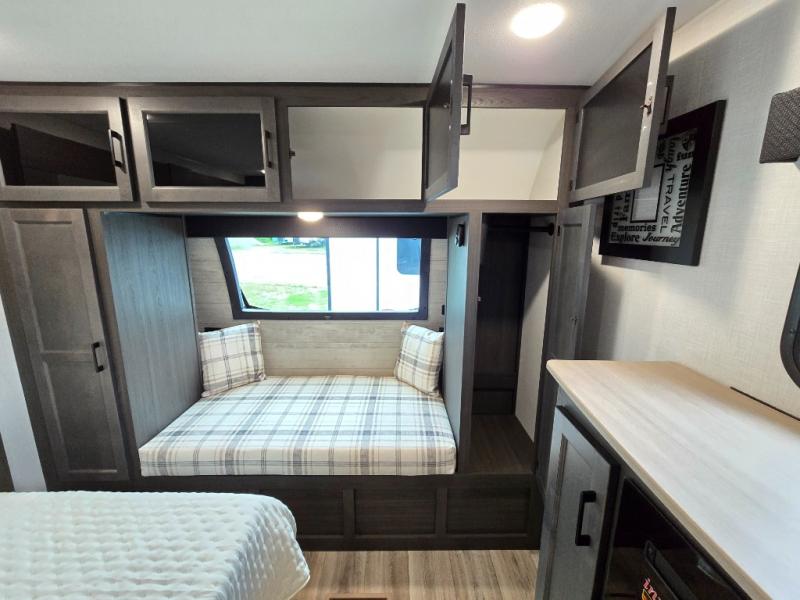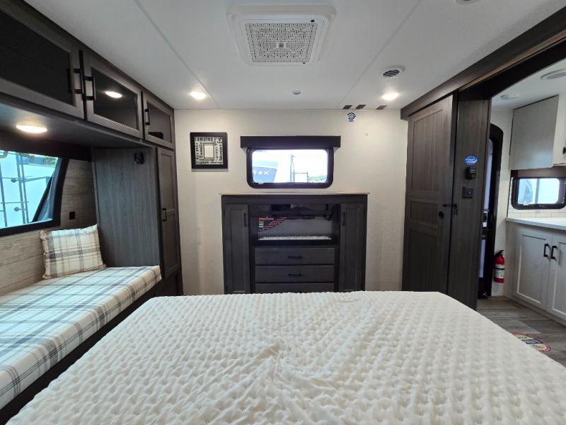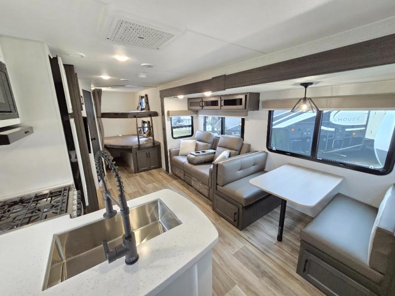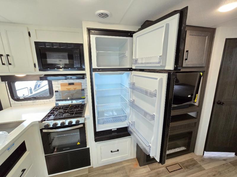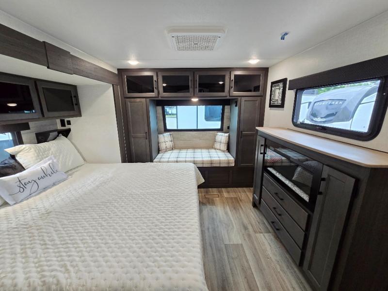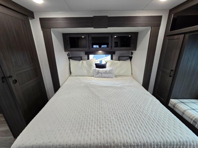 You will experience a smooth flow of traffic in and out of this travel trailer with dual entry doors! One of the entrances even leads directly into the rear corner bathroom so you can get back to having fun outside fast. The 51" x 75" double-size bunk beds are right next to the bathroom so those sleeping on them don't have to go far to freshen up in the 30" x 36" shower. You will enjoy your own privacy with the front private bedroom which has a 70" x 80" sleep tight king bed slide across from a dresser with a TV and a 30" frameless fireplace, plus a window seat with wardrobes and shelves on either side to hang your clothes and place your books. Just outside the sliding doors to the bedroom is a closet on one side and a pantry on the other. The chef will love being able to cook in the great outdoors with the exterior campfire café with a refrigerator, a sink, and a griddle for a sunrise breakfast!
