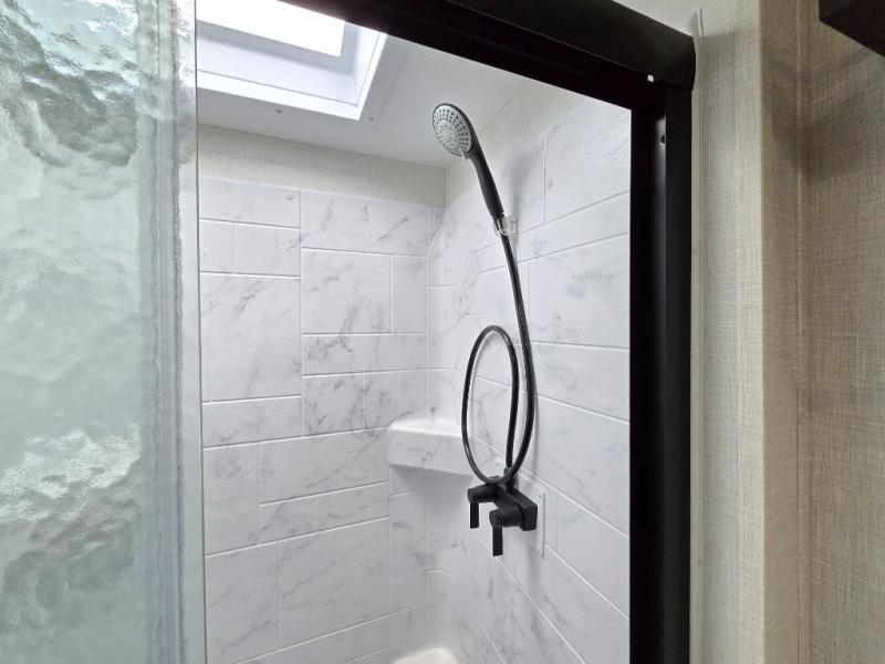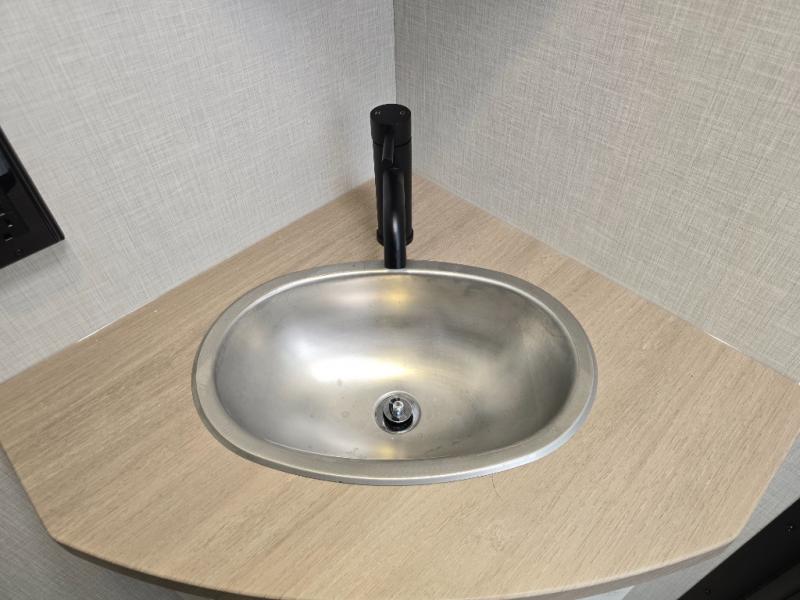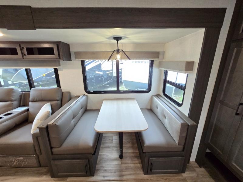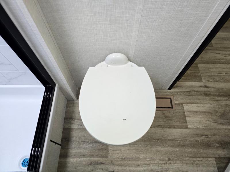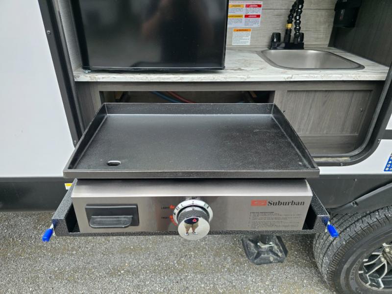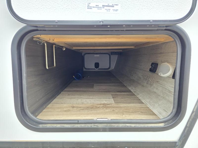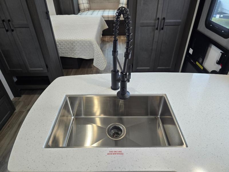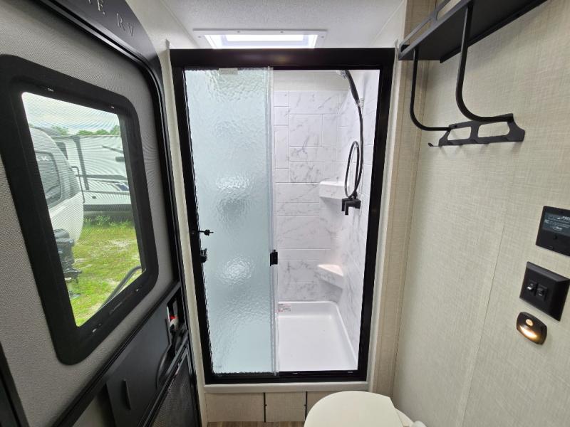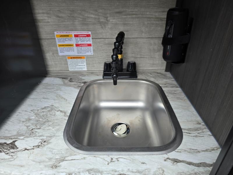 You will experience a smooth flow of traffic in and out of this travel trailer with dual entry doors! One of the entrances even leads directly into the rear corner bathroom so you can get back to having fun outside fast. The 51" x 75" double-size bunk beds are right next to the bathroom so those sleeping on them don't have to go far to freshen up in the 30" x 36" shower. You will enjoy your own privacy with the front private bedroom which has a 70" x 80" sleep tight king bed slide across from a dresser with a TV and a 30" frameless fireplace, plus a window seat with wardrobes and shelves on either side to hang your clothes and place your books. Just outside the sliding doors to the bedroom is a closet on one side and a pantry on the other. The chef will love being able to cook in the great outdoors with the exterior campfire café with a refrigerator, a sink, and a griddle for a sunrise breakfast!