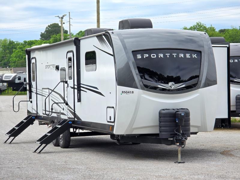 An elegant design and new features come with every one of these Venture RV SportTrek Touring Edition travel trailers! The NXG Huck bolt frame holds these units together and a walkable roof covers them. Heads will turn down the highway and at the campsite with an upgraded graphics package and a painted fiberglass front cap with integrated LED light. The exterior pass-through storage area has slam latch baggage doors with magnetic catches so you don't have to worry about them closing on you and a motion activated light to see your items clearly even at night. Luxury abounds throughout these units, especially with the mandatory Interior Luxury package which comes with solid surface kitchen countertops, designer valances with fabric nightshades, two 30" frameless fireplaces, and Beauflor wood plank flooring that is easy to clean. Come find your favorite model today!