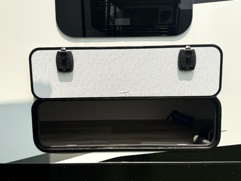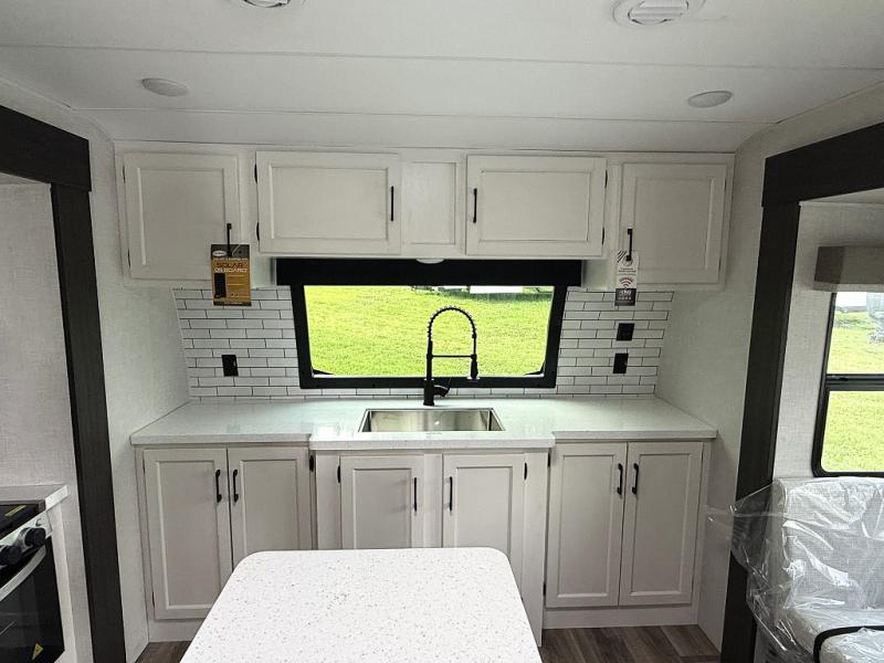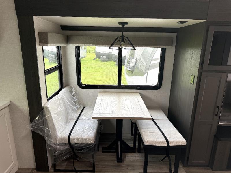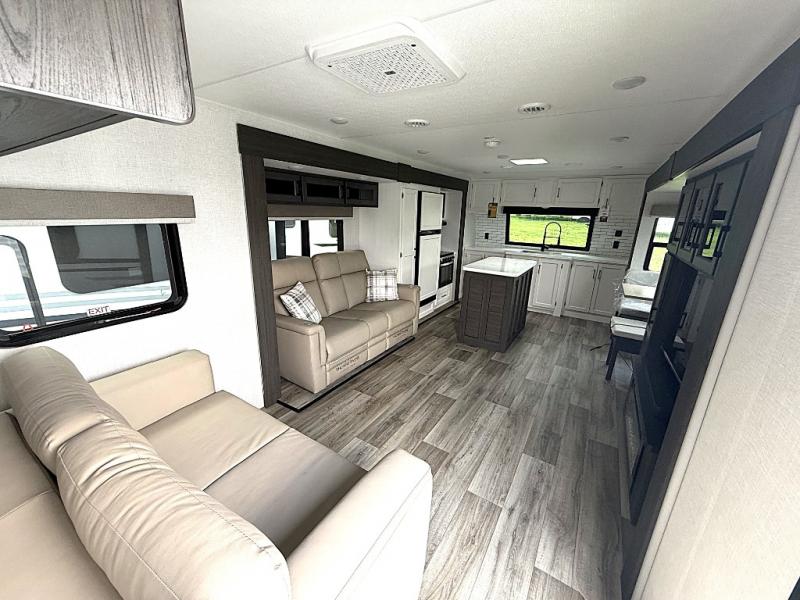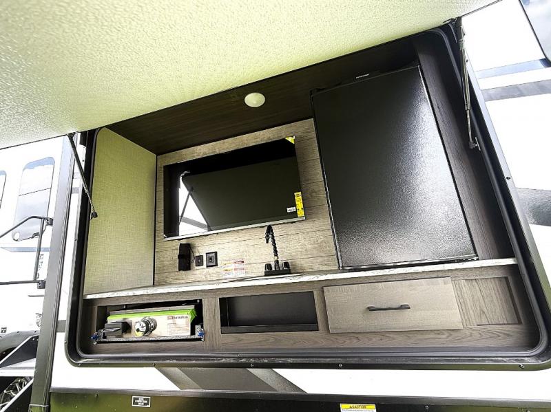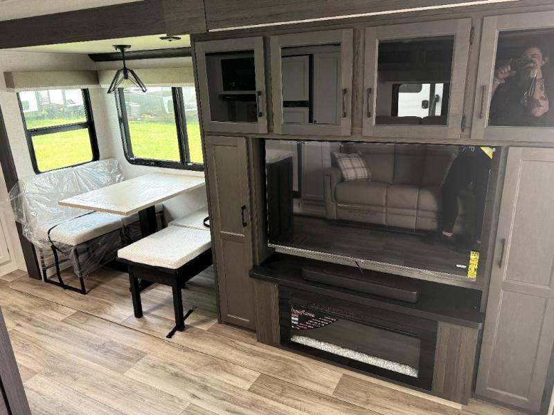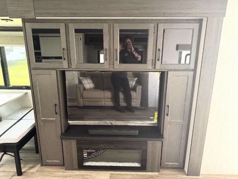 Comfort and convenience is what you will find all throughout this travel trailer! The front kitchen has a large single-bowl under-mount stainless steel sink with lots of countertop space on either side of it, a three burner cooktop, a 10 cu. ft. refrigerator to keep your perishables fresh, a pantry for your snacks, and a kitchen island to make meal prepping even easier. You can enjoy your meals at the table and chairs then relax on either the 64" sofa or theater seating with USB charging ports. You will feel right at home in the rear private bedroom with a 70" x 80" Sleep Tight king bed slide, a dresser with a 30" frameless fireplace, and a wardrobe that is prepped to add an optional washer and dryer, plus you even have an entrance/exit door to the unit with triple pull-out aluminum steps. There is an exterior campfire café with a refrigerator, a sink with countertop space, and a griddle for juicy burgers!