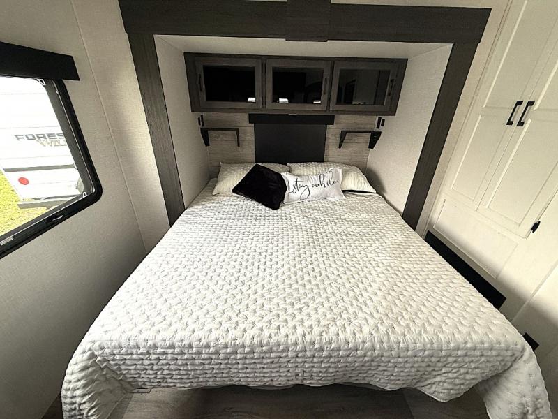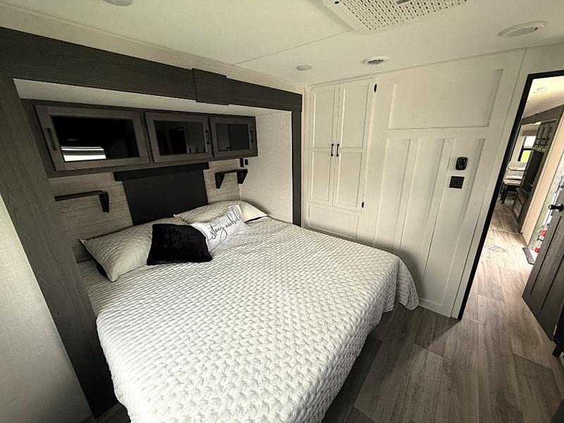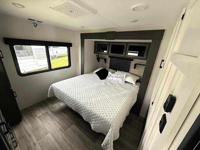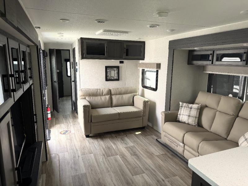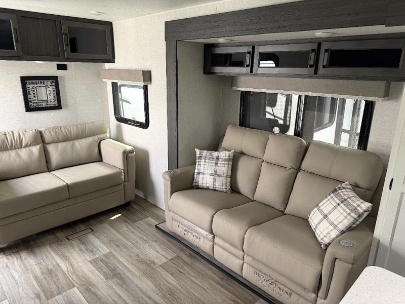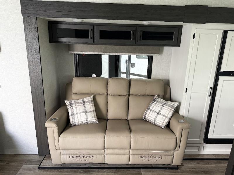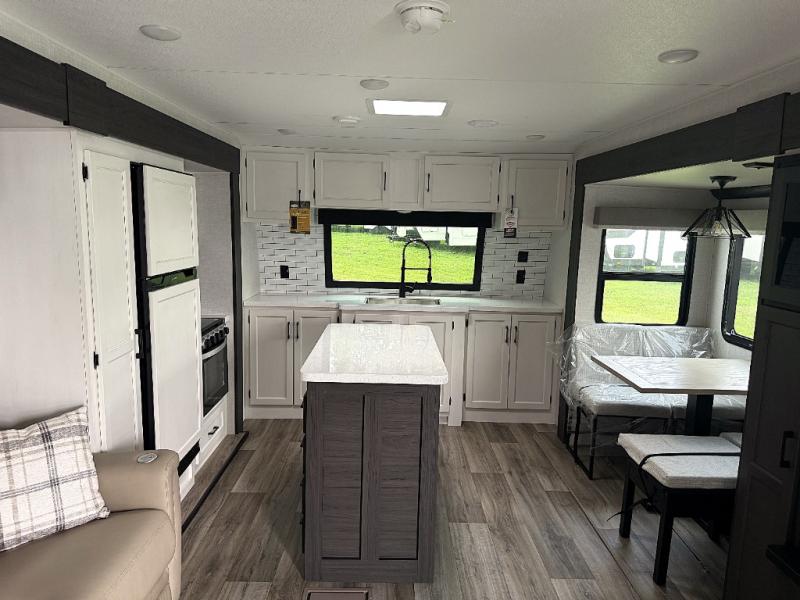 Comfort and convenience is what you will find all throughout this travel trailer! The front kitchen has a large single-bowl under-mount stainless steel sink with lots of countertop space on either side of it, a three burner cooktop, a 10 cu. ft. refrigerator to keep your perishables fresh, a pantry for your snacks, and a kitchen island to make meal prepping even easier. You can enjoy your meals at the table and chairs then relax on either the 64" sofa or theater seating with USB charging ports. You will feel right at home in the rear private bedroom with a 70" x 80" Sleep Tight king bed slide, a dresser with a 30" frameless fireplace, and a wardrobe that is prepped to add an optional washer and dryer, plus you even have an entrance/exit door to the unit with triple pull-out aluminum steps. There is an exterior campfire café with a refrigerator, a sink with countertop space, and a griddle for juicy burgers!