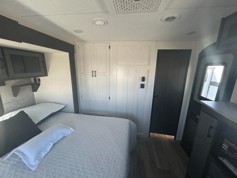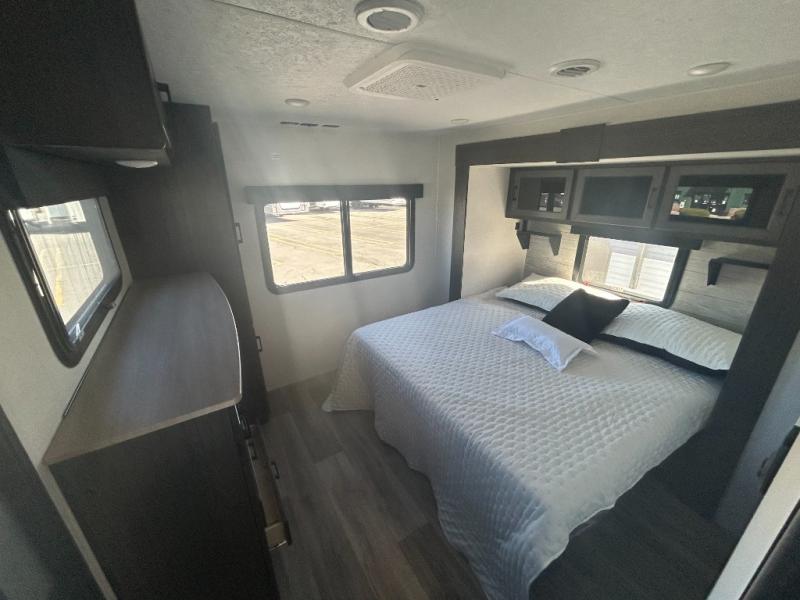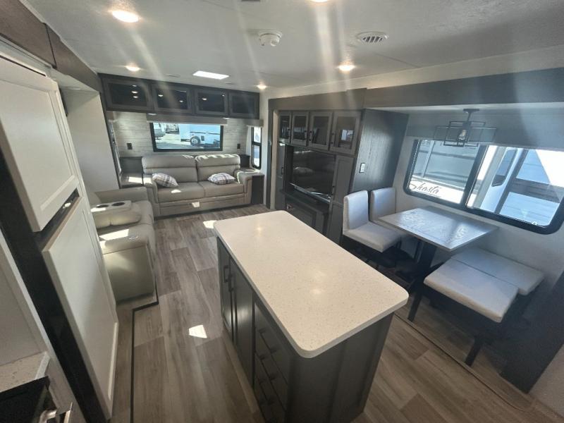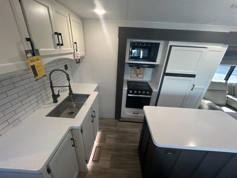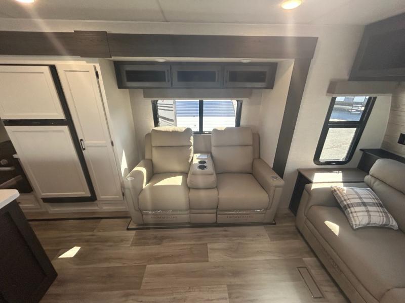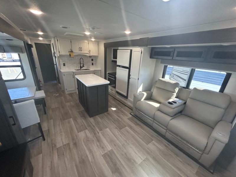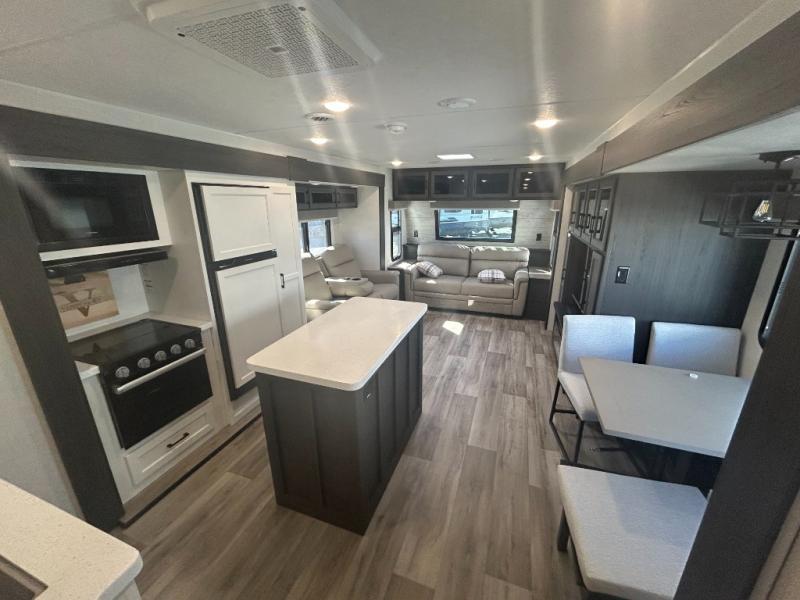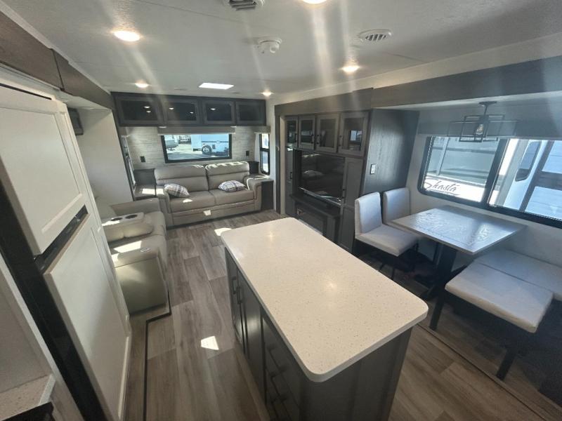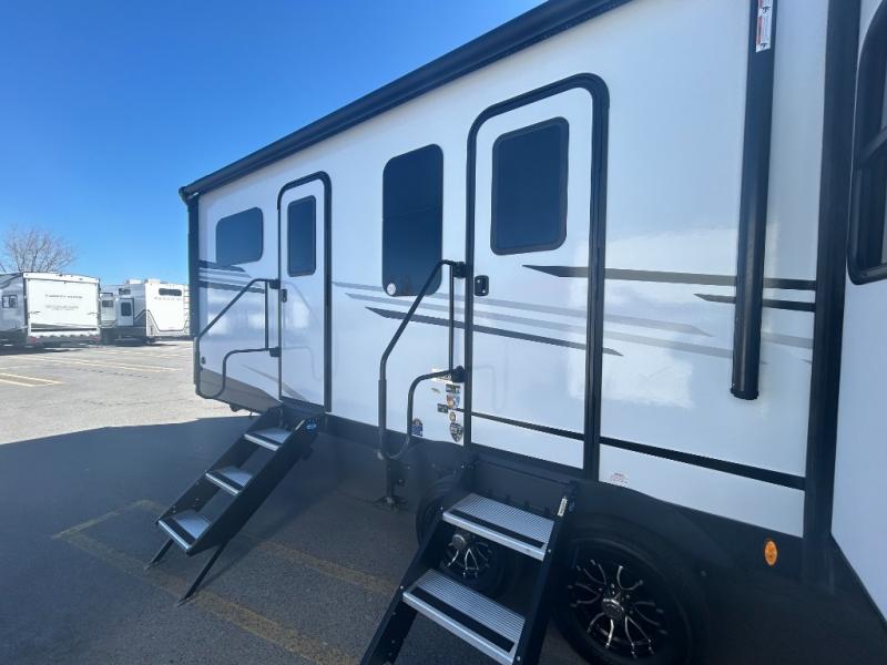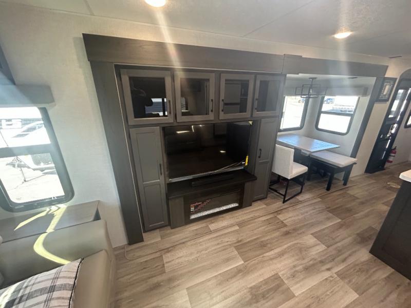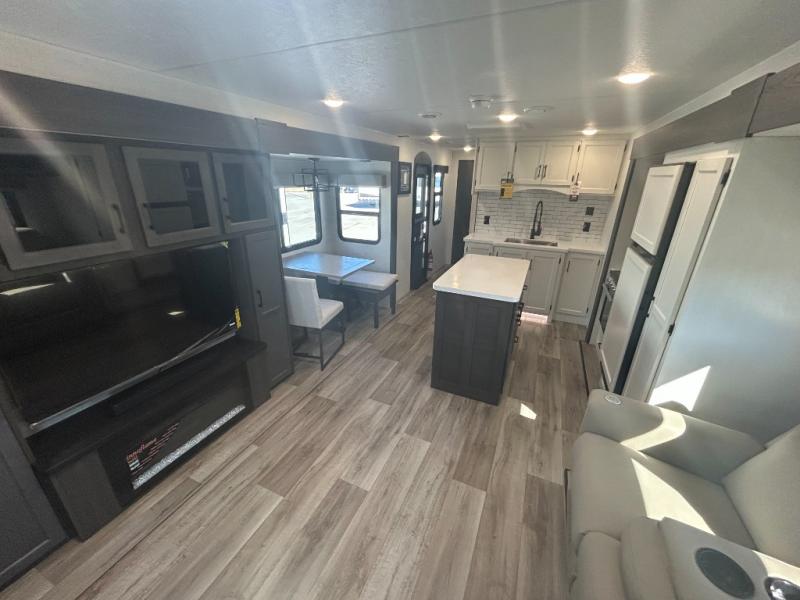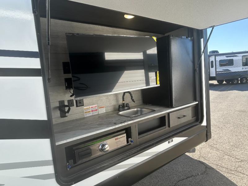 Come see all that this travel trailer has to offer! Relax in true comfort in the front living area with a 70" tri-fold sofa with end tables on either side or in the theater seating across from the entertainment center with a TV and 30" frameless fireplace. The kitchen island will make your meal prepping easier and you can enjoy them at the table and chairs then play a card game or two. You could even cook your meals at the exterior campfire café with a refrigerator, a sink with countertop space, and a griddle. The full bathroom has a 30" x 36" shower for you to freshen up in each morning. Enjoy a good night's rest each night on the 70" x 80" sleep tight king bed slide across from a dresser with a 30" frameless fireplace in the rear private bedroom, plus there is a wardrobe with washer and dryer prep and one of the dual entry doors with triple pull-out aluminum steps!