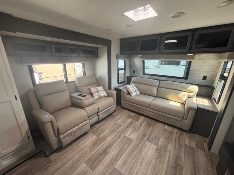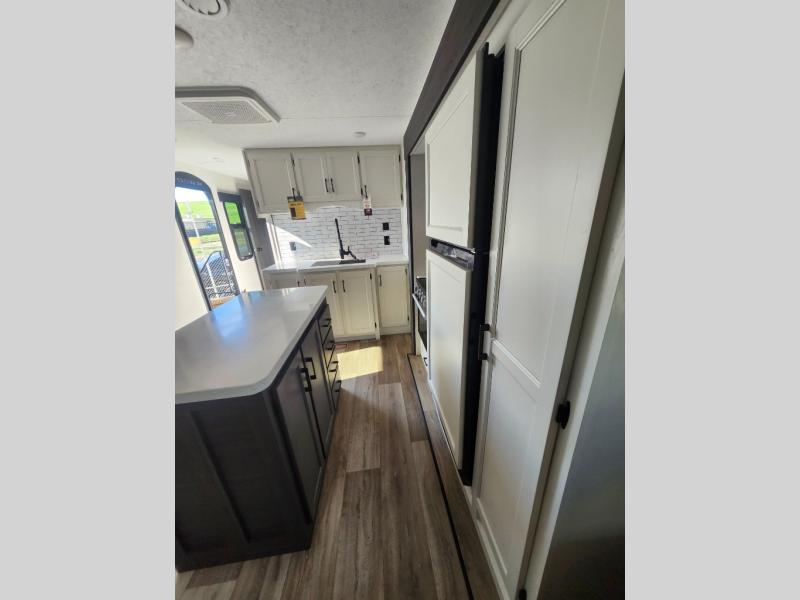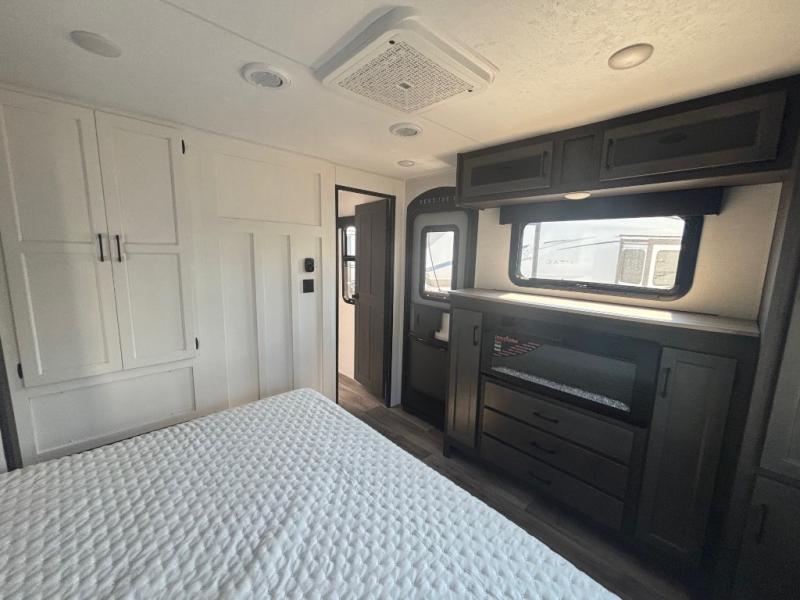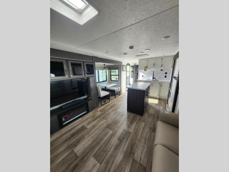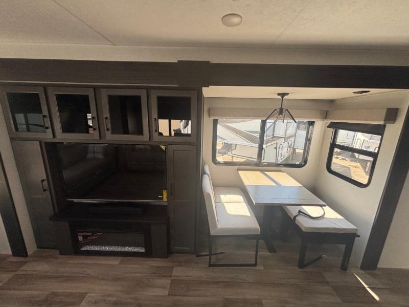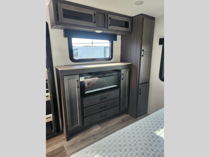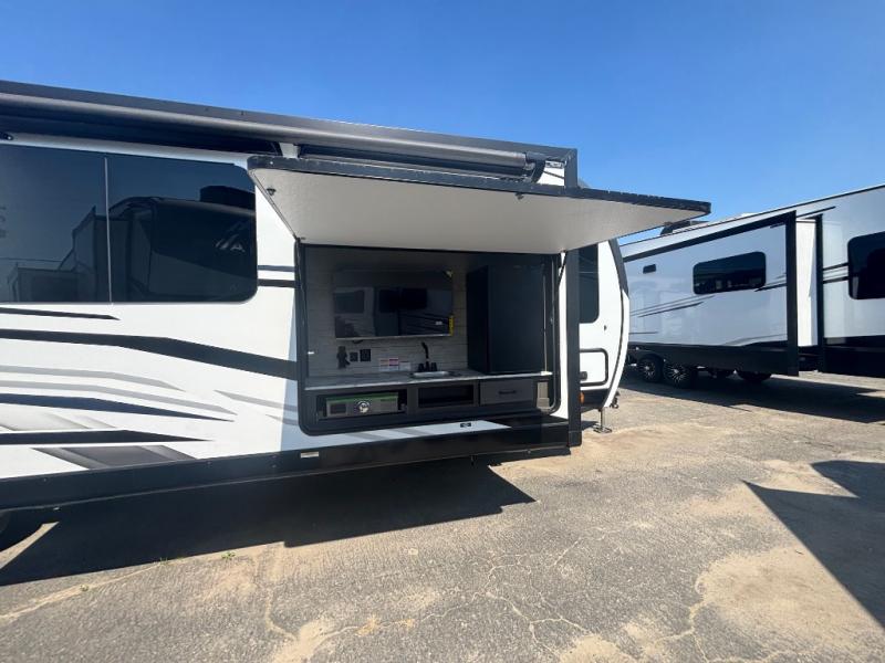 Come see all that this travel trailer has to offer! Relax in true comfort in the front living area with a 70" tri-fold sofa with end tables on either side or in the theater seating across from the entertainment center with a TV and 30" frameless fireplace. The kitchen island will make your meal prepping easier and you can enjoy them at the table and chairs then play a card game or two. You could even cook your meals at the exterior campfire café with a refrigerator, a sink with countertop space, and a griddle. The full bathroom has a 30" x 36" shower for you to freshen up in each morning. Enjoy a good night's rest each night on the 70" x 80" sleep tight king bed slide across from a dresser with a 30" frameless fireplace in the rear private bedroom, plus there is a wardrobe with washer and dryer prep and one of the dual entry doors with triple pull-out aluminum steps!