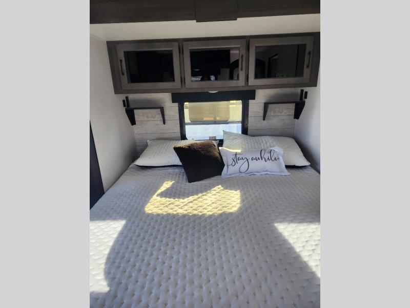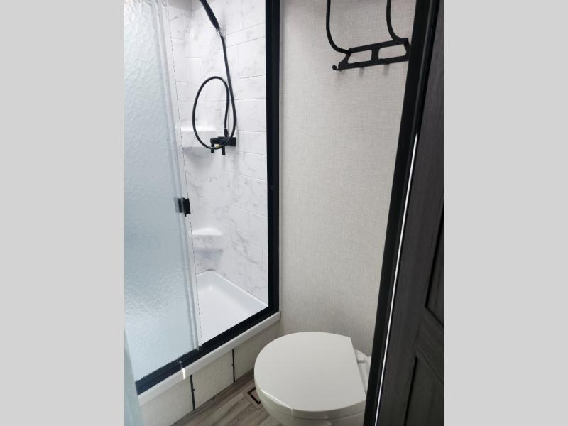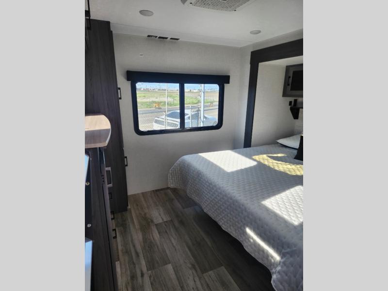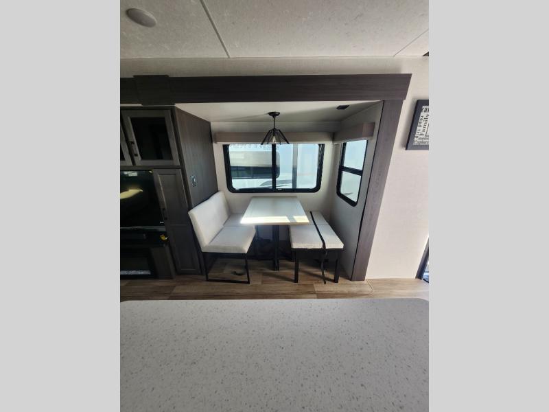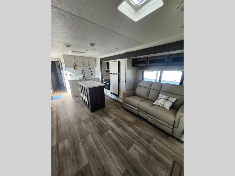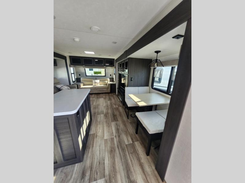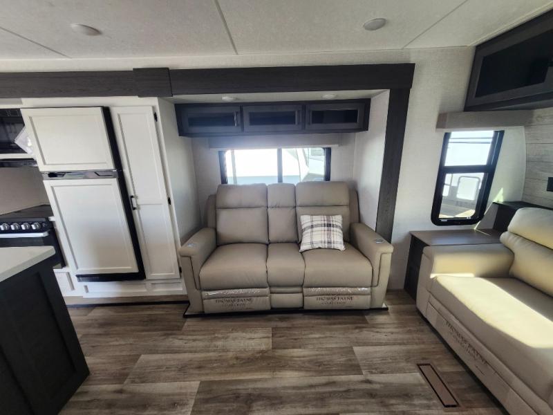 Come see all that this travel trailer has to offer! Relax in true comfort in the front living area with a 70" tri-fold sofa with end tables on either side or in the theater seating across from the entertainment center with a TV and 30" frameless fireplace. The kitchen island will make your meal prepping easier and you can enjoy them at the table and chairs then play a card game or two. You could even cook your meals at the exterior campfire café with a refrigerator, a sink with countertop space, and a griddle. The full bathroom has a 30" x 36" shower for you to freshen up in each morning. Enjoy a good night's rest each night on the 70" x 80" sleep tight king bed slide across from a dresser with a 30" frameless fireplace in the rear private bedroom, plus there is a wardrobe with washer and dryer prep and one of the dual entry doors with triple pull-out aluminum steps!