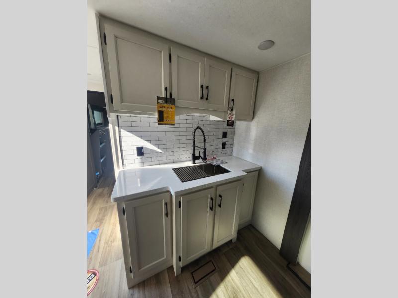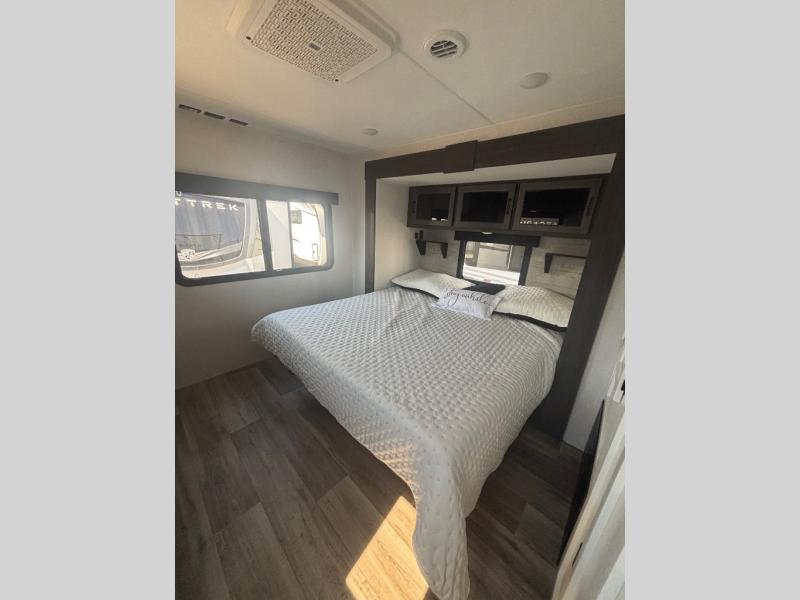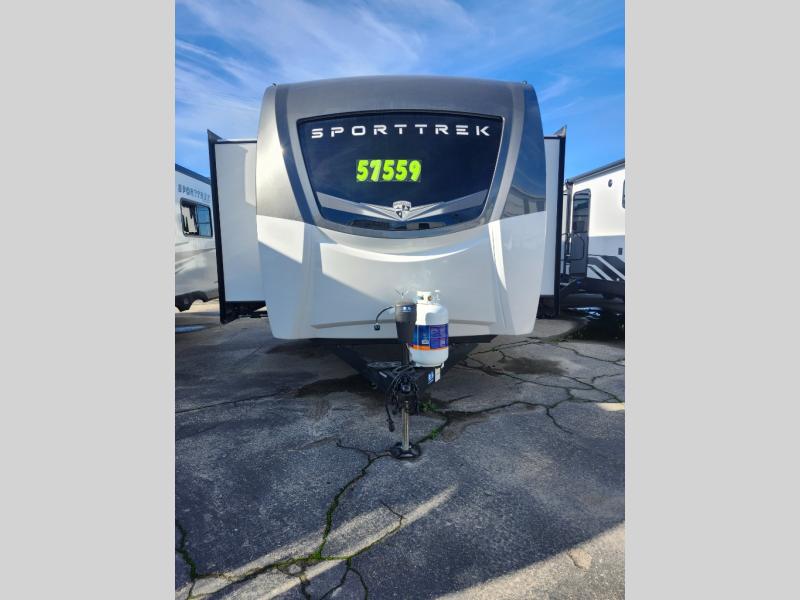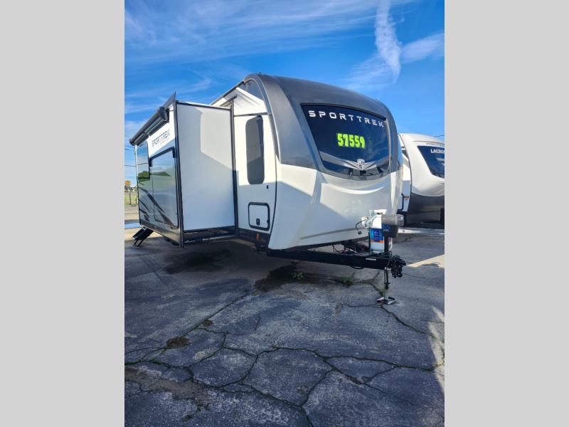 An elegant design and new features come with every one of these Venture RV SportTrek Touring Edition travel trailers! The NXG Huck bolt frame holds these units together and a walkable roof covers them. Heads will turn down the highway and at the campsite with an upgraded graphics package and a painted fiberglass front cap with integrated LED light. The exterior pass-through storage area has slam latch baggage doors with magnetic catches so you don't have to worry about them closing on you and a motion activated light to see your items clearly even at night. Luxury abounds throughout these units, especially with the mandatory Interior Luxury package which comes with solid surface kitchen countertops, designer valances with fabric nightshades, two 30" frameless fireplaces, and Beauflor wood plank flooring that is easy to clean. Come find your favorite model today!