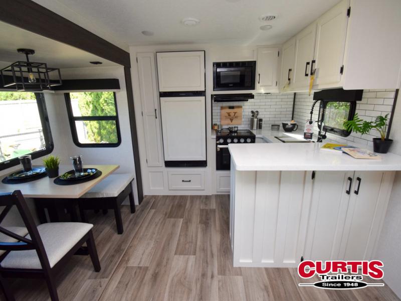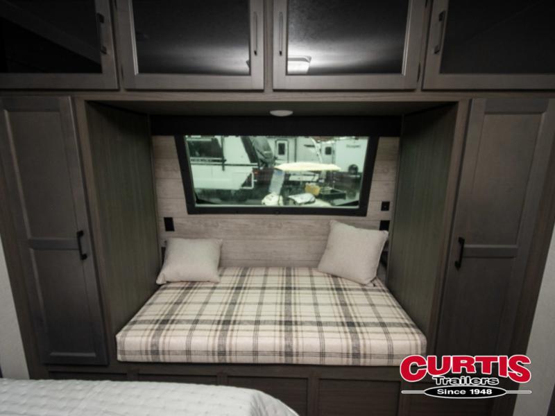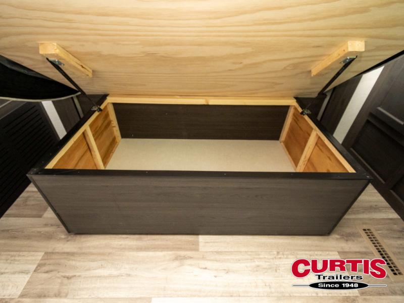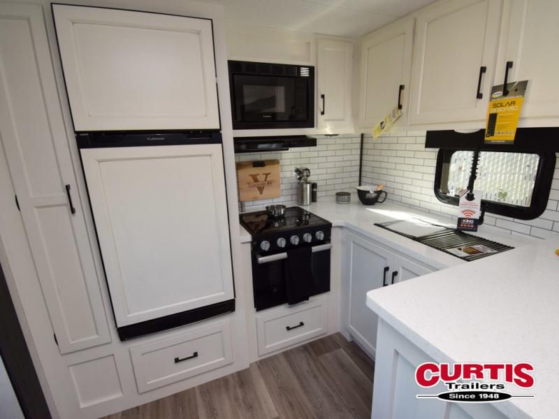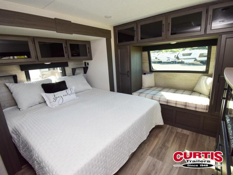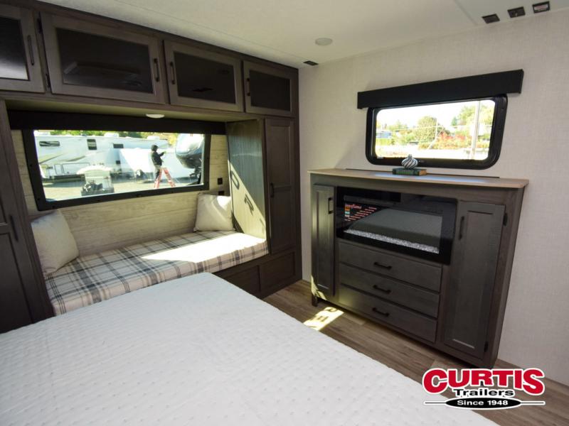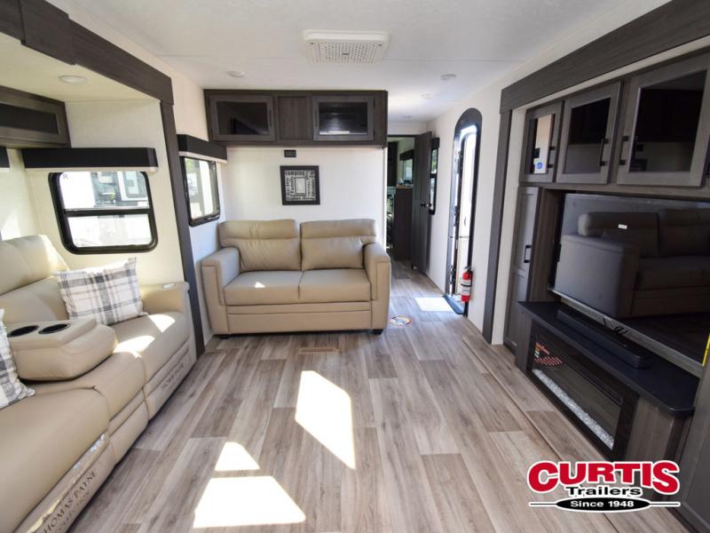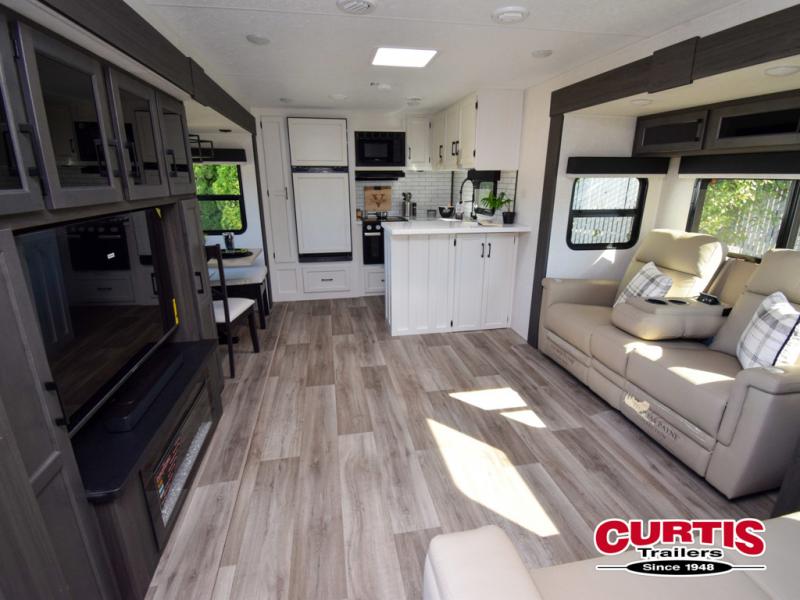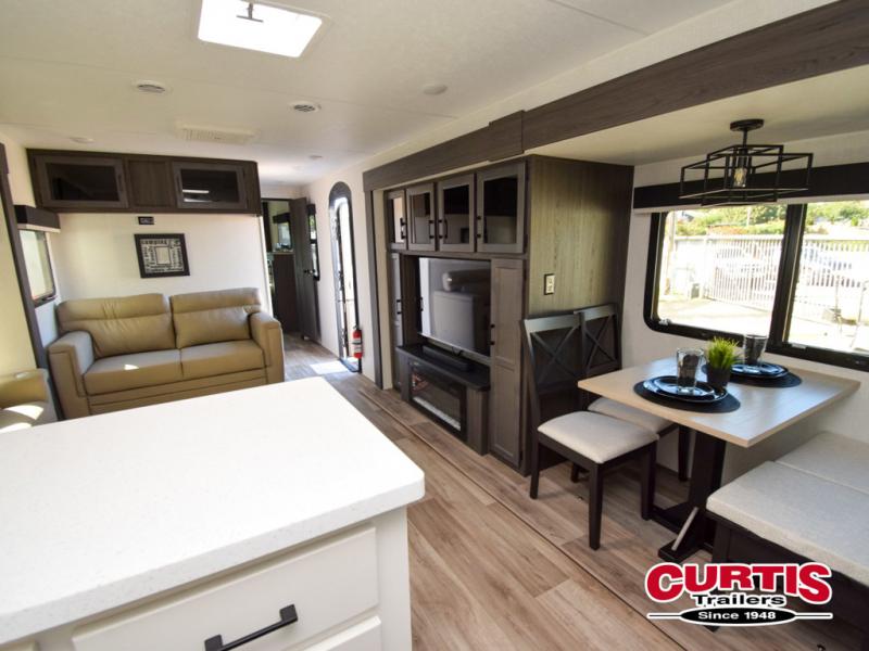 The chef will feel right at home cooking in the rear kitchen with all of the countertop space in this travel trailer! They can even head outside to breathe in some fresh air while cooking at the exterior campfire café with a refrigerator, a sink with countertop space, and a griddle. Relax each night in the middle living area with the 64" sofa and the slide that has theater seating with USB charging across from the entertainment center with a TV and 30" frameless fireplace. When you're ready to wind down your nights, take a hot shower in the full bathroom with the 30" x 36" shower then head to the front private bedroom and either read a book at the window seat or lay in the 70" x 80" sleep tight king bed slide while watching a movie with the TV or watch the 30" frameless fireplace!