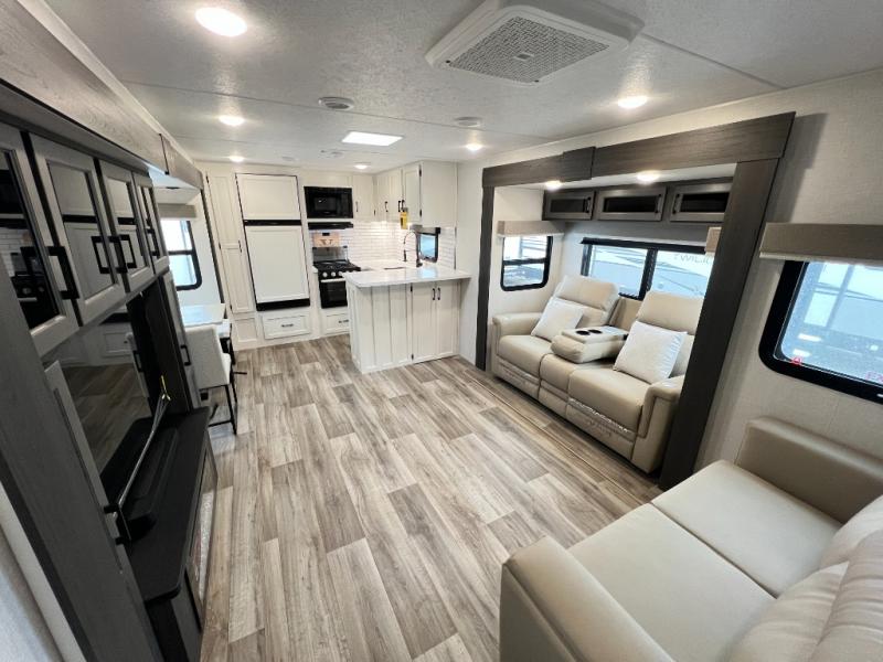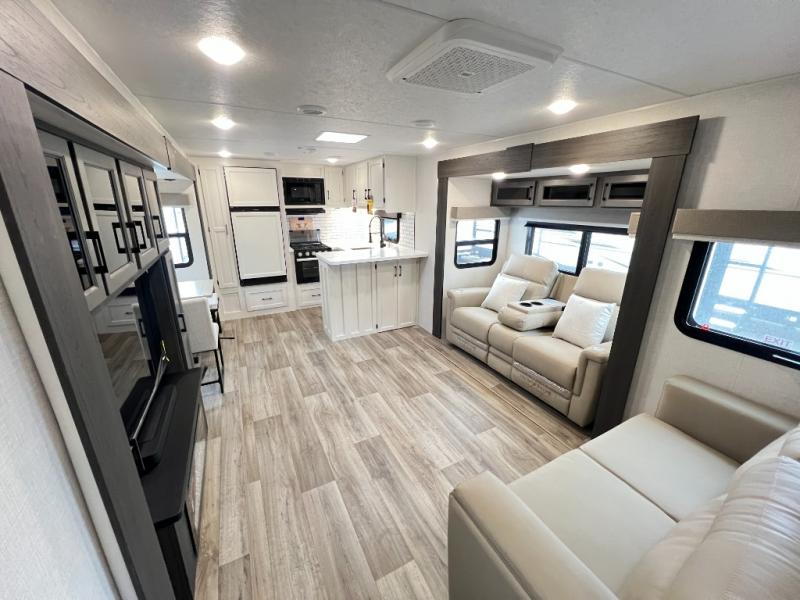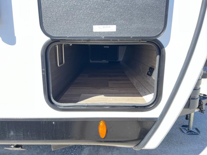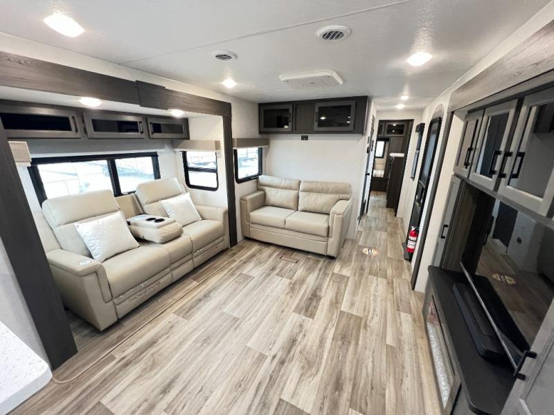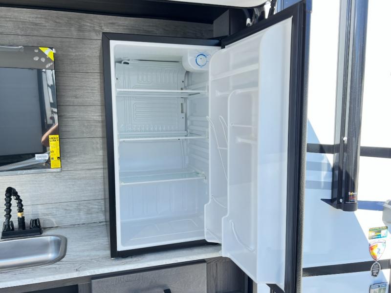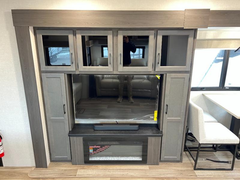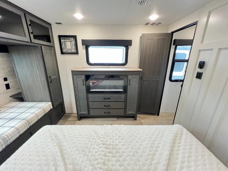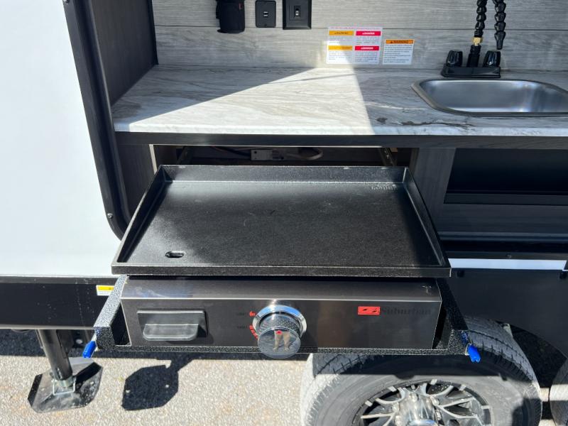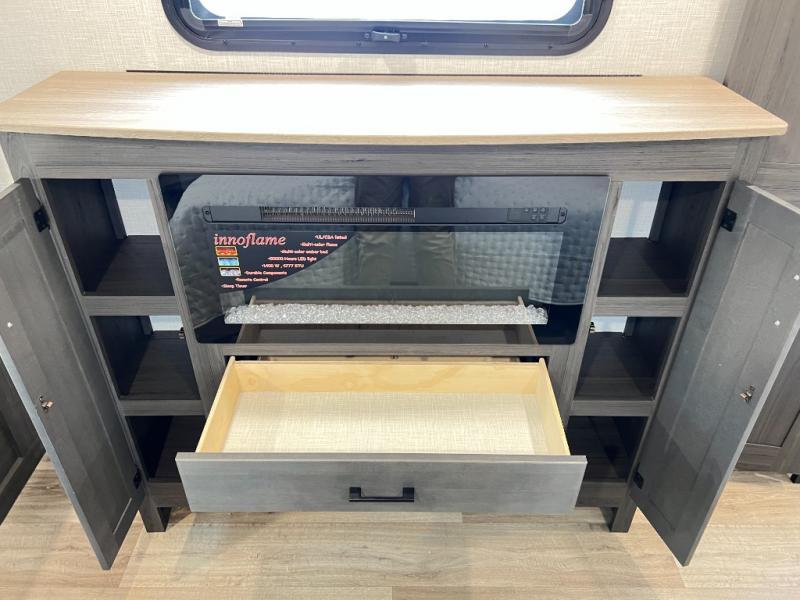The chef will feel right at home cooking in the rear kitchen with all of the countertop space in this travel trailer! They can even head outside to breathe in some fresh air while cooking at the exterior campfire café with a refrigerator, a sink with countertop space, and a griddle. Relax each night in the middle living area with the 64" sofa and the slide that has theater seating with USB charging across from the entertainment center with a TV and 30" frameless fireplace. When you're ready to wind down your nights, take a hot shower in the full bathroom with the 30" x 36" shower then head to the front private bedroom and either read a book at the window seat or lay in the 70" x 80" sleep tight king bed slide while watching a movie with the TV or watch the 30" frameless fireplace!