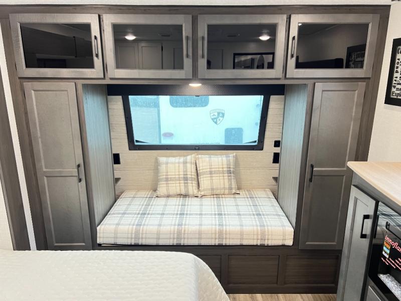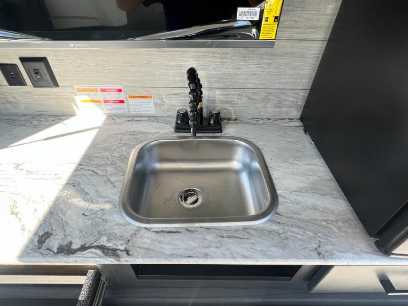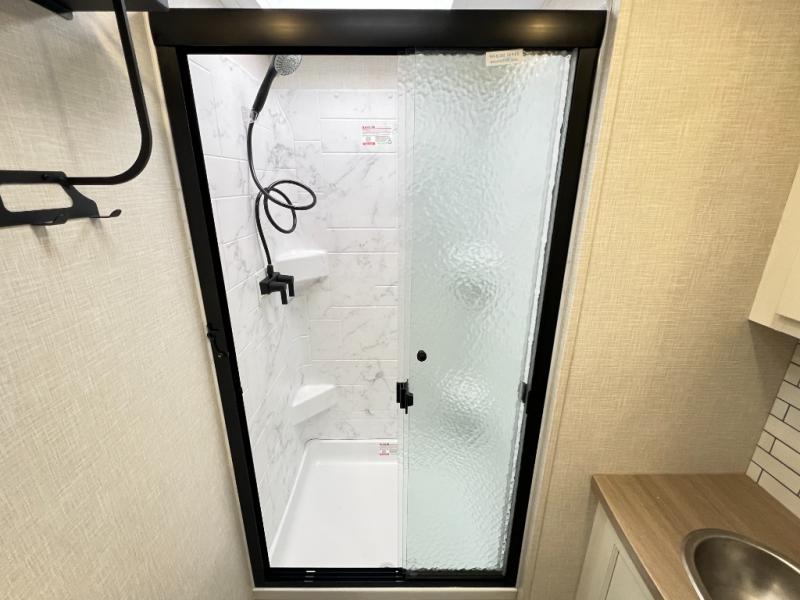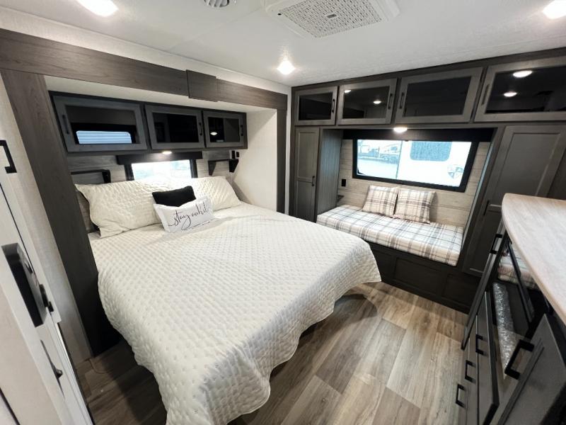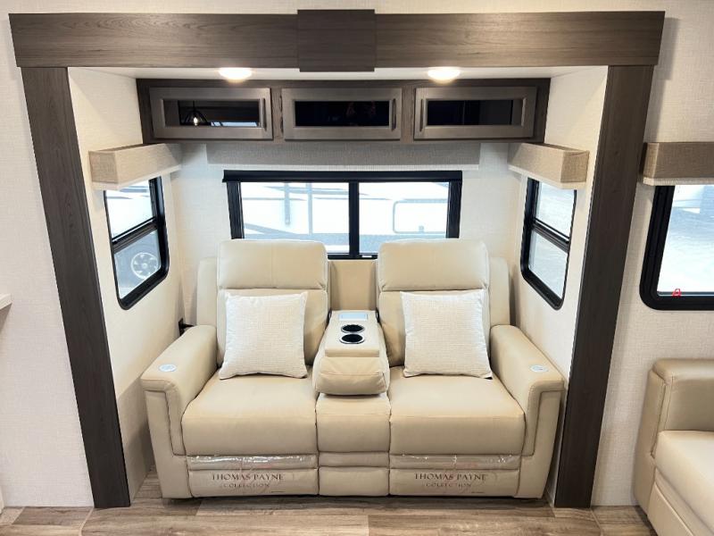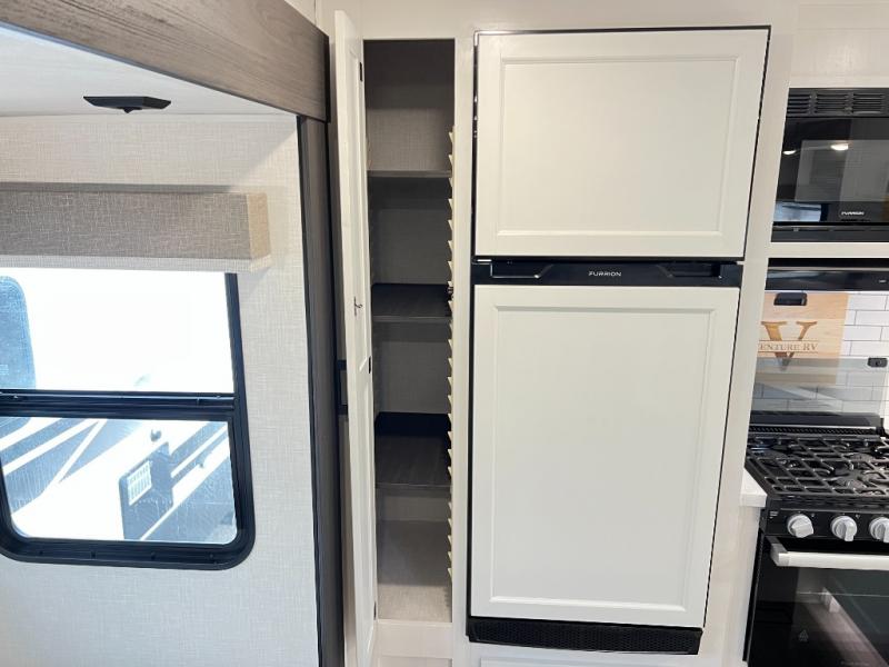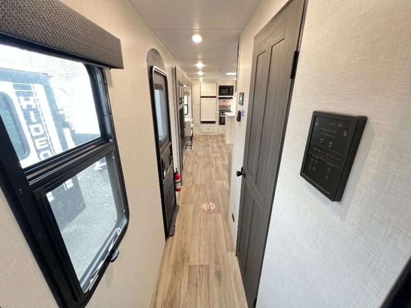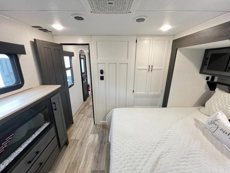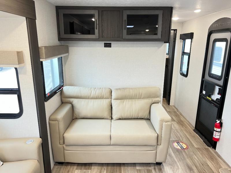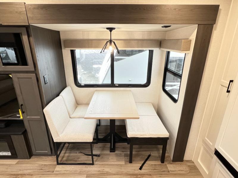 The chef will feel right at home cooking in the rear kitchen with all of the countertop space in this travel trailer! They can even head outside to breathe in some fresh air while cooking at the exterior campfire café with a refrigerator, a sink with countertop space, and a griddle. Relax each night in the middle living area with the 64" sofa and the slide that has theater seating with USB charging across from the entertainment center with a TV and 30" frameless fireplace. When you're ready to wind down your nights, take a hot shower in the full bathroom with the 30" x 36" shower then head to the front private bedroom and either read a book at the window seat or lay in the 70" x 80" sleep tight king bed slide while watching a movie with the TV or watch the 30" frameless fireplace!